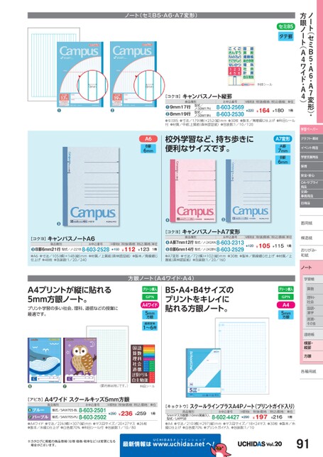 ノート(セミB5・A6・A7変形)・方眼ノート(A4ワイド・A4)学習ペーパークラフト・素材イベント用品学習支援用品保育安全・安心OA・サプライ用品文具・事務用品日用品画用紙用模造紙模造紙おりがみ・おりがみ・和紙和紙ノートセミB5タテ罫科目シールM価税抜税抜価格税込価格単位¥220¥164¥1801冊ノート(セミB5・A6・A7変形)9mm8mm[コクヨ]キャンパスノート縦罫商品種別9mm17行8mm19行型式/ノ-30M17N型式/ノ-30M19Nお申込番号8-603-25698-603-2530●●●●●セミB5●寸法/179(横)×252(縦)mm●30枚●製本/無線綴じ仕上げ●科目シール付●材質/中紙:上質紙(森林認証紙)●包装数:1/10/120A6B罫6mm校外学習など、持ち歩きに便利なサイズです。A7変形A罫7mmB罫6mm●●●M価税抜税抜価格税込価格単位¥120¥105¥1151冊商品種別お申込番号A罫7mm12行型式/ノ-242AN8-603-2313B罫6mm14行型式/ノ-242BN8-603-2529●●[コクヨ]キャンパスノートA7変形●A7変形●寸法/72(横)×102縦)mm●30枚●製本/無線綴じ仕上げ●材質/上質紙(森林認証紙)●包装数:1/20/160[コクヨ]キャンパスノートA6商品種別B罫6mm21行型式/ノ-221B8-603-2528●●A6●寸法/105(横)×148(縦)mm●材質/上質紙(森林認証紙)●製本/無線綴じ仕上げ●48枚●包装数:1/20/240¥123M価税抜税抜価格税込価格単位¥1501冊¥112お申込番号A4プリントが縦に貼れる5mm方眼ノート。プリント学習の多い社会、理科、道徳などの授業に最適です。方眼ノート(A4ワイド・A4)B5・A4・B4サイズのプリントをキレイに貼れる方眼ノート。A4ワイド5mm方眼適用学年1〜6年●●(罫内容は同じです。)科目シールA45mm方眼学習帳習帳学習算数理科・社会国語・漢字英習・その他連絡帳絡帳横罫・縦罫方眼各種用紙種●A4ワイド●寸法/226(横)×307(縦)mm●マス目サイズ/20×27マス●26枚●製本/糸綴じ仕上げ●白色度70%●科目シール付●包装数:1/10/80●A4●寸法/210(横)×297(縦)mm●マス目サイズ/18×24マス●30枚●製本/糸綴じ仕上げ●白色度70%●プリントガイド入●包装数:1/10※カタログに掲載の商品情報(仕様・価格・税率など)は変更になる場合がございます。最新情報はUCHIDASww.uchidas.netwへ!Vol.2091単位1冊[キョクトウ]スクールラインプラスA4Pノート(プリントガイド入り)商品種別5mmマス方眼罫(10mm実線入)、型式/LAPP5Bお申込番号8-602-4427M価税抜¥290税抜価格¥197税込価格¥216単位1冊[アピカ]A4ワイドスクールキッズ5mm方眼商品種別お申込番号M価税抜税抜価格税込価格¥290¥236¥259型式/SAW705-BL8-603-2501型式/SAW705-PU8-603-2502ブルーパープル●●