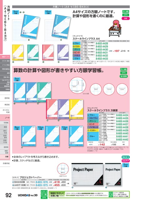 5mm方眼●●〜10mm方眼方眼ノート(A4・セミB5・B4ヨコ)A4サイズの方眼ノートです。計算や図形を書くのに最適。A4M価税抜税抜価格税込価格単位¥290¥197¥2161冊お申込番号8-602-44288-602-44298-602-44308-602-44318-602-44328-602-4433商品種別型式/LAP5Y5mm方眼罫(10mm実線入)、型式/LAP5Bブルーイエロー5mm方眼罫(10mm実線入)、グリーン5mm方眼罫(10mm実線入)、ピンクバイオレット5mm方眼罫(10mm実線入)、ブルー10mm方眼罫、型式/LAP5G5mm方眼罫(10mm実線入)、型式/LAP5P型式/LAP5V型式/LAP10B●●●●●●[キョクトウ]スクールラインプラスA4●●●●●●●A4●寸法/210横)×297縦)mm●マス目サイズ/18×26マス●30枚●製本/糸綴じ仕上げ●白色度70%●包装数:1/10算数の計算や図形が書きやすい方眼学習帳。セミB58mm10mm12mm10mm5mm方眼10mm5mm5mm5mm方眼●●●[キョクトウ]スクールラインプラス方眼罫商品種別5mm方眼罫(10mm実線入)、型式/LSP5B5mm方眼罫(10mm実線入)、型式/LSP5SB5mm方眼罫(10mm実線入)、型式/LSP5G5mm方眼罫(10mm実線入)、型式/LSP5Pブルースカイブルーグリーンピンクバイオレット5mm方眼罫(10mm実線入)、イエロー型式/LSP5V5mm方眼罫(10mm実線入)、型式/LSP5Y8mm方眼罫、型式/LSP8B10mm方眼罫、型式/LSP10B12mm方眼罫、型式/LSP12Bブルーお申込番号8-602-44348-602-44358-602-44368-602-44378-602-44388-602-44398-602-44408-602-44418-602-4442M価税抜¥210税抜価格¥142税込価格¥156単位1冊●●●●●●●●●●●●8mm方眼10mm方眼12mm方眼●●●●セミB5●寸法/179(横)×252縦)mm●マス目サイズ/15×22マス●30枚●製本/糸綴じ仕上げ●白色度/70%●包装数:1/10●全体のレイアウトを考えながら書き込めます。●計算、スケッチなどに最適。B4ヨコA4タテ5mm方眼⓰⓱5mm実物大方眼の大きさM価税抜¥580¥630税抜価格¥419¥455税込価格単位¥460¥5001冊商品種別お申込番号型式/PPB45S8-603-1076B4ヨコ50枚A4タテ100枚型式/PPA45S8-603-1075⓰⓱[オキナ]プロジェクトペーパー●5mm方眼●無塩素漂白紙●白色度81%●余白なし●包装数:1/592Vol.20地球にやさしくお買い物このマークのついた商品は地球環境保護に配慮された商品です。グリーンの文字で商品の判別をしやすくしました。どうぞご利用ください。エコマーク認定品グリーン購入法適合品GPNエコ商品ねっと掲載方眼ノート(A4・セミB5・B4ヨコ)学習ペーパークラフト・素材イベント用品学習支援用品保育安全・安心OA・サプライ用品文具・事務用品日用品画用紙画用紙模造紙模造紙おりがみ・おりがみ・和紙和紙ノート学習帳学帳算数算理科・社会国語・漢字英習・その他その他連絡帳連帳横罫・横・縦罫縦罫方眼各種用紙各種用