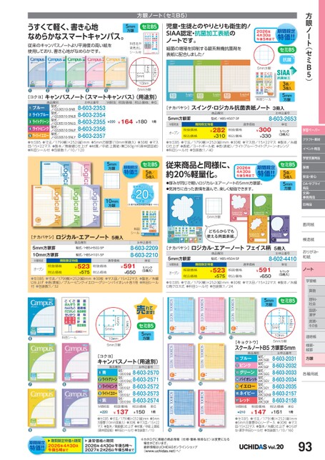 学習ペーパークラフト・素材イベント用品学習支援用品保育安全・安心OA・サプライ用品文具・事務用品日用品画用紙用模造紙模造紙おりがみ・おりがみ・和紙和紙ノート学習帳習帳学習算数理科・社会国語・漢字英習・その他連絡帳絡帳横罫・罫・縦罫縦罫方眼各種用紙種方眼ノート(セミB5)セミB5抗菌3色/3冊入5mm方眼児童・生徒とのやりとりも衛生的!SIAA認定・抗菌加工表紙のノートです。細菌の増殖を抑制する銀系無機抗菌剤を表紙に配合しました!2026年4月30日午後5時5mm方眼科目シールセミB510mm5mm5mm10mm5mm方眼科目名や背見出しシール付方眼ノート(セミB5)うすくて軽く、書き心地なめらかなスマートキャンパス。5mm方眼従来のキャンパスノートより平滑度の高い紙を使用しており、書き心地がなめらかです。●●●●[コクヨ]キャンパスノート〈スマートキャンパス〉(用途別)M価税抜税抜価格税込価格単位ブルーライトブルーライトグリーンライトピンクライトイエロー商品種別型式/ノ-GS30S10-5NB型式/ノ-GS30S10-5NLB型式/ノ-GS30S10-5NLG型式/ノ-GS30S10-5NLP型式/ノ-GS30S10-5NLYお申込番号8-603-23538-603-23548-603-23558-603-23568-603-2357¥220¥164¥1801冊5mm方眼罫[ナカバヤシ]スイング・ロジカル抗菌表紙ノート3冊入商品種別型式/HB5-H507-3Pお申込番号8-603-2653M価税抜オープン期間限定特価¥282¥310税抜価格税込価格通常価格¥300¥330単位1パック(3冊入)税抜価格税込価格セミB5●寸法/179(横)×252(縦)mm●5mm方眼罫(10mm実線入)●30枚●マス目/15×22マス●製本/無線綴じ仕上げ●材質/中紙:上質紙・薄口60g/㎡(森林認証紙)●科目シール付●包装数:1/10/120●セミB5●寸法/179横)×252(縦)mm●30枚●マス目/15×22マス●製本/糸綴じ仕上げ●表紙/コートボール紙●色(表紙)/ライトブルー・ライトグリーン・オレンジ●科目シール付●包装数:1/40●●●●●●●セミB55色/5冊入5mm方眼10mm方眼従来商品と同様に、約20%軽量化。2026年4月30日午後5時●厚みが同じで軽いロジカル・エアーノートの5mm方眼罫。●気持ちに合った表情を選んで、楽しく勉強できます。セミB55色/5冊入5mm方眼科目シール5mm方眼どちらからでも使える両面表紙。[ナカバヤシ]ロジカル・エアーノート5冊入5mm方眼罫10mm方眼罫商品種別型式/HB5-H502-5P型式/HB5-H101-5Pお申込番号8-603-22098-603-2210M価税抜オープン期間限定特価¥523¥575通常価格税抜価格税込価格¥591¥650単位1パック(5冊入)税抜価格税込価格●セミB5●寸法/179横)×252縦)mm●30枚●マス目/15×22マス●製本/糸綴じ仕上げ●色(表紙)/ブルー・ピンク・イエロー・グリーン・バイオレット各1冊●科目シール付●包装数:1/32[ナカバヤシ]ロジカル・エアーノートフェイス柄5冊入5mm方眼罫商品種別型式/HB5-H504-5Pお申込番号8-602-4410M価税抜オープン期間限定特価¥523¥575通常価格税抜価格税込価格¥591¥650単位1パック(5冊入)税抜価格税込価格●セミB5●寸法/179横)×252(縦)mm●30枚●マス目/15×22マス●製本/糸綴じ背クロス式●科目シール付●包装数:1/245mm方眼セミB510mm5mm5mm10mm●[キョクトウ]スクールノートB5方眼罫5mm5mm方眼商品種別型式/LMC5GB型式/LMC5GP型式/LMC5GGブルーピンクグリーンバイオレット型式/イエローネイビーレッドLMC5GV型式/LMC5GY型式/LMC5GNB型式/LMC5GRお申込番号8-603-20318-603-20328-603-20338-603-20348-603-20358-603-21578-603-2158●●●●●●●●●[コクヨ]キャンパスノート(用途別)商品種別お申込番号型式/ノ-30S10-5NB型式/青ライトグリーンライトピンク型式/ライトイエロー紫8-603-2570ノ-30S10-5NLG8-603-25718-603-25728-603-25738-603-2574ノ-30S10-5LP型式/ノ-30S10-5LY型式/ノ-30S10-5NV●●●●●●●セミB55mm方眼10mm5mm5mm10mm5mm方眼M価税抜¥220税抜価格¥137税込価格¥150単位1冊M価税抜¥210税抜価格¥147税込価格¥161単位1冊●セミB5●寸法/179(横)×252縦)mm●5mm方眼罫(10mm実線入)●30枚●マス目/15×22マス●製本/無線綴じ仕上げ●材質/中紙:上質紙(森林認証紙)●科目シール付●包装数:1/10●●●セミB5●寸法/179横)×252縦)mm●5mm方眼罫中心リーダー入●30枚●マス目/15×22マス●製本/糸綴じ仕上げ●ひらがな・漢字・科目シール付●包装数:1/10/160●●●科目シール●●Vol.2093※カタログに掲載の商品情報(仕様・価格・税率など)は変更になる場合がございます。最新情報はUCHIDASオンラインショップ(www.uchidas.net)へ!通常価格の期間2026年4月30日午後5時〜2027年2月26日午後5時期間限定特価の期間2026年4月30日午後5時