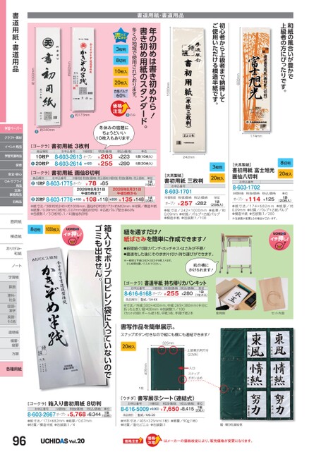 [ゴークラ]書初用紙画仙8切判商品種別❷10枚P8-603-1775オープンお申込番号M価税抜税抜価格税込価格M価税抜税抜価格税込価格¥78¥852026年8月31日午後5時まで2026年8月31日午後5時から❸20枚P8-603-1776¥180¥108¥118¥200¥135¥148(20枚入)●紙寸法/3枚判:約240×約1000mm、画仙8切判:約173×約682mm●材質/模造半紙●紙厚/0.09mm(3枚判)、0.07mm(画仙8切判)●古紙パルプ配合率60%●包装数:1/33枚判)、1/4画仙8切判)1袋[大髙製紙]書初用紙三枚判単位1袋(10枚入)お申込番号8-603-1701M価税抜オープン税抜価格¥257税込価格¥282単位1袋(20枚入)●紙寸法/242×1000mm●紙厚/約0.09mm●材質/パルプ+古紙パルプ●模造半紙●包装数:1/100[大髙製紙]書初用紙富士旭光画仙八切判お申込番号8-603-1702M価税抜オープン税抜価格¥114税込価格¥125単位1袋(20枚入)●紙寸法/174×682mm●紙厚/約0.09mm●材質/パルプ+古紙パルプ●模造半紙●包装数:1/200※包装数が変更となる場合がございます。●寸法/外紙:300×400mm、中紙:269×380mm(半分に折ったとき)、紐:400mm●包装数:1/100〈セット内容〉ボール紙1枚、中紙3枚、手提げ紐2本使用例セット内容書写作品を簡単展示。スナップボタン付きなので縦にも横にも連結できます!上部掲示用穴付(2カ所)入口スナップボタン止め20枚入325mm405mm1枚[ウチダ]書写展示シート(連結式)お申込番号8-616-5009¥9,000¥7,650¥8,415M価税抜税抜価格税込価格単位1組(20枚入)商品種別型式/MS-20紐を通すだけ!紙ばさみを簡単に作成できます!●新聞紙・穴開けパンチ・ホッチキス・はさみが不要!●書道をした後にそのまま片付け・持ち運びができます。※一般的な半紙(242×333)が6枚入ります。少し時間を置いて入れてください。机の横にかけられます![ゴークラ]書道半紙持ち帰りカバンキットお申込番号M価税抜税抜価格8-616-6168オープン¥255税込価格¥280単位1袋(1セット入)商品種別型式/SH-KK箱入りでポリプロピレン袋に入っていないのでゴミも出ません。8切判1000枚入[ゴークラ]箱入り書初用紙8切判お申込番号8-603-2667オープン¥5,768¥6,344M価税抜税抜価格税込価格単位1箱(1000枚入)●紙寸法/173×682mm●紙厚/0.07mm●材質/模造半紙●包装数:1/4●外形寸法/405×325mm(1枚)●質量/90g1枚)●材質/塩化ビニル●包装数:1縦・横9枚連結例96Vol.20はメーカーの価格改定により、販売価格が変更になります。書道用紙・書道用品1000mm年の初めは書き初めから!書き初め用紙のスタンダード。約173mm●●のみ多くの地域で使用されております。3枚判8切判10枚入20枚入古紙パルプ60%約682mm約1000mm約240mm●冬休みの宿題にちょうどいい10枚入もあります。[ゴークラ]書初用紙3枚判商品種別10枚P20枚Pお申込番号M価税抜8-603-2613オープン8-603-2614¥420税抜価格¥203¥255税込価格¥223¥280単位1袋(10枚入)1袋(20枚入)242mm保育❶和紙の風合いが豊かで上級者の方にぴったりです。8切判20枚入174mm682mm初心者から上級者まで納得してご使用いただける模造半紙です。3枚判20枚入書道用紙・書道用品学習ペーパークラフト・素材イベント用品学習支援用品安全・安心OA・サプライ用品文具・事務用品日用品画用紙画用紙模造紙模造紙おりがみ・おりがみ・和紙和紙ノートノート学習帳学帳算数算理科・社会国語・漢字英習・その他その他連絡帳連帳横罫・横・縦罫縦罫方眼眼各種用紙