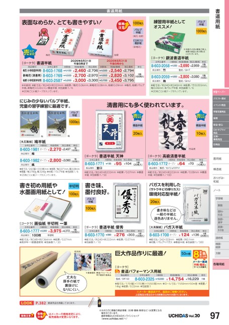 書道用紙練習用半紙としてオススメ!パルプ半紙1000枚入表面なめらか、とても書きやすい!1000枚入書道用紙パルプ半紙(梅花、桔梗)にじみにくい模造半紙(新梅花)竹梅花桔梗[ゴークラ]商品種別書道半紙お申込番号M価税抜梅花(小学校低学年用)8-603-1768¥4,100新梅花(清書用)8-603-1769¥4,500桔梗(小学校高学年用)8-603-2587¥5,2002026年8月31日午後5時まで税抜価格税込価格¥2,460¥2,706¥2,700¥2,970¥3,000¥3,3002026年8月31日午後5時から税抜価格¥2,540¥2,794¥2,820¥3,102¥3,450¥3,795M価税抜¥4,500¥4,950¥5,700税込価格単位1箱(1000枚入)※半紙の寸法は製造工程上、実際の商品と多少異なることがございます。[ゴークラ]お申込番号銀波書道半紙M価税抜税抜価格税込価格8-603-2058¥4,350¥2,690¥2,959単位1箱(1000枚入)商品種別型式/GH-T8-603-2059¥4,850¥2,800¥3,0801箱(1000枚入)商品種別型式/GH-U竹梅●半紙判●紙寸法/約240×約333mm●紙厚/梅花:0.06mm、新梅花:0.08mm、桔梗:0.09mm●梅花、桔梗:パルプ半紙、新梅花:にじみにくい模造半紙●包装数:1/6※20枚ごとに紙テープが入っています。●紙寸法/約240×約340mm●紙厚/竹:0.055mm、梅:0.06mm●パルプ半紙●包装数:1/6※20枚ごとに紙テープが入っています。にじみの少ないパルプ半紙、児童の習字練習に最適です。清書用にも多く使われています。パルプ半紙1000枚入梅楓[丸石製紙]鳩半紙お申込番号M価税抜税抜価格税込価格8-603-1981オープン¥2,270¥2,497単位1箱(1000枚入)商品種別商品種別梅楓8-603-1982オープン¥2,800¥3,0801箱(1000枚入)●紙寸法/242(幅)×333奥)mm●紙厚/梅:0.071mm、楓:0.08mm●質量/梅:2780g、楓:3240g●材質/パルプ半紙●包装数:1/6※20枚ごとに紙テープが入っています。模造半紙20枚入税込価格¥104単位1袋(20枚入)模造半紙10枚入作品例税込価格¥70単位1袋(10枚入)[ゴークラ]高級清書半紙お申込番号M価税抜8-603-1772オープン税抜価格¥64商品種別型式/セイショ10マイ[ゴークラ]書道半紙天神お申込番号8-603-1771M価税抜¥135税抜価格¥95商品種別並口●紙寸法/約240×約333mm●紙厚/0.07mm●模造半紙●包装数:1/50●紙寸法/約240×約333mm●紙厚/0.08mm●模造半紙●包装数:1/100書き初め用紙や水墨画用紙として!半切判100枚入書き味、墨付良好。パルプ半紙100枚入[ゴークラ]画仙紙半切判一筆お申込番号M価税抜8-603-1777¥5,300税抜価格税込価格¥3,975¥4,372単位1箱(100枚入)商品種別100枚半切判[ゴークラ]書道半紙優秀お申込番号8-603-1770M価税抜¥390税抜価格¥276税込価格¥303単位1袋(100枚入)バガスを利用した(サトウキビの搾りカス)環境対応型半紙!20枚入書き味などは一般の半紙と遜色ありません。[大髙製紙]バガス半紙お申込番号M価税抜8-603-1700オープン税抜価格¥124税込価格¥136単位1袋(20枚入)●紙寸法/約348×約1364mm●紙厚/0.07mm●高学年・一般書道家用●包装数:1/20●紙寸法/約240×約333mm●紙厚/0.07mm●包装数:1/10●紙寸法/242×333mm●紙厚/約0.1mm●材質/パルプ+バガス●模造半紙●包装数:1/300使用例巨大作品作りに最適!50m巻学習ペーパークラフト・素材イベント用品学習支援用品保育安全・安心OA・サプライ用品文具・事務用品日用品画用紙用模造紙模造紙おりがみ・おりがみ・和紙和紙ノートノート学習帳習帳学習算数理科・社会国語・漢字英習・その他連絡帳絡帳横罫・罫・縦罫縦罫方眼眼※画像提供:書道パフォーマンス甲子園実行委員会丈夫な厚手の紙で裏抜けになりにくい。[ゴークラ]書道パフォーマンス用紙商品種別型式/SPF-50お申込番号M価税抜8-603-2325¥16,000沖縄・離島はサービス対象外各種用紙税抜価格¥14,754税込価格¥16,229単位1本●箱寸法/170幅)×170(奥)×1550(高)mm●ロール寸法/1550mm×50m巻●質量/14kg●紙厚/0.22mm●包装数:1※メーカー直送品です。返品はご容赦ください。上記商品は受注日から8営業日以内のお届けになります。LOOKP.382書道用品を掲載しております。はメーカーの価格改定により、販売価格が変更になります。※カタログに掲載の商品情報(仕様・価格・税率など)は変更になる場合がございます。最新情報はUCHIDASオンラインショップ(www.uchidas.net)へ!Vol.2097
