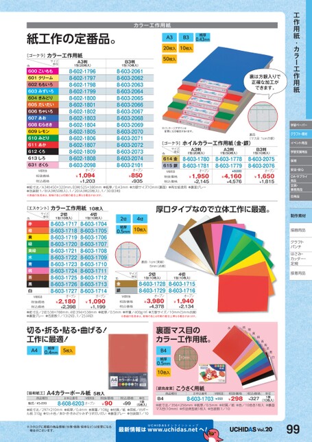 工作用紙·カラー工作用紙学習ペーパークラフト・素材イベント用品学習支援用品保育安全・安心OA・サプライ用品文具・事務用品日用品制作素材描画用品描画用品クラフトクラフトパンチパンチはさみ・さみ・カッター・カッター・定規定規接着用品着[ゴークラ]ホイルカラー工作用紙(金・銀)裏面(マス目:1cm方眼)B3判1包(10枚入)8-603-20758-603-2076オープン¥1,650¥1,815A3判1包(50枚入)8-603-17788-603-1779¥8,000¥4,160¥4,576税抜価格税込価格¥1,950¥2,145●紙寸法/A3判:450×320mm、B3判:525×380mm●紙厚/0.43mm●方眼サイズ10mm(裏面)●再生紙使用●裏面グレー●包装数:1/8A3判50枚入)、1/20A3判20枚入)、1/30B3判)※表組の色見本は、実物の色とは印刷の都合上異なる場合があります。税抜価格税込価格¥1,094¥1,203¥850¥935[エスケント]カラー工作用紙10枚入サイズ単位色赤橙黄緑黄緑水青桃茶黒白M価税抜税抜価格税込価格2切1包(10枚入)8-603-17178-603-17188-603-17198-603-17208-603-17218-603-17228-603-17238-603-17248-603-17258-603-17268-603-1727オープン¥2,180¥2,3984切1包(10枚入)8-603-17048-603-17058-603-17068-603-17078-603-17088-603-17098-603-17108-603-17118-603-17128-603-17138-603-1714オープン¥1,090¥1,199厚口タイプなので立体工作に最適。2切紙厚0.5mm4切10枚入裏面:1cm(実線)5mm(点線)サイズ単位色金銀M価税抜税抜価格税込価格2切1包(10枚入)8-603-17288-603-1729オープン¥3,980¥4,3784切1包(10枚入)8-603-17158-603-1716オープン¥1,940¥2,134●紙寸法/2切:538×788mm、4切:394×538mm●紙厚/0.5mm●坪量/400g/㎡●方眼サイズ/10mm(5mm点線)●裏面グレー●包装数:1/132切)、1/25(4切)※表組の色見本は、実物の色とは印刷の都合上異なる場合があります。切る・折る・貼る・曲げる!工作に最適!A4紙厚0.4mm5枚入裏面マス目のカラー工作用紙。赤桃橙黄10mmB4紙厚0.5mm10色入緑青紫茶黒白[協和紙工]A4カラーボール紙5枚入商品種別型式/45-099お申込番号M価税抜8-608-6203オープン税抜価格¥90税込価格¥99単位1袋(5枚入)●紙寸法/297×210mm●紙厚/0.4mm●質量/108g●材質/紙●原紙/白ボール紙310g●セット色/あか・き・きみどり・みず・うすだいだい●裏面グレー●包装数:1/10[銀鳥産業]商品種別こうさく用紙お申込番号B4(10色入)●紙寸法/356×256mm●紙厚/0.5mm●材質/紙●色/10色各1枚入●裏面マス目(10mm)●作品例型紙1枚入●包装数:1/108-603-1703¥298税込価格¥327単位1冊税抜価格M価税抜¥350※カタログに掲載の商品情報(仕様・価格・税率など)は変更になる場合がございます。最新情報はUCHIDASww.uchidas.netwへ!Vol.2099カラー工作用紙紙工作の定番品。[ゴークラ]カラー工作用紙色サイズ単位600こいもも601クリーム602ももいろ603みずいろ604きみどり605だいだい606ちゃいろ607あお608むらさき609レモン610みどり611あか612くろ613しろ631さくらM価税抜A3判1包(20枚入)8-602-17968-602-17978-602-17988-602-17998-602-18008-602-18018-602-18028-602-18038-602-18048-602-18058-602-18068-602-18078-602-18098-602-18088-603-2098オープンB3判1包(10枚入)8-603-20618-603-20628-603-20638-603-20648-603-20658-603-20668-603-20678-603-20688-603-20698-603-20708-603-20718-603-20728-603-20738-603-20748-603-2101オープンA3B3紙厚0.43mm20枚入10枚入50枚入※パッケージデザインは変更になる場合があります。サイズ単位色614金615銀M価税抜A3判1包(20枚入)8-603-17808-603-1781オープン裏は方眼入りで正確な加工ができます。