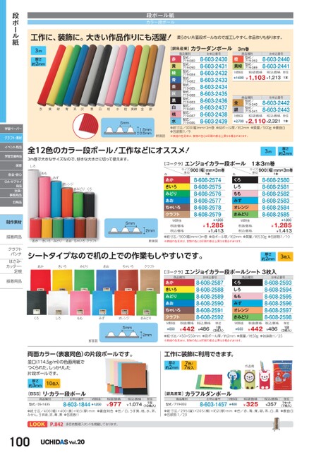 工作に、装飾に。大きい作品作りにも活躍!柔らかい片面段ボールなので加工しやすく、作品作りも捗ります。段ボール紙カラー段ボール3m厚さ約2mm赤黄緑青茶灰黒白桃水橙黄緑金銀5mm1.5mm0.5mm断面図[銀鳥産業]カラーダンボール3m巻単位1本お申込番号お申込番号M価税抜¥1,600税抜価格税込価格橙黄緑¥1,103¥1,2138-603-24408-603-2441商品種別型式/719-092型式/719-089商品種別型式/719-080型式/719-090型式/719-084型式/719-082型式/719-085型式/719-088型式/719-083型式/719-081型式/719-087型式/719-0868-603-24308-603-24318-603-24328-603-24338-603-24348-603-24358-603-24368-603-24378-603-24388-603-2439赤黄緑青茶灰黒白桃水●紙寸法/900幅)mm×3m巻●段ボール厚/約2mm●質量/500g●裏面白●包装数:1/9※表組の色見本は、実物の色とは印刷の都合上異なる場合があります。¥2,700¥2,110¥2,321商品種別型式/719-040型式/719-0418-603-24428-603-2443M価税抜税抜価格税込価格お申込番号単位1本金銀全12色のカラー段ボール!工作などにオススメ!3m巻で大きなサイズなので、好きな大きさに切って使えます。保育しろ[ゴークラ]エンジョイカラー段ボール1本3m巻サイズ単位900(幅)mm×3m巻1本サイズ単位900(幅)mm×3m巻1本3m厚さ約2mm8-608-25808-608-25818-608-25828-608-25838-608-25848-608-2585¥1,900¥1,285¥1,413ももみずオレンジきみどりくろ色あかきいろみどりあおちゃいろクラフトあかきいろみどりあおちゃいろクラフト5mm2mm断面図M価税抜税抜価格税込価格8-608-25748-608-25758-608-25768-608-25778-608-25788-608-2579¥1,900¥1,285¥1,413色くろしろももみずオレンジきみどりM価税抜税抜価格税込価格●紙寸法/900幅)mm×3m巻●段ボール厚/約2mm●質量/約530g●包装数:1/10※表組の色見本は、実物の色とは印刷の都合上異なる場合があります。シートタイプなので机の上での作業もしやすいです。厚さ約2mm3枚入あかきいろみどりあおちゃいろクラフトくろしろももみずオレンジきみどり[ゴークラ]エンジョイカラー段ボールシート3枚入商品種別あかきいろみどりあおちゃいろクラフトお申込番号8-608-25878-608-25888-608-25898-608-25908-608-25918-608-2592商品種別くろしろももみずオレンジきみどりお申込番号8-608-25938-608-25948-608-25958-608-25968-608-25978-608-25985mm2mmM価税抜¥650税抜価格¥442税込価格¥486単位1袋(3枚入)M価税抜¥650税抜価格¥442税込価格¥486単位1袋(3枚入)●紙寸法/450×550mm●段ボール厚/約2mm●質量/約50g●包装数:1/25※表組の色見本は、実物の色とは印刷の都合上異なる場合があります。断面図両面カラー(表裏同色)の片段ボールです。並口(114.5g/㎡)の色画用紙でつくられた、しっかりした片段ボールです。厚さ約3mm10色入工作に装飾に利用できます。厚さ約2mm7色/7枚入作品例[BSS]リ・カラー段ボール商品種別型式/05-1435お申込番号M価税抜8-603-1844¥1,250税抜価格¥977税込価格¥1,074単位1包(10色入)●紙寸法/400(幅)×400(奥)×約3(厚)mm●裏面同色●色/白、うす黄、桃、水、茶、みかん、うす緑、赤、青、黒●包装数:1P.842多目的整理スタンドを掲載しております。100Vol.20[銀鳥産業]カラフルダンボール商品種別型式/719-002お申込番号8-603-1457M価税抜¥400税抜価格¥325税込価格¥357単位1セット(7枚入)●紙寸法/295(縦)×205(横)×約2(厚)mm●色/赤、青、黄、緑、茶、白、黒●裏面白●包装数:1/20段ボール紙学習ペーパークラフト・素材イベント用品学習支援用品安全・安心OA・サプライ用品文具・事務用品日用品制作素材描画用品描画用品クラフトクラフトパンチパンチはさみ・はさみカッター・カッター・定規定規接着用品接着用