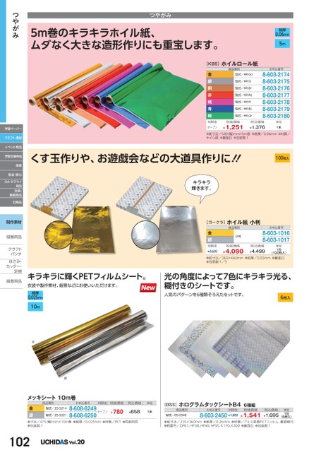 つやがみ5m巻のキラキラホイル紙、ムダなく大きな造形作りにも重宝します。[KBS]ホイルロール紙商品種別金銀銅赤桃青緑型式/HR-Go型式/HR-Si型式/HR-Br型式/HR-Re型式/HR-Pi型式/HR-BL型式/HR-Gr紙厚0.06mm5mお申込番号8-603-21748-603-21758-603-21768-603-21778-603-21788-603-21798-603-2180税抜価格¥1,251M価税抜オープン●紙寸法/540(幅)mm×5m巻●紙厚/0.06mm●材質/ホイル紙●裏面白●包装数:1税込価格¥1,376単位1本くす玉作りや、お遊戯会などの大道具作りに!!100枚入キラキラ輝きます。[ゴークラ]ホイル紙小判商品種別小判金銀お申込番号8-603-10168-603-1017M価税抜¥6,500税抜価格¥4,090税込価格¥4,499(100枚入)●紙寸法/360×460mm●紙厚/0.05mm●裏面白●包装数:1/5単位1包光の角度によって7色にキラキラ光る、糊付きのシートです。人気のパターンを6種類そろえたセットです。つやがみ学習ペーパークラフト・素材イベント用品学習支援用品保育安全・安心OA・サプライ用品文具・事務用品日用品制作素材描画用品描画用品クラフトクラフトパンチパンチはさみ・はさみカッター・カッター・定規定規接着用品接着用キラキラに輝くPETフィルムシート。P衣装や製作素材、背景などにお使いいただけます。紙厚0.025mm10m金銀メッキシート10m巻商品種別お申込番号M価税抜税抜価格税込価格型式/25-5214金銀●寸法/475(幅)mm×10m巻●紙厚/0.025mm●材質/PET●両面同色●包装数:18-608-6249オープン8-608-6250¥780型式/25-5221¥858単位1本102Vol.206枚入税込価格¥1,695単位1包(6枚入)[BSS]ホログラムタックシートB46種組商品種別型式/05-0348お申込番号M価税抜8-603-2450¥1,800税抜価格¥1,541●紙寸法/255×360mm●紙厚/0.26mm●材質/アルミ蒸着PETフィルム、裏面糊付●柄番号/DP01、HP38、HP49、HP95、K170、K309●裏面白●包装数:1