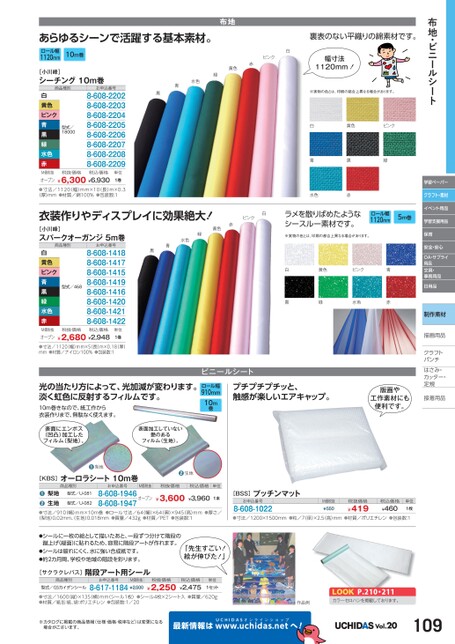 布地・ビニールシート学習ペーパークラフト・素材イベント用品学習支援用品保育安全・安心OA・サプライ用品文具・事務用品日用品制作素材描画用品描画用品クラフトクラフトパンチパンチはさみ・さみ・カッター・カッター・定規定規接着用品着ロール幅1120mm10m巻[小川峰]シーチング10m巻商品種別型式/18000お申込番号8-608-22028-608-22038-608-22048-608-22058-608-22068-608-22078-608-22088-608-2209白黄色ピンク青黒緑水色赤M価税抜白黄色ピンク青黒緑水色赤M価税抜税抜価格税込価格オープン¥6,300¥6,930単位1巻●寸法/1120(幅)mm×10(長)m×0.3(厚)mm●材質/綿100%●包装数:1衣装作りやディスプレイに効果絶大![小川峰]スパークオーガンジ5m巻商品種別黄色緑水色青黒型式/468お申込番号8-608-14188-608-14178-608-14158-608-14198-608-14168-608-14208-608-14218-608-1422※実物の色とは、印刷の都合上異なる場合があります。白青水色黄色ピンク緑黒赤白ピンク赤ラメを散りばめたようなシースルー素材です。ロール幅1120mm5m巻※実物の色とは、印刷の都合上異なる場合があります。白黒黄色ピンク緑水色青赤あらゆるシーンで活躍する基本素材。裏表のない平織りの綿素材です。布地白ピンク幅寸法1120mm!赤黄色緑水色青黒税抜価格税込価格オープン¥2,680¥2,948単位1巻●寸法/1120(幅)mm×5(長)m×0.18(厚)mm●材質/ナイロン100%●包装数:1ビニールシート光の当たり方によって、光加減が変わります。淡く虹色に反射するフィルムです。プチプチプチッと、触感が楽しいエアキャップ。ロール幅910mm10m巻版画や工作素材にも便利です。10m巻きなので、紙工作から衣装作りまで、無駄なく使えます。表面にエンボス(凹凸)加工したフィルム(梨地)。●梨地表面加工していない艶のあるフィルム(生地)。●シールに一枚の絵として描いたあと、一段ずつ分けて階段の蹴上げ(縦面)に貼れるため、容易に階段アートが作れます。●シールは破れにくく、水に強い合成紙です。●約2カ月間、学校や地域の階段を彩ります。[サクラクレパス]階段アート用シール「先生すごい!絵が伸びた!」商品種別型式/GSカイダンシールお申込番号M価税抜8-617-1184¥2,500税抜価格¥2,250税込価格¥2,475単位1セット●寸法/1600縦)×135(横)mm(シール1枚)●シール4枚×2シート入●質量/620g●材質/紙缶:紙、袋:ポリエチレン●包装数:1/20※カタログに掲載の商品情報(仕様・価格・税率など)は変更になる場合がございます。最新情報はUCHIDASww.uchidas.netw作品例へ!P.210・211カラーセロハンを掲載しております。Vol.20109[BSS]プッチンマットお申込番号8-608-1022M価税抜¥550税抜価格¥419税込価格¥460単位1枚●寸法/1200×1500mm●粒/7(径)×2.5(高)mm●材質/ポリエチレン●包装数:1●生地税抜価格税込価格単位¥3,600¥3,9601本お申込番号M価税抜8-608-1946オープン8-608-1947商品種別型式/U-081型式/U-082梨地生地●●[KBS]オーロラシート10m巻●寸法/910(幅)mm×10m巻●ロール寸法/64(幅)×64奥)×945(高)mm●厚さ/(梨地)0.02mm、生地)0.018mm●質量/432g●材質/PET●包装数:1