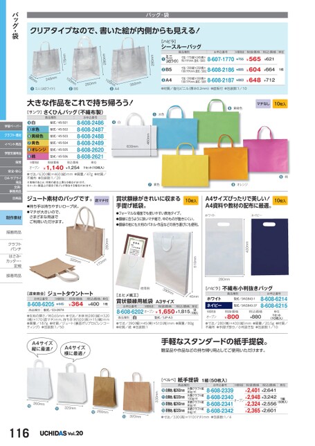 [ハピラ]シースルーバッグ●ミニ(A5ワイド)●B5●A4商品種別お申込番号M価税抜税抜価格税込価格単位寸法/175縦)×245横)×95マチ)mm、型式/SSB38-607-1770¥755寸法/290縦)×250横)×100(マチ)mm、型式/SSB28-608-2186¥805寸法/290縦)×350横)×100(マチ)mm、型式/SSB18-608-2187¥863¥565¥604¥648¥621¥6641枚¥712●材質/塩化ビニル(厚み0.2mm)●底板付●包装数:1/10●黄緑色マチなし10枚入290mm290mm175mmmm053●A4mm100m0m52mm100mm542mm95●ミニ(A5ワイド)●B5大きな作品をこれで持ち帰ろう![サンワ]さくひんバッグ(不織布製)●水色●白460mm630mmお申込番号8-608-24868-608-24878-608-24888-608-24898-608-26208-608-2621商品種別型式/45-501型式/45-502型式/45-503型式/45-504型式/45-505型式/45-506白水色黄緑色黄色オレンジ桃●●●●●●M価税抜オープン税抜価格税込価格¥1,140¥1,254単位1セット(10枚入)●寸法/630(横)×460縦)mm●質量/47g●材質/不織布●包装数:1/20※実物の色とは、印刷の都合上異なる場合があります。※メーカー製造上の都合で色ブレが発生する場合があります。●黄色●オレンジ●桃ジュート素材のバッグです。底マチ付●持ち手は持ちやすいロープ状。●マチが大きいので、さまざまな用途でご利用いただけます。賞状額縁がきれいに収まる手提げ紙袋。10枚入●フォーマルな場面でも使いやすい無地タイプ。●額縁に合うように狭いマチ幅で、中のものが動きにくい。●額縁の他にも大判のパネル・作品などの持ち運びにも便利。A4サイズぴったりで美しい!A4資料や教材の配布に最適。10枚入ホワイトネイビークリアタイプなので、書いた絵が内側からも見える!バッグ・袋バッグ・袋学習ペーパークラフト・素材イベント用品学習支援用品保育安全・安心OA・サプライ用品文具・事務用品日用品制作素材描画用品描画用品クラフトクラフトパンチパンチはさみ・はさみカッター・カッター・定規定規接着用品接着用手軽なスタンダードの紙手提袋。贈呈品や作品などの持ち帰り用としてご使用いただけます。単位1組(50枚入)M価税抜オープンお申込番号8-608-23398-608-23408-608-23418-608-2342税抜価格税込価格¥2,401¥2,641¥2,948¥3,242¥2,324¥2,556¥2,365¥2,601商品種別片艶クラフト紙80g/㎡片艶クラフト紙100g/㎡未晒クラフト紙80g/㎡未晒クラフト紙84g/㎡白無地、幅260mm白無地、幅320mm茶無地、幅260mm茶無地、幅320mm●●●●330mm[ベルベ]紙手提袋1組(50枚入)●寸法/330(高)×110(マチ)mm●包装数:1/4[ハピラ]不織布小判抜きバッグホワイトネイビー商品種別型式/SW2843-1型式/SW2843-37お申込番号8-608-62148-608-6215税抜価格¥800M価税抜オープン●寸法/280(横)×430(縦)mm●質量/20.5g●材質/不織布●手提げ部分/小判抜き型●包装数:1/10税込価格¥880(10枚入)1セット単位430mm280mm510mm45mm使用例390mm[エヒメ紙工]賞状額縁用紙袋A3サイズお申込番号M価税抜税抜価格税込価格8-608-6202オープン¥1,650¥1,815単位1袋(10枚入)商品種別白型式/SJP-A3●寸法/390(幅)×45(奥)×510(高)mm●質量/80g●材質/紙●包装数:1280mm320mmmm071[遠東商会]お申込番号8-608-6205ジュートタウントートM価税抜¥445税抜価格¥364税込価格¥400単位1枚商品種別型式/03-0974●生地の厚さ/約0.65mm●寸法/本体:約280縦)×320(横)×170底マチ)mm、持ち手:約500(長)×15(幅)mm●質量/187g●材質/ジュート(裏面ポリプロピレンコーティング)●包装数:1/50A4サイズ縦に最適!A4サイズ横に最適!260mm●●320mm●260mm●320mm116Vol.20