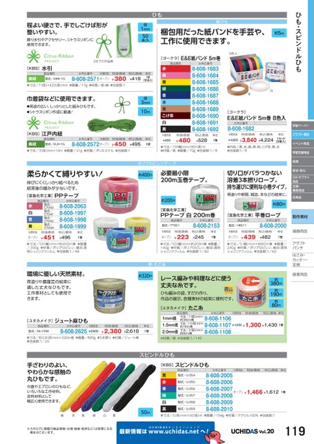 ひも・スピンドルひも学習ペーパークラフト・素材イベント用品学習支援用品保育安全・安心OA・サプライ用品文具・事務用品日用品制作素材描画用品描画用品クラフトクラフトパンチパンチはさみ・さみ・カッター・カッター・定規定規接着用品着8色入茶白[ゴークラ]E&E紙バンド5m巻8色入お申込番号8-608-1682M価税抜¥4,800税抜価格税込価格¥3,840¥4,224単位1セット(8巻入)●内容/青、赤、緑、黒、桃、こげ茶、黄、水●包装数:1/8切り口がバラつかない溶着3本撚りロープ。持ち運びに便利な小巻タイプ。荷造りや新聞、雑誌、本などの結束に。約80m[宮島化学工業]平巻ロープ程よい硬さで、手でしごけば形が整いやすい。飾り水引やアクセサリー、シトラスリボンに使用できます。径1mm50本入ひも紙ひも梱包用だった紙バンドを手芸や、工作に使用できます。約5m3本での作品例[KBS]水引商品種別黄緑●寸法/1(径)×420(長)mm●質量/17g●材質/紙・絹●包装数:18-608-2571オープン型式/MHK-YG¥380お申込番号M価税抜税抜価格税込価格¥418単位1袋(50本入)巾着袋などに使用できます。●用途の広い、しっかりとした組みひもです。●シトラスリボン作成に最適!径3mm10m[ゴークラ]E&E紙バンド5m巻商品種別赤桃黄緑青水茶こげ茶白黒お申込番号8-608-16838-608-16848-608-16858-608-16868-608-16878-608-16888-608-16898-608-16908-608-16918-608-1692[KBS]江戸内紐商品種別黄緑●寸法/3(径)mm×10m●質量/21g●材質/ポリエステル●包装数:18-608-2572オープン型式/EUH-YG¥450お申込番号M価税抜税抜価格税込価格¥495単位1袋税抜価格M価税抜¥600¥480税込価格¥528●寸法/19(幅)mm×約5(長)m●材質/紙●質量/70g●包装数:1/8単位1巻柔らかくて縛りやすい!伸びにくくしっかり結べるため結束後の緩みが少ないです。[宮島化学工業]PPテープ赤白青黄商品種別型式/CT043型式/CT041型式/CT042型式/CT044税抜価格お申込番号8-608-20638-608-19978-608-19988-608-1999¥451税込価格¥496M価税抜オープン●寸法/50(幅)mm×約400m巻●質量/300g●材質/ポリプロピレン、梱包:透明シュリンクフィルム●包装数:1/48単位1巻ポリプロピレンテープ約400m必要最小限200m玉巻テープ。約200m[宮島化学工業]PPテープ白200m巻商品種別型式/TT001お申込番号8-608-2153商品種別型式/HR011お申込番号8-608-2000M価税抜オープン税抜価格¥223税込価格¥245単位1巻M価税抜オープン税抜価格¥439税込価格¥482単位1巻●寸法/50(幅)mm×約200m巻●質量/140g●材質/ポリプロピレン、梱包:透明シュリンクフィルム●包装数:1/60●寸法/5(幅)mm×約80m巻●質量/240g●材質/ポリプロピレン、梱包:透明シュリンクフィルム●包装数:1/60環境に優しい天然素材。荷造りや農園芸の結束に適した丈夫なひもです。工作素材としても使用できます。麻・たこ糸約320mレース編みや料理などに使う丈夫な糸です。ひも編みの袋、すだれ作り、作品の展示、各種素材の結束に便利です。[ユタカメイク]ジュート麻ひも商品種別型式/06-1098お申込番号M価税抜8-608-2625¥2,900税抜価格¥2,380税込価格¥2,618単位1巻●寸法/約2.8径)mm×320m巻●質量/800g●5本撚り●材質/ジュート麻●包装数:1/20[ユタカメイク]商品種別たこ糸1mm径1.5mm径2.0mm径●材質/綿●包装数:1/140寸法/1(径)mm×約380m巻寸法/1.5(径)mm×約190m巻寸法/2(径)mm×約80m巻お申込番号8-608-11068-608-11078-608-1108M価税抜税抜価格税込価格単位¥1,630¥1,300¥1,4301巻約380m約190m約80mスピンドルひも手ざわりのよい、やわらかな感触の丸ひもです。巾着やエプロンのひもなど、いろいろな工作材料、衣料材料として幅広く使用できます。黄赤青緑白黒50m[KBS]スピンドルひも商品種別型式/U-054お申込番号M価税抜税抜価格税込価格型式/U-056型式/U-055黄赤青緑白黒●寸法/5(径)mm×50(長)m●質量/194g●材質/アクリル100%●包装数:18-608-20058-608-20068-608-20078-608-20088-608-20098-608-2010オープン¥1,466¥1,612型式/U-059型式/U-057型式/U-058単位1巻※カタログに掲載の商品情報(仕様・価格・税率など)は変更になる場合がございます。最新情報はUCHIDASww.uchidas.netwへ!Vol.20119