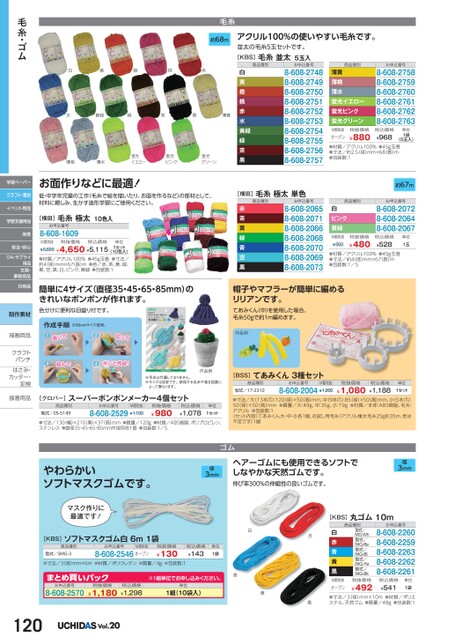 毛糸アクリル100%の使いやすい毛糸です。並太の毛糸5玉セットです。[KBS]毛糸並太5玉入商品種別お申込番号8-608-27488-608-27498-608-27508-608-27518-608-27528-608-27538-608-27548-608-27558-608-27568-608-2757お申込番号8-608-20658-608-20718-608-20668-608-20688-608-20708-608-20698-608-2073商品種別薄黄薄桃薄水蛍光イエロー蛍光ピンク蛍光グリーンお申込番号8-608-27588-608-27598-608-27608-608-27618-608-27628-608-2763税抜価格¥880税込価格¥968M価税抜オープン●材質/アクリル100%●45g玉巻●寸法/約2.5径)mm×68(長)m●包装数:1単位1袋(5玉入)約67mお申込番号8-608-20728-608-20648-608-2067商品種別白ピンク黄緑M価税抜¥560税抜価格¥480税込価格¥528単位1玉●材質/アクリル100%●45g玉巻●寸法/約4(径)mm×67長)m●包装数:1/5[横田]毛糸極太単色商品種別白黄橙桃赤水黄緑緑茶黒赤茶黄緑青空黒約68m白黄橙桃赤水黄緑緑茶黒薄黄薄桃薄水蛍光イエロー蛍光ピンク蛍光グリーンお面作りなどに最適!低・中学年児童の工作(毛糸で絵を描いたり、お面を作るなど)の部材として、材料に親しみ、生かす造形学習にご使用ください。[横田]毛糸極太10色入お申込番号8-608-1609M価税抜¥5,600税抜価格税込価格単位¥4,650¥5,115(10色入)●材質/アクリル100%●45g玉巻●寸法/約4(径)mm×67長)m●色/赤、茶、黄、緑、青、空、黒、白、ピンク、黄緑●包装数:11セット簡単に4サイズ(直径35・45・65・85mm)のきれいなポンポンが作れます。色分けに便利な目盛り付です。作成手順●巻いて※65mmサイズ使用。●切って●結んで●ポンと完成!作品例※毛糸は付属しておりません。※サイズは目安です。使用する毛糸や巻き回数によって異なります。[クロバー]スーパーポンポンメーカー4個セット商品種別型式/05-5149お申込番号M価税抜8-608-2529¥1,100税抜価格¥980税込価格¥1,078単位1セット●寸法/130(幅)×210奥)×37(高)mm●質量/120g●材質/ABS樹脂、ポリプロピレン、ステンレス●直径35・45・65・85mm作成用各1個●包装数:1/5毛糸・ゴム学習ペーパークラフト・素材イベント用品学習支援用品保育安全・安心OA・サプライ用品文具・事務用品日用品制作素材描画用品描画用品クラフトクラフトパンチパンチはさみ・はさみカッター・カッター・定規定規接着用品接着用帽子やマフラーが簡単に編めるリリアンです。てあみくん(中)を使用した場合、毛糸50gで約1m編めます。作品例[BSS]てあみくん3種セット商品種別型式/17-2310お申込番号M価税抜8-608-2004¥1,200税抜価格¥1,080税込価格¥1,188単位1セット●寸法/大(13本爪)120(径)×50(高)mm、中(9本爪)85(径)×50(高)mm、小(5本爪)50(径)×50(高)mm●質量/大:49g、中:35g、小:19g●材質/本体:ABS樹脂、毛糸:アクリル●包装数:1〈セット内容〉てあみくん大・中・小各1個、お試し用毛糸(アクリル極太毛糸25g約35m、色は不定です)1個ゴム径3mmヘアーゴムにも使用できるソフトでしなやかな天然ゴムです。伸び率300%の伸縮性の良いゴムです。径3mmやわらかいソフトマスクゴムです。マスク作りに最適です![KBS]ソフトマスクゴム白6m1袋商品種別型式/SMG-3お申込番号M価税抜8-608-2546オープン税抜価格¥130白税込価格¥143単位1袋●寸法/3(径)mm×6m●材質/ポリウレタン●質量/4g●包装数:1まとめ買いパック8-608-2570お申込番号¥1,180税抜価格※1組単位申込。青税込価格¥1,298単位1組(10袋入)黄120Vol.20赤黒[KBS]丸ゴム10m商品種別白赤青黄黒型式/MG-Wh型式/MG-Re型式/MG-Bl型式/MG-Ye型式/MG-Bkお申込番号8-608-22608-608-22598-608-22638-608-22628-608-2261税抜価格¥492M価税抜オープン●寸法/3(径)mm×10m●材質/ポリエステル、天然ゴム●質量/48g●包装数:1税込価格¥541単位1袋