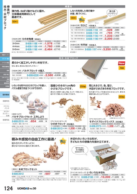 弾力性、ねばり強さなどに優れ、立体構成用素材として最適です。50本入棒素材しなりを利用した飛行機やお面、凧づくりに。100本入弾力性バツグン!竹平材税抜価格¥528¥704税込価格¥580¥774¥1,232¥1,355¥2,200¥2,420単位1組(100本入)竹ひご[川合木工所]竹ひご100本入商品種別お申込番号寸法/1.8(径)×約360長)mm8-608-11938-608-1194寸法/3(径)×約360(長)mm寸法/1.8(径)×約900長)mm8-608-1195¥1,4008-608-1196¥2,500寸法/3(径)×約900(長)mmM価税抜¥600¥800[川合木工所]ひのき角棒50本入商品種別お申込番号3×3mm4×4mm5×5mm●寸法/長さ約900mm●包装数:18-608-11888-608-11898-608-1190M価税抜¥1,800¥2,000¥2,800税抜価格税込価格¥1,576¥1,733¥1,760¥1,936¥2,464¥2,7101組(50本入)単位●包装数:1[川合木工所]竹平材100本入商品種別寸法/2×5×約900mm●包装数:1お申込番号M価税抜税抜価格税込価格8-608-1197¥3,700¥3,250¥3,575単位1組(100本入)枝木・木材ブロック柔らかく加工がしやすい木材です。切る、彫る、削るなど加工がしやすい!バルサブロック4個入[川合木工所]商品種別型式/08-5088お申込番号M価税抜8-608-6226¥2,800税抜価格¥2,580税込価格¥2,838(4個入)●寸法/約50(横)×50(高)×200(長)mm●質量/約125g(1個あたり)●材質/バルサ材●包装数:1単位1組50mm200mm4個組50mmいろいろな形や大きさのブロックを使い、パズル感覚で作品づくりができます。国産ひのきの1cm角の小さなブロックです。250個入同じ大きさで、色、堅さ、木目がさまざまの木材ブロックです。柔らかい材質で、組んだ後、カッターで削ったり、紙やすりで磨いたりが楽にできます。色の違うブロックを組み合わせることで、寄せ木模様を楽しむことができます。250個入作品例作品例作品例[木村バルサ]バルサブロックセット工作しようお申込番号8-608-2219M価税抜¥950税抜価格¥854税込価格¥939単位1袋商品種別型式/08-7110●質量/80g●材質/バルサ材、ラミン材●包装数:1/100〈セット内容〉バルサ材:5×5×50mm×40個、10×10×50mm×15個、10×25×50mm×5個、5×25×50mm×10個、10×25×25mm×5個、3×25×25mm×8個、5×25×25mm×5個、25×25×25mm×4個、5×25×98mm×2個、φ25×8mm×4個、ラミン材:φ3×70mm×2本[アイスタジオウッズ]ひのきブロック250個入お申込番号M価税抜税抜価格税込価格8-608-2013¥1,380¥1,208¥1,328(250個入)●寸法/10(幅)×10(奥)×10(高)mm(1個)●質量/250g●材質/国産ひのき材●包装数:1単位1袋[アイスタジオウッズ]モザイクブロックミックス250個入※樹種の組み合わせは不定です。お申込番号M価税抜税抜価格税込価格8-608-2375¥1,510¥1,338¥1,471単位1袋(250個入)商品種別型式/08-7102●寸法/約10縦)×10横)×10高)mm(1個)●質量/150g●材質/けやき、ぶな、花梨、杉、ひのき、ウォールナット、サペリ他●包装数:1積み木感覚の自由工作に最適!組み合わせしやすいように厚さは10mmに揃えてあります。作品例木切れのいろいろな形が、子どもたちの想像力を掻き立てます。形や大きさ、木の種類はさまざまです。棒素材・枝木・木材ブロック学習ペーパークラフト・素材イベント用品学習支援用品保育安全・安心OA・サプライ用品文具・事務用品日用品制作素材描画用品描画用品クラフトクラフトパンチパンチはさみ・はさみカッター・カッター・定規定規接着用品接着用[BSS]木材ブロックセットお申込番号8-608-2012M価税抜¥620税抜価格¥507税込価格¥557単位1袋●質量/250g●材質/朴、桂、ラワンなど●包装数:1〈セット内容〉四角形:10×10×20mm×10個、10×20×20mm×30個、10×40×20mm×40個、三角形:70(底辺)×35(高)×10mmの直角二等辺三角形×5個、円形:30(径)×10mm×4個124Vol.20※材木の種類や寸法、形状は不定です。また、質量は材木の内容により変動します。[アイスタジオウッズ]いろいろな木切れ商品種別型式/08-7120お申込番号M価税抜税抜価格8-608-2166¥11,600¥10,200¥11,220税込価格単位1箱●内容量/650(幅)×350(奥)×320(高)mmの段ボール箱1箱分●質量/約17kg●材質・形状/さまざまな形・種類の木材・しなベニヤなど●包装数:1