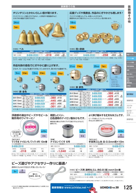 装飾類その他学習ペーパークラフト・素材イベント用品学習支援用品保育安全・安心OA・サプライ用品文具・事務用品日用品制作素材描画用品描画用品クラフトクラフトパンチパンチはさみ・さみ・カッター・カッター・定規定規接着用品着15mm18mm●外径9mm(小)13mm(中)14mm(大)21mm(特大)35mm(超特大)装飾類その他チリンチリンとかわいらしい音が鳴ります。クリスマスツリーの飾りだけではなく、人形制作や壁面製作など、さまざまな場面で活用できます。応援グッズや発表会、作品のにぎやかさも増します!クリスマスの飾りとしても、お使いいただけます。数個をまとめて鳴らすとシャンシャンとやさしい音が鳴ります。在庫無次第終了商品お申込番号M価税抜税抜価格8-608-2033オープン¥219税込価格¥240単位1袋商品種別型式/U-067在庫無次第終了商品お申込番号M価税抜税抜価格8-608-2032オープン¥258税込価格¥283単位1袋(5個入)●寸法/ベル:24(径)×31(高)mm、ひも通し穴:約4(径)mm、パッケージ:80×110×25mm●質量/26g●材質/スチール●色/金色●包装数:1(10個入)●寸法/鈴:18(径)×15高)mm、パッケージ:80×100×15mm●質量/30g●材質/スチール●色/金色●包装数:1在庫無次第終了商品M価税抜税抜価格税込価格¥380¥418¥429¥471¥450¥495¥240¥264¥360¥396単位1袋(30個入)1袋(10個入)1袋オープンお申込番号8-608-20268-608-20288-608-20308-608-20318-608-2451商品種別質量/27g、型式/U-063質量/23g、型式/U-061小(9mm)寸法/9(径)×10(高)mm、中(13mm)寸法/13径)×12(高)mm、大(14mm)寸法/14径)×13(高)mm、特大(21mm)超特大(35mm)質量/39g、型式/U-065寸法/21径)×19(高)mm、質量/31g、型式/U-066寸法/35径)×33(高)mm、質量/11.5g、型式/GS-35●●●●●(5個入)●ひも通し穴/小・中・大:約1.5径)mm、特大:約2(径)mm、超特大:約5径)mm●材質/スチール●包装数:1在庫無次第終了商品M価税抜税抜価格税込価格単位¥380¥418¥445¥489¥451¥496¥301¥3311袋(30個入)1袋(10個入)オープンお申込番号8-608-20258-608-20278-608-20298-608-2101商品種別質量/23g、型式/U-060小(9mm)寸法/9径)×10(高)mm、中(13mm)寸法/13(径)×12高)mm、大(14mm)寸法/14(径)×13高)mm、特大(21mm)寸法/21(径)×19高)mm、質量/27g、型式/U-062質量/39g、型式/U-064質量/31g、型式/U2-01●●●●●ひも通し穴/小・中・大:約1.5(径)mm、特大:約2径)mm●材質/スチール●包装数:1[KBS]鈴金色浮遊感の演出やビーズやモビール制作用のワイヤーに!視認しにくい、白色透明のナイロン製糸ひもです。模型飛行機などを吊り下げて展示するときなどに便利です。よく伸び縮みする丈夫な糸ゴムです。ビーズを使ってブレスレットなどを作るときに便利です。白色透明のナイロン製糸です。約10m4号[MIYUKI]てぐす糸ナイロンモノフィラ4号10m巻お申込番号8-608-2018M価税抜¥250税抜価格¥218税込価格¥239単位1巻●寸法/約0.33径)mm×約10m巻、パッケージ:45(径)×10(高)mm●質量/5g●材質/ナイロン●包装数:1/6約500m6号[高儀]ナイロンてぐす6号商品種別型式/05-5114お申込番号8-608-2535M価税抜¥1,300税抜価格¥1,040税込価格¥1,144単位1巻約10m径約0.5mm[MIYUKI]手芸用ゴム糸白0.5mm径×10m商品種別型式/19-7561M価税抜¥300税抜価格¥280お申込番号8-608-2374税込価格¥308単位1巻●寸法/約0.4(径)mm×約500m巻、パッケージ:70径)×60(高)mm●質量/138g●材質/糸:ナイロン、ボビン:ポリスチレン●包装数:1/120●寸法/0.5(径)mm×約10m巻、パッケージ:45径)×10(高)mm●質量/6g●材質/スパンデックスにテトロンウーリー巻き付け●包装数:1/6作品を鈴の音色でにぎやかに盛り上げます。ひもや、モールなどを通す穴があいていますので、取り付けも簡単です。9mm30個入13mm30個入14mm30個入●21mm10個入35mm5個入●●●●●●●[KBS]鈴銀色[KBS]四ッ割鈴18mm10個入31mm24mm24mm5個入[KBS]ベル商品種別型式/U-068ビーズ遊びやアクセサリー作りに最適!透明のゴムなので目立たず使い方いろいろ!3m径約0.8mm優れた耐候性、耐久性。※カタログに掲載の商品情報(仕様・価格・税率など)は変更になる場合がございます。最新情報は[KBS]ビーズ用透明丸ゴム約0.8(径)mm×3m巻商品種別型式/tg3mお申込番号M価税抜8-608-2185オープン税抜価格¥172税込価格¥189単位1袋●寸法/約0.8(径)mm×3m巻●質量/1.8g●材質/ゴム:ポリウレタン●取扱説明書入●包装数:1※元に戻ろうとする性質がありますので、結び目は2本揃えて8の字結びで、十分に結び目が小さくなる位しっかりと結んでください。UCHIDASww.uchidas.netwへ!Vol.20125