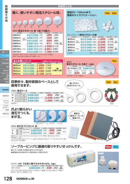 軽く、使いやすい発泡スチロール球。直径20〜100mmまで、豊富なサイズバリエーション。100個入50個入装飾類その他●●●●●●●[ホシノプレーン]発泡スチロール球商品種別径20mm径30mm径40mm径50mm径60mm●包装数:1穴径/約2mm穴なしお申込番号M価税抜8-615-0486¥2,0008-615-0487¥2,8008-615-0488¥5,6008-615-0489¥3,2008-615-0490¥4,300税抜価格¥1,800¥2,520¥5,040¥2,800¥3,870税込価格¥1,980¥2,772¥5,544¥3,080¥4,257単位1組(100個入)1組(50個入)※径20〜40mmのものは穴径約2mmの穴が貫通しています。[BSS]発泡スチロールたまご10個入商品種別E型、70×50mm穴径/2mmM価税抜¥1,100税抜価格¥820お申込番号8-608-1816税込価格¥902単位1組(10個入)●発泡倍率/55倍●包装数:1使いやすい発泡スチロール。中小大10個入70mmたまごE型10個入5個入作品例税抜価格税込価格単位お申込番号M価税抜¥330¥660¥4408-615-23808-608-18128-615-23818-608-18138-608-1814¥2,4008-608-1815¥4,5008-615-2382¥9,200¥840¥300¥352¥600¥671¥330¥387¥660¥738¥1,920¥2,112¥3,601¥3,961¥7,360¥8,0961袋(10個入)穴径/約2mm穴なし商品種別径20mm径30mm径40mm径50mm径80mm径100mm径125mm●●●●●●●[BSS]発泡スチロール球1袋(10個入)●発泡倍率/径20〜40mm=30倍、径50〜125mm=60倍●包装数:1※径20〜50mmのものは穴径約2mmの穴が貫通しています。商品種別お申込番号まとめ買いパック径20mm径30mm径40mm径50mm8-615-23838-615-23848-615-23858-615-2386※1組単位申込。税抜価格¥1,220¥1,627¥2,448¥3,106税込価格¥1,342¥1,789¥2,692¥3,416単位1組(10個入×5袋)四季折々、製作表現のベースとして使用できます。[KBS]発泡リース商品種別寸法/約70(外径)×約40(内径)×約12高)mm、質量/1g寸法/約120外径)×約80(内径)×約16高)mm、質量/3g寸法/約146外径)×約92(内径)×約20高)mm、質量/6g小中大●包装数:1お申込番号8-608-23038-608-23048-608-2305M価税抜オープン税抜価格¥905税込価格¥995¥2,000¥2,200¥1,095¥1,204単位1袋(10個入)1袋(5個入)爪より軟らかい滑石でつくる、まが玉。着色は蛍光マーカーが簡単です。形のカット成形[BSS]まが玉づくりセット白下描き(穴あけ)商品種別お申込番号寸法/150×100×14mm、質量/60g寸法/150×100×17mm、質量/90g税込価格¥308小¥381大●滑石寸法/小:35×35×12mm、大:35×50×15mm●材質/滑石、綿ろう引きひも●包装数:1/100〈セット内容〉滑石1個、サンドペーパー細目1枚・粗目2枚、耐水ペーパー1枚、ろう引きひも(長さ:約900mm)1本、説明書8-608-20228-608-2021¥280¥347M価税抜¥320税抜価格1セット¥400単位装飾類その他学習ペーパークラフト・素材イベント用品学習支援用品保育安全・安心OA・サプライ用品文具・事務用品日用品制作素材描画用品描画用品クラフトクラフトパンチパンチはさみ・はさみカッター・カッター・定規定規接着用品接着用ソープカービングに最適の彫りやすいせっけんです。●カッターや彫刻刀で簡単に彫ることができます。●透明感のある白色なので、彫刻の美しさが際立ちます。200g[エスケー石鹸]商品種別うるおい純マルセルせっけん2個入型式/06-0250お申込番号8-608-6224M価税抜¥500税抜価格¥420税込価格¥462単位1組(2個入)●寸法/約75(幅)×58奥)×43(高)mm(1個あたり)●質量/約200g1個あたり)●材質/純石けん●色/白●包装数:1/24128Vol.20