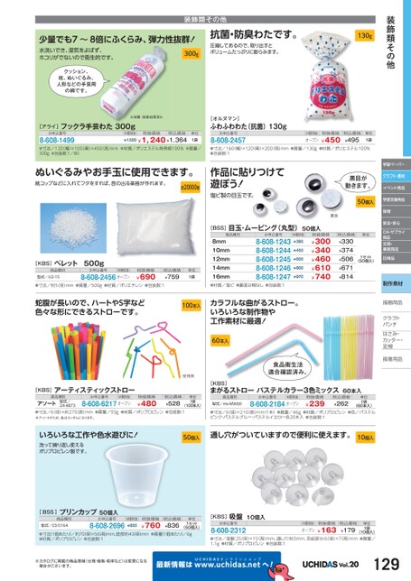 学習ペーパークラフト・素材イベント用品学習支援用品保育安全・安心OA・サプライ用品文具・事務用品1セット(50個入)日用品制作素材描画用品描画用品クラフトクラフトパンチパンチはさみ・さみ・カッター・カッター・定規定規接着用品着[BSS]目玉・ムービング(丸型)50個入商品種別お申込番号8mm10mm12mm14mm16mm●材質/塩ビ●裏面は糊なし●包装数:18-608-12438-608-12448-608-12458-608-12468-608-1247M価税抜¥390¥450¥600¥800¥970単位税抜価格¥300¥340¥460¥610¥740税込価格¥330¥374¥506¥671¥814100本入カラフルな曲がるストロー。いろいろな制作物や工作素材に最適!60本入使用例食品衛生法適合確認済み。装飾類その他130gM価税抜オープン税抜価格¥450税込価格¥495単位1袋装飾類その他少量でも7〜8倍にふくらみ、弾力性抜群!300g水洗いでき、湿気をよばず、ホコリがでないので衛生的です。抗菌・防臭わたです。圧縮してあるので、取り出すとボリュームたっぷりに膨らみます。クッション、枕、ぬいぐるみ、人形などの手芸用の綿です。※殺菌・除臭処理済み[アライ]フックラ手芸わた300gお申込番号8-608-1499M価税抜税抜価格¥1,500¥1,240¥1,364税込価格[オルヌマン]ふわふわわた(抗菌)130gお申込番号8-608-2457単位1袋●寸法/120(幅)×100(奥)×450(高)mm●材質/ポリエステル特殊綿100%●質量/300g●包装数:1/80●寸法/160幅)×120奥)×200高)mm●質量/130g●材質/ポリエステル100%●包装数:1ぬいぐるみやお手玉に使用できます。紙コップなどに入れてフタをすれば、音の出る楽器が作れます。約20000粒作品に貼りつけて遊ぼう!塩ビ製の目玉です。黒目が動きます。50個入裏面[KBS]ペレット500g商品種別型式/U2-15お申込番号M価税抜8-608-2456オープン税抜価格¥690税込価格¥759単位1袋●寸法/約5(径)mm●質量/500g●材質/ポリエチレン●包装数:1蛇腹が長いので、ハートやS字など色々な形にできるストローです。[KBS]アーティスティックストロー商品種別お申込番号M価税抜税抜価格型式/24-4873アソート●寸法/6(径)×約270(長)mm●質量/93g●材質/ポリプロピレン●包装数:1※アソートのため、色はランダムになります。8-608-6217オープン¥480税込価格¥528単位1袋(100本入)[KBS]まがるストローパステルカラー3色ミックス60本入商品種別型式/ms-MIX60お申込番号M価税抜8-608-2184オープン税抜価格¥239税込価格¥262(60本入)●寸法/6(径)×210(長)mm(1本)●質量/46g●材質/ポリプロピレン●色/パステルピンク・パステルブルー・パステルイエロー各20本入●包装数:1単位1袋いろいろな工作や色水遊びに!洗って繰り返し使えるポリプロピレン製です。50個入通し穴がついていますので便利に使えます。10個入[BSS]プリンカップ50個入商品種別型式/03-5164お申込番号8-608-2696M価税抜¥850税抜価格¥760税込価格¥836単位1セット(50個入)●寸法(1個あたり)/約70径)×56高)mm、底部:約43径)mm●質量(1個あたり)/6g●材質/ポリプロピレン●包装数:1[KBS]吸盤10個入お申込番号8-608-2312(10個入)●寸法/吸盤:25(径)×15(高)mm、通し穴:約3mm、突起部分:6(径)×7(高)mm●質量/1.1g●材質/ポリプロピレン●包装数:1M価税抜オープン税抜価格¥163税込価格¥179単位1袋※カタログに掲載の商品情報(仕様・価格・税率など)は変更になる場合がございます。最新情報はUCHIDASww.uchidas.netwへ!Vol.20129