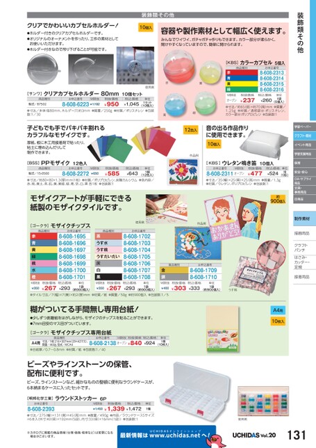 装飾類その他学習ペーパークラフト・素材イベント用品学習支援用品保育安全・安心OA・サプライ用品文具・事務用品日用品制作素材描画用品描画用品クラフトクラフトパンチパンチはさみ・さみ・カッター・カッター・定規定規接着用品着クリアでかわいいカプセルホルダー!●ホルダー付きのクリアカプセルホルダーです。●オリジナルのオーナメントを作ったり、工作の素材としてお使いいただけます。●ホルダー付きなので吊り下げることが可能です。装飾類その他10個入容器や製作素材として幅広く使えます。みんなでワイワイ、ガチャガチャ作りもできます。カラー部分が柔らかく、開けやすくなっていますので、簡単に開けられます。[KBS]カラーカプセル5個入商品種別お申込番号8-608-23138-608-23148-608-23158-608-2316赤青黄緑M価税抜オープン(5個入)●寸法/約65(径)×約70(高)mm●質量/1.25g●材質/透明部分:ポリスチレン、カラー部分:ポリプロピレン●包装数:1税込価格¥260¥237税抜価格単位1袋音の出る作品作りに使用できます。10個入赤使用例黄青緑12色入作品例[サンワ]クリアカプセルホルダー80mm10個セット商品種別型式/87502お申込番号M価税抜8-608-6223¥1,192税抜価格¥950税込価格¥1,045単位1セット(10個入)●寸法/本体:径80mm、ホルダー穴:約3mm●質量/250g●材質/ポリスチレン●包装数:1/30子どもでも手でパキパキ割れるカラフルなモザイクです。厚紙、板に木工用接着剤で貼ったり、粘土に埋め込んだりして制作できます。[BSS]PPモザイク12色入商品種別型式/15-0500お申込番号8-608-2272M価税抜¥650税抜価格¥585税込価格¥643単位1組(12色入)●寸法/約80×80×1.3(厚)mm(1枚)●材質/ポリプロピレン、炭酸カルシウム●色内容/赤、桃、黄土、茶、肌、黄、黄緑、緑、青、空、白、黒各1枚●包装数:1モザイクアートが手軽にできる紙製のモザイクタイルです。[ゴークラ]モザイクチップス商品種別赤青黄緑桃水橙お申込番号8-608-16958-608-16968-608-16978-608-16988-608-16998-608-17008-608-1701M価税抜¥350税抜価格¥267税込価格¥293単位1袋(約900個入)商品種別茶うす水うす桃うすだいだい灰白黒M価税抜¥350税抜価格¥267使用例お申込番号8-608-17028-608-17038-608-17048-608-17058-608-17068-608-17078-608-1708税込価格¥293単位1袋(約900個入)[KBS]ウレタン鳴き笛10個入お申込番号M価税抜8-608-2311オープン税抜価格¥477税込価格¥524単位1袋(10個入)●寸法/35幅)×25奥)×25高)mm●質量/1.3g●材質/ウレタン、ポリプロピレン●包装数:1約900個入作品例商品種別金銀お申込番号8-608-17098-608-1710M価税抜¥400税抜価格¥303税込価格¥333単位1袋(約900個入)うす桃●タイル寸法/7(幅)×7(奥)×約2(厚)mm●材質/紙●質量/50g●約900個入●包装数:1/5糊がついてる手間無し専用台紙!●少しずつ剥離紙をはがしながら、モザイクのチップスを貼ることができます。●7mm目安のマス目がついています。[ゴークラ]モザイクチップス専用台紙商品種別寸法/1枚:216×307mm(29×42マス)、質量/460g、型式/MCA4A4用●台紙厚/0.7〜0.8mm●材質/紙●包装数:1/40お申込番号8-608-2138オープン¥840M価税抜税抜価格税込価格¥924単位1冊(10枚入)ビーズやラインストーンの保管、配布に便利です。ビーズ、ラインストーンなど、細かなものの整頓に便利なラウンドケースが、6本納まるケースに入ったセットです。A4用10枚入[明邦化学工業]ラウンドストッカー6Pお申込番号8-608-2393M価税抜税抜価格¥1,450¥1,339¥1,472税込価格単位1個●寸法/275幅)×131(奥)×45(高)mm●質量/490g●内容/ラウンドケースSサイズ×6本入(外寸:40(径)×102mm(5段)、内寸:33径)×16mm(1段))●包装数:1使用例※カタログに掲載の商品情報(仕様・価格・税率など)は変更になる場合がございます。最新情報はUCHIDASww.uchidas.netwへ!Vol.20131