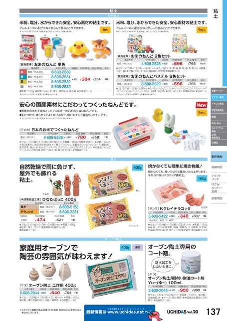 粘土学習ペーパークラフト・素材イベント用品学習支援用品保育安全・安心OA・サプライ用品文具・事務用品日用品制作素材描画用品描画用品クラフトクラフトパンチパンチはさみ・さみ・カッター・カッター・定規定規接着用品着粘土お米粘土米粉、塩分、水からできた安全、安心素材の粘土です。米粉、塩分、水からできた安全、安心素材の粘土です。アレルギーの心配が少なく安心して遊ぶことができます。※すべての方にアレルギー反応が起こらないということではありません。単色アレルギーの心配が少なく安心して遊ぶことができます。※すべての方にアレルギー反応が起こらないということではありません。9色入赤青赤黄白作品例[銀鳥産業]お米のねんど単色商品種別お申込番号M価税抜税抜価格型式/462-304型式/462-303赤青黄白●質量/120g●材質/米粉、水、塩分、食用顔料、保存料●包装数:1/6※パッケージデザインが変更となる場合があります。8-608-28308-608-28318-608-28328-608-2833¥304型式/462-305型式/462-306¥350[銀鳥産業]お米のねんど9色セット商品種別型式/462-300お申込番号8-608-2828M価税抜¥800税抜価格¥696税込価格¥765単位1セット税込価格単位●寸法/217(幅)×182(奥)×36(高)mm●色/9色入(赤、黄、緑、青、桃、橙、茶、黒、白)●質量/30g1個)●材質/米粉、水、塩分、食用顔料、保存料●包装数:1/6¥3341個[銀鳥産業]お米のねんどパステル9色セット商品種別型式/462-301お申込番号8-608-2829M価税抜¥800税抜価格¥696税込価格¥765単位1セット●寸法/217幅)×182(奥)×36高)mm●色/9色入(ベビーピンク、ミルキーオレンジ、ベビーイエロー、マスカット、ソーダ、ライラック、キャラメル、ペールオレンジ、ホワイト)●質量/30g1個)●材質/米粉、水、塩分、食用顔料、保存料●包装数:1/6※パッケージデザインが変更となる場合があります。安心の国産素材にこだわってつくったねんどです。●国産米の米粉を原料としたアレルギーの心配の少ないねんどです。●手につかず、柔らかくてよく伸びるので、扱いやすくて混色もしやすいです。※すべての方にアレルギー反応がおこらないというわけではありません。5色入[デビカ]日本のお米でつくったねんど商品種別型式/093111お申込番号8-608-6238M価税抜¥1,000税抜価格¥780税込価格¥858単位1個●寸法/152幅)×110(奥)×48(高)mm●質量/260g包装資材含む)●材質/ねんど:米粉(国産米)、食品添加物(含水ケイ酸マグネシウム、硫酸カルシウム、セルロース、離型剤)、食用色素、塩分、水、ねんどケース:ポリプロピレン、ねんど型:ポリエチレン●付属品/ねんどケース、ねんど型3種●色/5色入(青、黄、緑、白、赤)●包装数:1/6自然乾燥で雨に負けず、屋外でも飾れる粘土。作品例黄土400g黄土焼かなくても簡単に焼き物風!焼かなくても、焼いたような風合いに仕上がります。手が汚れないテラコッタ調粘土。160g[中部電磁器工業]ひなたぼっこ400g商品種別型式/06-0171型式/06-0174お申込番号8-608-21588-608-2221黄土テラコッタM価税抜¥560税抜価格¥474税込価格¥521単位1個●寸法/145(幅)×91(奧)×24(高)mm●質量/400g●材質/陶土・パルプ・樹脂糊剤・防腐防カビ剤●包装数:1/30[サンワ]Kクレイテラコッタお申込番号8-608-2422M価税抜¥396税抜価格¥348作品例税込価格¥382単位1個商品種別型式/31-427テラコッタ●寸法/160(幅)×100(奥)×22(高)mm●質量/160g●材質/微小中空樹脂、繊維、無機粉、合成糊剤、安定剤、防腐剤、防カビ剤、水●チャック付保存袋付●包装数:1/60オーブン粘土家庭用オーブンで陶芸の雰囲気が味わえます!400g薄茶オーブン陶土専用のコート剤。防水加工をしたいときに。作品例[ヤコ]オーブン陶土工作用400gお申込番号8-608-2044M価税抜¥800税抜価格¥640税込価格¥704単位1個●寸法/120(幅)×105(奥)×20(高)mm●質量/400g●材質/瀬戸産蛙目粘土●色/薄茶色●包装数:1/40※カタログに掲載の商品情報(仕様・価格・税率など)は変更になる場合がございます。最新情報はUCHIDASww.uchidas.netw[ヤコ]オーブン陶土用耐水・耐油コート剤Yu〜(ゆ〜)100mLお申込番号M価税抜8-608-2045¥1,100税抜価格¥900税込価格¥990単位1個●寸法/58径)×54(高)mm●容量/100mL●材質/合成樹脂、水●オーブン陶土専用●米国食品医薬局(FDA)認可●包装数:1/20へ!Vol.20137