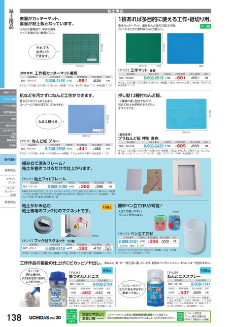 270mm260mm粘土用品1枚あれば多目的に使える工作・紙切り用。表はカッターマット、裏はねんど板の万能工作板。カットするときに便利な5mm方眼入り。表面がカッターマット、裏面が粘土板となっています。丈夫な5層構造で、中央の層はナイフを通さない硬質ビニル。粘土用品●飾れるものの大きさ/150×100mm●寸法/200(縦)×150横)×12(厚)mm●質量/225g●材質/枠:プラスチック、裏板:加工済MDF、透明板:プラスチック●包装数:1/80〈セット内容〉枠、裏板、透明板各1個粘土がかみ込む粘土専用のフック付のマグネットです。10個入簡単ペン立て作りが可能!大きくて使いやすいペン立てが作れます。作品例[サンワ]フック付マグネット10個商品種別型式/47611お申込番号8-608-6218M価税抜¥478使用例税抜価格¥380税込価格¥418単位1セット(10個入)●寸法/24(径)×15(厚)mm●質量/100g●材質/フック部分:鉄●包装数:1/100[サンワ]ペン立て芯材お申込番号8-608-2421M価税抜¥230税抜価格¥206税込価格¥226単位1個商品種別型式/31-097●寸法/約70(径)×90(高)mm●質量/40g●材質/ポリエチレン●包装数:1/100工作作品の最後の仕上げにピカッとツヤ出し。紙ねんど・紙・木・一般工芸に適しています。有害なベンゼン、トルエン、キシレンは一切含みません。100mL80mLキャップに便利な筆付き。ボタ落ちを防ぐ便利なニス切り付き。[デビカ]筆つきねんどニス商品種別型式/094501お申込番号8-608-2704M価税抜¥500税抜価格¥403税込価格¥443単位1個●寸法/52径)×95(高)mm●質量/108g●容量/80mL●材質/ニス:合成樹脂(アクリル)・有機溶剤・水、容器:PVC・ポリエチレン・ポリプロピレン、外装フィルム:ポリスチレン●包装数:1/12スプレータイプなので手を汚さずに簡単ツヤ出し。[デビカ]ねんどニススプレー商品種別型式/091552お申込番号8-608-1741M価税抜¥700税抜価格¥537税込価格¥590単位1個●寸法/52(径)×105(高)mm●質量/130g●容量/100mL●材質/ニス:合成樹脂(アクリル)・有機溶剤、水、容器:スチール・ポリプロピレン●包装数:1/12138Vol.20地球にやさしくお買い物このマークのついた商品は地球環境保護に配慮された商品です。グリーンの文字で商品の判別をしやすくしました。どうぞご利用ください。エコマーク認定品グリーン購入法適合品GPNエコ商品ねっと掲載320mm表面裏面[デビカ]工作マット緑青商品種別型式/093206お申込番号8-608-2619M価税抜¥750税抜価格¥601税込価格¥661単位1枚●寸法/320(幅)×270(奥)×3(厚)mm●質量/380g●5mm方眼入●材質/再生PVC●包装数:1/50250mm330mmM価税抜¥700税抜価格¥609税込価格¥669単位1枚押し型12種付ねんど板。12種類の押し型付きなので、初めて粘土を使用する子どもにオススメです。[銀鳥産業]プラねんど板押型青色商品種別型式/283-098お申込番号8-608-2439●寸法/330幅)×250(奥)×4(厚)mm●質量/280g●押し型12種付(くま、花、ふね、家、車、とんぼ、チューリップ、ライオン、時計、うさぎ、かに、汽車)●包装数:1/50[銀鳥産業]工作板カッターマット兼用商品種別型式/283-076お申込番号8-608-2156M価税抜¥700税抜価格¥581税込価格¥639単位1枚250mmなまえ欄付き。●寸法/320幅)×260奥)×3厚)mm●質量/350g●材質/塩化ビニル●包装数:1/50机などを汚さずにねんど工作ができます。壁などにかけてしまえるよう、コーナーに穴あけ加工がしてあります。[デビカ]ねんど板ブルー商品種別型式/093208お申込番号M価税抜8-608-2698¥550320mm税抜価格¥441税込価格¥485単位1枚●寸法/320(幅)×4(奥)×250(高)mm●質量/223g●なまえ欄付●包装数:1/50組み立て済みフレーム!粘土を巻きつけるだけで仕上がります。[サンワ]粘土フォトフレーム商品種別型式/93-138お申込番号8-608-2490M価税抜¥452税抜価格¥360税込価格¥396単位1個汚れても水洗いができます。320mm学習ペーパークラフト・素材イベント用品学習支援用品保育安全・安心OA・サプライ用品文具・事務用品日用品制作素材描画用品描画用品クラフトクラフトパンチパンチはさみ・はさみカッター・カッター・定規定規接着用品接着用