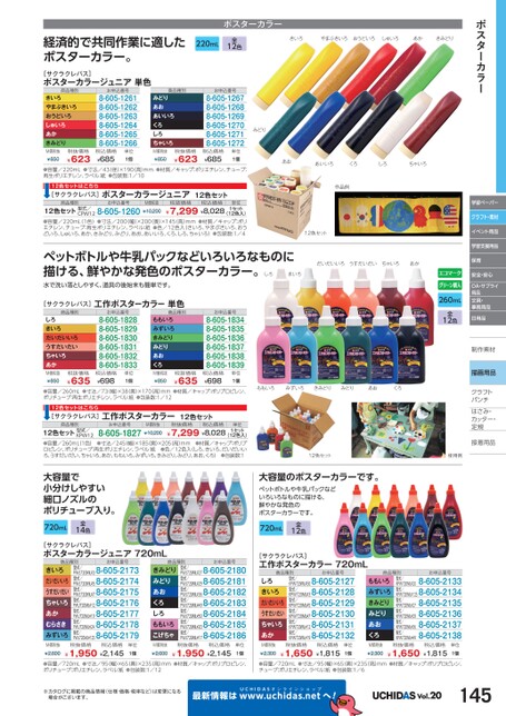 ポスターカラー学習ペーパークラフト・素材イベント用品学習支援用品保育安全・安心OA・サプライ用品文具・事務用品日用品制作素材作描画用品クラフトクラフトパンチパンチはさみ・さみ・カッター・カッター・定規定規接着用品着みどりあおあいいろくろしろちゃいろ作品例12色セットだいだいいろうすだいだいちゃいろあか260mL全12色ももいろみずいろきみどりみどりあおくろ12色セット使用例大容量のポスターカラーです。ペットボトルや牛乳パックなどいろいろなものに描ける、鮮やかな発色のポスターカラーです。720mL全12色[サクラクレパス]工作ポスターカラー720mL商品種別しろきいろだいだいいろうすだいだいちゃいろあかお申込番号型式/型式/型式/KPW720ML#508-605-2127KPW720ML#38-605-2128KPW720ML#58-605-2129KPW720ML#78-605-2130KPW720ML#128-605-2131KPW720ML#198-605-2132型式/型式/型式/商品種別お申込番号ももいろみずいろきみどりみどりあおくろM価税抜¥2,300型式/KPW720ML#20型式/8-605-2133KPW720ML#1258-605-21348-605-21358-605-21368-605-21378-605-2138型式/KPW720ML#27型式/KPW720ML#29型式/KPW720ML#36型式/KPW720ML#49税抜価格税込価格¥1,650¥1,815単位1個経済的で共同作業に適したポスターカラー。220mL全12色ポスターカラーきいろやまぶきいろおうどいろしゅいろあかきみどりお申込番号8-605-12678-605-12688-605-12698-605-12708-605-12718-605-1272[サクラクレパス]ポスターカラージュニア単色商品種別きいろやまぶきいろおうどいろしゅいろあかきみどりM価税抜¥850お申込番号8-605-12618-605-12628-605-12638-605-12648-605-12658-605-1266商品種別みどりあおあいいろくろしろちゃいろM価税抜¥850税抜価格¥623税込価格¥685単位1個税抜価格¥623税込価格¥685単位1個●容量/220mL●寸法/43径)×190(高)mm●材質/キャップ:ポリエチレン、チューブ:再生ポリエチレン、ラベル:紙●包装数:1/1012色[サクラクレパス]ポスターカラージュニア12色セット商品種別お申込番号税抜価格税込価格単位CPW128-605-126012色セット型式/(12色入)●容量/220mL1色)●寸法/200(幅)×200奥)×145(高)mm●材質/キャップ:ポリエチレン、チューブ:再生ポリエチレン、ラベル:紙●色/12色入(きいろ、やまぶきいろ、おうどいろ、しゅいろ、あか、きみどり、みどり、あお、あいいろ、くろ、しろ、ちゃいろ)●包装数:1/4¥7,299¥8,0281セットM価税抜¥10,200ペットボトルや牛乳パックなどいろいろなものに描ける、鮮やかな発色のポスターカラー。しろきいろ水で洗い落としやすく、道具の後始末も簡単です。お申込番号8-605-18348-605-18358-605-18368-605-18378-605-18388-605-1839[サクラクレパス]工作ポスターカラー単色商品種別商品種別しろきいろだいだいいろうすだいだいちゃいろあかM価税抜¥850お申込番号8-605-18288-605-18298-605-18308-605-18318-605-18328-605-1833ももいろみずいろきみどりみどりあおくろM価税抜¥850税抜価格¥635税込価格¥698単位1個税抜価格¥635税込価格¥698単位1個●容量/260mL●寸法/73幅)×38(奥)×170(高)mm●材質/キャップ:ポリプロピレン、ポリチューブ:再生ポリエチレン、ラベル:紙●包装数:1/1212色[サクラクレパス]工作ポスターカラー12色セット商品種別お申込番号税抜価格税込価格単位KPW128-605-182712色セット型式/●容量/260mL1色)●寸法/245(幅)×185(奥)×205(高)mm●材質/キャップ:ポリプロピレン、ポリチューブ:再生ポリエチレン、ラベル:紙●色/12色入(しろ、きいろ、だいだいいろ、うすだいだい、ちゃいろ、あか、ももいろ、みずいろ、きみどり、みどり、あお、くろ)●包装数:1¥7,299¥8,0281セット(12色入)M価税抜¥10,200大容量で小分けしやすい細口ノズルのポリチューブ入り。720mL全14色[サクラクレパス]ポスターカラージュニア720mL商品種別きいろだいだいいろうすだいだいちゃいろあかむらさきみずいろお申込番号型式/型式/型式/型式/PWJ720ML#38-605-2173PWJ720ML#58-605-2174PWJ720ML#78-605-2175PWJ720ML#128-605-2176PWJ720ML#198-605-2177PWJ720ML#248-605-2178PWJ720ML#1258-605-2179型式/型式/型式/商品種別きみどりみどりあおくろしろももいろこげちゃお申込番号型式/型式/型式/型式/PWJ720ML#278-605-2180PWJ720ML#298-605-2181PWJ720ML#368-605-2182PWJ720ML#498-605-2183PWJ720ML#508-605-2184PWJ720ML#208-605-2185PWJ720ML#178-605-2186型式/型式/型式/M価税抜¥2,600税抜価格税込価格¥1,950¥2,145単位1個M価税抜¥2,600税抜価格税込価格¥1.950¥2,145単位1個M価税抜¥2,300税抜価格税込価格¥1,650¥1,815単位1個●容量/720mL●寸法/95(幅)×65奥)×235(高)mm●材質/キャップ:ポリプロピレン、ポリチューブ:ポリエチレン、ラベル:紙●包装数:1/12●容量/720mL●寸法/95幅)×65(奥)×235(高)mm●材質/キャップ:ポリプロピレン、チューブ:ポリエチレン、ラベル:紙●包装数:1/6※カタログに掲載の商品情報(仕様・価格・税率など)は変更になる場合がございます。最新情報はUCHIDASww.uchidas.netwへ!Vol.20145