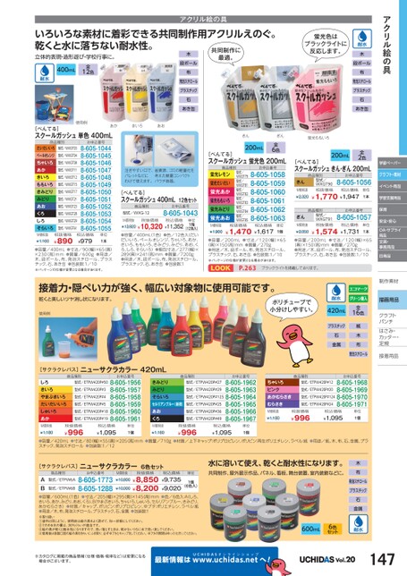 アクリル絵の具木段ボール布発泡スチロールプラスチック石あき缶蛍光色はブラックライトに反応します。いろいろな素材に着彩できる共同制作用アクリルえのぐ。乾くと水に落ちない耐水性。共同制作に最適。立体的表現・造形遊び・学校行事に。400mL全12色アクリル絵の具木段ボール布発泡スチロールプラスチック石あき缶学習ペーパークラフト・素材イベント用品学習支援用品保育安全・安心OA・サプライ用品文具・事務用品日用品制作素材作描画用品クラフトクラフトパンチパンチはさみ・さみ・カッター・カッター・定規定規接着用品着色全2200mL[ぺんてる]スクールガッシュきん・ぎん200mLお申込番号8-605-1056商品種別型式/WXGT90税抜価格きんM価税抜¥2,320税込価格¥1,770¥1,947単位1本商品種別型式/WXGT91税抜価格お申込番号8-605-1057税込価格単位¥1,574¥1,7311本ぎんM価税抜¥2,050色全6200mL[ぺんてる]スクールガッシュ蛍光色200mL商品種別蛍光レモン蛍光だいだい蛍光あか蛍光ももいろ蛍光みどり蛍光あお型式/WXGT79型式/WXGT81型式/WXGT82型式/WXGT83型式/WXGT84型式/WXGT85税抜価格M価税抜¥1,900お申込番号8-605-10588-605-10598-605-10608-605-10618-605-10628-605-1063税込価格単位¥1,470¥1,6171個●容量/200mL●寸法/120(幅)×65(奥)×150(高)mm●質量/270g●用途/木、段ボール、布、発泡スチロール、プラスチック、石、あき缶●包装数:1/10※パッケージの仕様が変更となる場合があります。●容量/200mL●寸法/120(幅)×65(奥)×150(高)mm●質量/270g●用途/木、段ボール、布、発泡スチロール、プラスチック、石、あき缶●包装数:1/10P.263ブラックライトを掲載しております。注ぎやすい口で、パレットなどにわけて使えます。省資源、ゴミの軽量化を考えた軽量コンパクトパウチ容器。[ぺんてる]スクールガッシュ400mL12色セット商品種別型式/WXG-12M価税抜お申込番号8-605-1043単位1箱税抜価格税込価格¥13,920¥10,320¥11,352(12色入)●容量/400mL1色)●色/12色入(だいだいいろ、ペールオレンジ、ちゃいろ、あか、きいろ、ももいろ、きみどり、みどり、あお、くろ、しろ、そらいろ)●梱包寸法/277(幅)×289(奥)×241高)mm●質量/7200g●用途/木、段ボール、布、発泡スチロール、プラスチック、石、あき缶●包装数:1きいろあおきんぎん蛍光ももいろ使用例[ぺんてる]スクールガッシュ単色400mLあか商品種別型式/WXGT03型式/WXGT04型式/WXGT08型式/WXGT11型式/WXGT12型式/WXGT15型式/WXGT17型式/WXGT21型式/WXGT23型式/WXGT28型式/WXGT29型式/WXGT61お申込番号8-605-10448-605-10458-605-10468-605-10478-605-10488-605-10498-605-10508-605-10518-605-10528-605-10538-605-10548-605-1055だいだいいろペールオレンジちゃいろあかきいろももいろきみどりみどりあおくろしろそらいろM価税抜¥1,160税抜価格¥890税込価格¥979単位1本●容量/400mL●寸法/90(幅)×65(奥)×230(高)mm●質量/600g●用途/木、段ボール、布、発泡スチロール、プラスチック、石、あき缶●包装数:1/10※パッケージの仕様が変更となる場合があります。接着力・隠ぺい力が強く、幅広い対象物に使用可能です。乾くと美しいツヤ消し状になります。全16色紙木布発泡スチロール420mLプラスチック石金属ポリチューブで小分けしやすい。ちゃいろピンクあかむらさきむらさきM価税抜¥1,180商品種別型式/ETPW420P#12型式/ETPW420P#20型式/ETPW420P#124型式/ETPW420P#24お申込番号8-605-19688-605-19698-605-19708-605-1971税抜価格¥996税込価格¥1,095単位1個使用例[サクラクレパス]ニューサクラカラー420mLしろきいろやまぶきいろだいだいいろしゅいろあかM価税抜¥1,180商品種別型式/ETPW420P#50型式/ETPW420P#3型式/ETPW420P#4型式/ETPW420P#5型式/ETPW420P#18型式/ETPW420P#19お申込番号8-605-19568-605-19578-605-19588-605-19598-605-19608-605-1961税抜価格¥996税込価格¥1,095単位1個商品種別お申込番号型式/ETPW420P#27型式/ETPW420P#298-605-19628-605-1963型式/ETPW420P#1258-605-19648-605-19658-605-19668-605-1967きみどりみどりそらいろセルリアンブルー(新橋)型式/ETPW420P#25あお型式/ETPW420P#36くろ型式/ETPW420P#49M価税抜¥1,180税込価格¥1,095¥996税抜価格単位1個●容量/420mL●寸法/80幅)×55奥)×205高)mm●質量/710g●材質/上下キャップ:ポリプロピレン、ポリビン:再生ポリエチレン、ラベル:紙●用途/紙、木、布、石、金属、プラスチック、発泡スチロール●包装数:1/12発泡スチロールプラスチック属石金600mL6色セット木布水に溶いて使え、乾くと耐水性になります。共同制作、屋外展示作品、パネル、看板、舞台装置、室内装飾などに。[サクラクレパス]ニューサクラカラー6色セット単位税込価格¥9,735¥9,020商品種別お申込番号M価税抜税抜価格型式/ETPW6B型式/ETPW6A8-605-17738-605-1288¥10,800¥8,850¥10,000¥8,200AB●容量/600mL1色)●寸法/205幅)×295奥)×145(高)mm●色/6色入:A(しろ、きいろ、あか、みどり、あお、くろ)、Bやまぶきいろ、ちゃいろ、しゅいろ、セルリアンブルー、きみどり、あかむらさき)●材質/キャップ、ポリビン:ポリプロピレン、中ブタ:ポリエチレン、ラベル:紙●用途/木、布、発泡スチロール、プラスチック、石、金属●包装数:1※取り扱い①塗料と同じように、使用前は絵の具をよく混ぜて、均一状態にしてください。②う