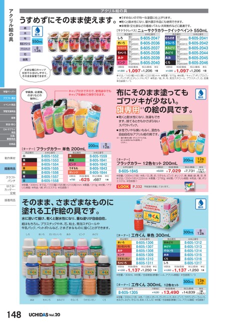 うすめずにそのまま使えます。●うすめないので均一な塗面に仕上がります。●乾くと耐水性になり、屋外展示作品にも使用できます。●体育祭・文化祭などの看板・パネル・共同制作などに最適です。アクリル絵の具[サクラクレパス]ニューサクラカラークイックペイント550mL商品種別型式/お申込番号型式/ETQW550#3型式/ETQW550#5型式/ETQW550#508-605-20478-605-20368-605-2037ETQW550#128-605-2038ETQW550#198-605-2039ETQW550#208-605-2040型式/型式/しろきいろだいだいいろちゃいろあかピンクむらさきそらいろきみどりみどりあおくろ商品種別型式/お申込番号型式/ETQW550#125型式/ETQW550#248-605-20418-605-2042ETQW550#278-605-2043ETQW550#298-605-2044ETQW550#368-605-2045ETQW550#498-605-2046型式/型式/型式/M価税抜¥1,300税抜価格税込価格¥1,097¥1,206単位1個M価税抜税抜価格税込価格¥1,300¥1,097¥1,206単位1個キャップ付きですので、使用途中でもキャップを締めて保存できます。●寸法/140(幅)×65奥)×230(高)mm●質量/870g●材質/キャップ:ポリプロピレン、パック:ポリエチレン、PA、PET●用途/紙、木、布、発泡スチロール、プラスチック、石、金属●包装数:1/5布にそのまま塗ってもゴワツキが少ない。旗専用※1の絵の具です。●乾くと耐水性になり、洗濯もできます。捨てるときもかさばらないスパウトパック。●水性でいやな臭いもなく、混色も自由自在なアクリル絵の具です。※1旗の素材は綿・ポリエステルの白、または淡色のものを使用してください。200mL全12色550mL全12色紙木布発泡スチロールプラスチック石金属大きな横口キャップ付きで小分けしやすく、そのまま保管できます。学級旗、応援旗、のぼりなどの制作に。アクリル絵の具学習ペーパークラフト・素材イベント用品学習支援用品保育安全・安心OA・サプライ用品文具・事務用品日用品制作素材制作素描画用品クラフトクラフトパンチパンチはさみ・はさみカッター・カッター・定規定規接着用品接着用[ターナー]フラッグカラー単色200mL商品種別お申込番号商品種別お申込番号8-605-15528-605-15538-605-15548-605-15558-605-15568-605-15578-605-1558白黒赤黄緑青空●容量/200mL●寸法/110(幅)×58(奥)×210(高)mm●質量/215g●材質/アクリル樹脂●用途/綿、ポリエステル●包装数:18-605-15598-605-18418-605-18428-605-18438-605-1844茶黄緑ピンクうすももオレンジM価税抜¥750税込価格¥687¥625税抜価格単位1本そのまま、さまざまなものに塗れる工作絵の具です。水に溶いて描け、乾くと耐水性になり、重ね塗りが自由自在。紙はもちろん、プラスチックや木、石、粘土、発泡スチロールや牛乳パック、ペットボトルなど、さまざまなものに描くことができます。しろきいろだいだいいろあかピンクみどり[ターナー]フラッグカラー12色セット200mL200mL12色セットお申込番号8-605-1845M価税抜¥8,500税抜価格¥7,029税込価格¥7,731単位1セット(12色入)●容量/200mL(1色)●色/白、黒、赤、うすもも、ピンク、オレンジ、黄、黄緑、緑、青、空、茶●寸法/250×185×220mm●質量/2790g●材質/アクリル樹脂●用途/綿、ポリエステル●包装数:1LOOKP.332学級旗を掲載しております。[ターナー]工作くん単色300mL商品種別きいろだいだいいろあかピンクうすだいだいちゃいろM価税抜お申込番号8-605-13068-605-13078-605-13088-605-13098-605-13108-605-1311商品種別きみどりみどりそらいろあおくろしろM価税抜300mL全12色お申込番号8-605-13128-605-13138-605-13148-605-13158-605-13168-605-1317税抜価格税込価格¥1,350¥1,137¥1,250単位1本税抜価格税込価格¥1,350¥1,137¥1,250単位1本●容量/300mL●材質/合成樹脂(酢酸ビニル、アクリル樹脂)●包装数:1/3[ターナー]工作くん300mL12色セットお申込番号8-605-1305(12色入)●容量/300mL1色)●色/12色入(きいろ、だいだいいろ、あか、ピンク、うすだいだい、ちゃいろ、きみどり、みどり、そらいろ、あお、くろ、しろ)●材質/合成樹脂(酢酸ビニル、アクリル樹脂)●包装数:1M価税抜¥16,200税抜価格¥13,490税込価格¥14,839単位1組300mL12色セットあおちゃいろきみどりそらいろうすだいだいくろ148Vol.20