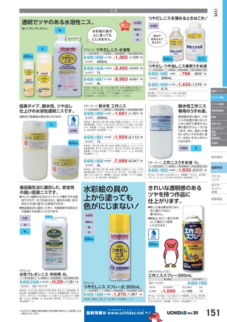 ニスつやだしニスを薄めるときはこれ!水溶性刷毛や用具は水で洗えます。水溶性紙粘土紙木ニス透明でツヤのある水溶性ニス。強いにおいがしません。4L水彩絵の具の上に塗ってもにじみません。300mL0.7L[ワシン]つやだし・つや消しニス専用うすめ液お申込番号8-605-1660M価税抜¥900税抜価格¥766税込価格¥842単位1本商品種別300mL8-605-1649¥1,700¥1,433¥1,5761本商品種別0.7L●材質/エチルアルコール系●水溶性●包装数:1/5(300mL)、1/6(0.7L)耐水性工作ニス専用のうすめ液。長時間空気に触れ、工作ニスの粘度が高くなったときに混ぜて使用すると筆の運びがスムーズになります。また、固まった筆をしばらくうすめ液に浸け、水洗いするときれいになります。水溶性1L[ターナー]工作ニスうすめ液1Lお申込番号M価税抜税抜価格税込価格単位8-605-1853¥2,200¥1,832¥2,0151本●寸法/93(径)×200高)mm●質量/1035g●材質/アルコール、水、にがり剤●水溶性●包装数:1/3きれいな透明感のあるツヤを持つ作品に仕上がります。●乾いた後は耐水性になり、水に濡れても白く濁りません。●紙粘土・木工・一般工作用として幅広くご使用いただけます。学習ペーパークラフト・素材イベント用品学習支援用品保育安全・安心OA・サプライ用品文具・事務用品日用品制作素材作描画用品クラフトクラフトパンチパンチはさみ・さみ・カッター・カッター・定規定規接着用品着300mL[サクラクレパス]工作ニススプレー300mL商品種別型式/KVS300お申込番号8-605-1955M価税抜¥1,320税抜価格¥1,060税込価格¥1,166単位1本●寸法/60(径)×183(高)mm●質量/310g●材質/缶:スチール、ボタン:ポリエチレン、キャップ:ポリプロピレン、ガス:DMEガス●容量/300mL●包装数:1/5へ!Vol.201511L400mL低臭タイプ、耐水性、ツヤ出し仕上げの水溶性透明ニスです。速乾性で乾燥後は耐水性になります。1L水溶性400mL[ワシン]つやだしニス水溶性お申込番号M価税抜8-605-1658¥1,720税抜価格税込価格単位¥1,362¥1,4981本商品種別400mL8-605-1648¥3,250商品種別商品種別1L4L8-605-1657¥11,330¥2,405¥2,6451本¥8,983¥9,8811本●用途/紙粘土、紙、木など屋内用●塗り面積(2回塗り)/400mL:たたみ2枚、1L:たたみ4.5枚●乾燥時間(20℃)/約10〜20分●材質/アクリル樹脂、アルコール●包装数:1/5(400mL)、1/6(1L)、1/4(4L)[ターナー]耐水性工作ニスお申込番号8-605-1850¥1,250M価税抜税抜価格税込価格単位¥1,001¥1,1011本商品種別400mL●用途/室内用上塗り剤●塗り面積(2回塗り)/2.5〜3㎡●乾燥時間/約20〜30分(20℃)●寸法/93(径)×100(高)mm●質量/445g●材質/アクリル樹脂、アルコール、水●水溶性●包装数:1/68-605-1851¥2,400¥1,920¥2,1121本商品種別1L●用途/室内用上塗り剤●塗り面積(2回塗り)/6.5〜7.5㎡●乾燥時間/約20〜30分(20℃)●寸法/93径)×200(高)mm●質量/1035g●材質/アクリル樹脂、アルコール、水●水溶性●包装数:1/38-605-1852¥8,600¥7,589¥8,3471本商品種別4L●用途/室内用上塗り剤●塗り面積(2回塗り)/26〜30㎡●乾燥時間/約20〜30分(20℃)●寸法/180(幅)×115(奥)×275(高)mm●質量/3850g●材質/アクリル樹脂、アルコール、水●水溶性●包装数:1水彩絵の具の上から塗っても色がにじまない!水溶性紙粘土紙木300mL食品衛生法に適合した、安全性の高い低臭ニスです。●ウレタン樹脂の丈夫なコーティング膜ができる塗料ですので、木工作品以外に、屋内の木部(机や床など)の塗り替えにも使用できます。●食品衛生法に適合しており、木製食器や玩具などの塗装にもお使いいただけます。水性木4L[ワシン]水性ウレタンニス学校用4Lお申込番号8-605-2340¥10,700¥10,329¥11,3611本M価税抜税抜価格税込価格単位商品種別型式/09-0190●用途/木工作品、屋内の木部(家具、床など)、木製食器、木製玩具●塗面積(2回塗り)/約45㎡●乾燥時間/約60分(20℃)●寸法/155幅)×115(奥)×335(高)mm●質量/4.5kg●容量/4L●水溶性●材質/アクリルウレタン●包装数:1/4[ワシン]つやだしニススプレー式300mLお申込番号M価税抜税抜価格税込価格8-605-1659¥1,520¥1,270¥1,397単位1本●用途/紙粘土、紙、木●水溶性●包装数:1/12※カタログに掲載の商品情報(仕様・価格・税率など)は変更になる場合がございます。最新情報はUCHIDASww.uchidas.netw