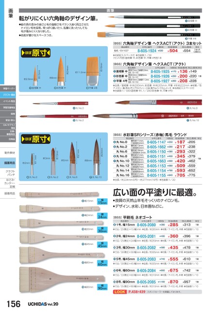単位1本お申込番号8-605-11478-605-16628-605-11508-605-11518-605-16638-605-11538-605-11548-605-1155M価税抜¥250¥290¥390¥460¥560¥680¥790¥940税抜価格¥187¥217¥293¥345¥420¥509¥593¥705税込価格¥205¥238¥322¥379¥462¥559¥652¥775商品種別穂先約11mm、口金径約2mm穂先約13mm、口金径約3mm穂先約18mm、口金径約4.5mm穂先約21mm、口金径約5mm穂先約24mm、口金径約6mm穂先約26mm、口金径約7mm穂先約29mm、口金径約8mm穂先約31mm、口金径約9mm丸No.0丸No.2丸No.6丸No.8丸No.10丸No.12丸No.14丸No.16❹❺❻●[BSS]水彩筆SRシリーズ(赤軸)馬毛ラウンド●全長/約224mm(0号)〜約277mm(16号)●包装数:1/20広い面の平塗りに最適。●良質の天然山羊毛そっくりのナイロン毛。●デザイン、水彩、日本画などに。[BSS]平刷毛ネオゴート商品種別●1号、幅15mmお申込番号8-605-2080M価税抜¥380税抜価格¥285税込価格¥313単位1本●寸法/20穂丈)×15幅)mm●全長/約285mm●材質/ナイロン毛、木柄●包装数:1/10●2号、幅24mm8-605-2081¥480¥360¥3961本●寸法/25穂丈)×24(幅)mm●全長/約293mm●材質/ナイロン毛、木柄●包装数:1/10●3号、幅30mm8-605-2082¥580¥435¥4781本●寸法/30穂丈)×30(幅)mm●全長/約305mm●材質/ナイロン毛、木柄●包装数:1/10●5号、幅45mm8-605-2083¥740¥555¥6101本●寸法/30穂丈)×45(幅)mm●全長/約305mm●材質/ナイロン毛、木柄●包装数:1/106号、幅60mm●●寸法/33穂丈)×60(幅)mm●全長/約310mm●材質/ナイロン毛、木柄●包装数:1/108-605-2084¥675¥742¥9001本8号、幅90mm●●寸法/35穂丈)×90(幅)mm●全長/約310mm●材質/ナイロン毛、木柄●包装数:1/108-605-2085¥870¥957¥1,1601本LOOKP.438・439スポンジローラーを掲載しております。❹丸No.0❺丸No.2❻丸No.8❼丸No.10画筆●面相筆中●彩色筆中[BSS]六角軸デザイン筆ヘクスACT(アクト)3本セット商品種別型式/03-1027お申込番号8-605-1924M価税抜¥630税抜価格¥504税込価格¥554単位1セット(3本入)●平筆4号●名前記入スペース付●包装数:1/50〈セット内容〉面相筆中、彩色筆中、平筆4号各1本[BSS]六角軸デザイン筆ヘクスACT(アクト)お申込番号8-605-19258-605-19268-605-1927M価税抜税抜価格税込価格単位¥170¥136¥149¥200¥220¥208¥228¥250¥2601本型式/03-1100面相筆中穂先約15mm、口金幅約2.8mm、彩色筆中穂先約24mm、口金幅約6mm、平筆4号穂先約18mm、口金幅約11.2mm、中:約200mm、彩色筆型式/03-1101型式/03-1102●●●商品種別●全長/面相筆ナイロン、軸:再生ポリプロピレン、口金:真ちゅう・クロムメッキ●名前記入スペース付●包装数:1/300(面相筆中)、1/200(彩色筆中、平筆4号)中:約205mm、平筆4号:約222mm●材質/毛:転がりにくい六角軸のデザイン筆。●絵の具の含みの良さと毛の強靭さをバランス良く両立させたナイロン毛を採用。荒っぽく描いたり、乱暴に洗ったりしても毛が傷みにくくなりました。●名前が書けるスペースつき。約18mm約11.2mm約24mm約6mm約15mm約2.8mmほぼ原寸●面相筆中●彩色筆中●平筆4号画筆学習ペーパークラフト・素材イベント用品学習支援用品保育安全・安心OA・サプライ用品文具・事務用品日用品制作素材制作素ほぼ原寸●丸No.0●丸No.2●丸No.8●丸No.10クラフトクラフトパンチパンチはさみ・はさみカッター・カッター・定規定規接着用品接着用●幅15mm●幅24mm●幅30mm●幅45mm幅15mm幅24mm幅30mm幅45mm●幅60mm幅60mm●幅90mm幅90mm156Vol.20約24mm約21mm約5mm約6mm約13mm約3mm約11mm描画用品約2mm