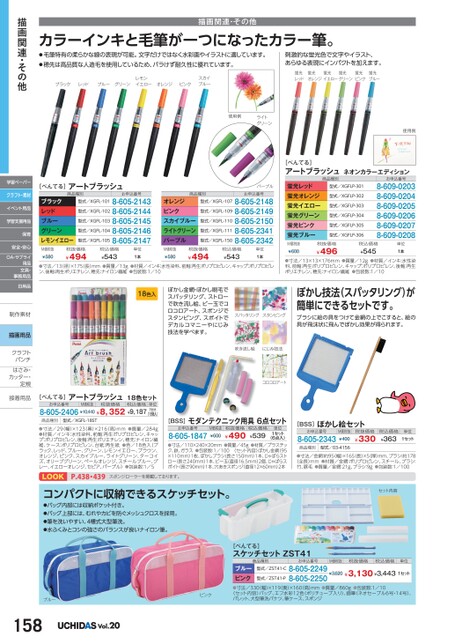 描画関連・その他カラーインキと毛筆が一つになったカラー筆。●毛筆特有の柔らかな線の表現が可能。文字だけではなく水彩画やイラストに適しています。●穂先は高品質な人造毛を使用しているため、バラけず耐久性に優れています。ブラックレッドブルーグリーンレモンイエローオレンジピンクスカイブルー刺激的な蛍光色で文字やイラスト、あらゆる表現にインパクトを加えます。蛍光レッド蛍光オレンジ蛍光イエロー蛍光グリーン蛍光ピンク蛍光ブルー使用例ライトグリーン使用例[ぺんてる]アートブラッシュ商品種別ブラックレッドブルーグリーンレモンイエロー型式/XGFL-101型式/XGFL-102型式/XGFL-103型式/XGFL-104型式/XGFL-105お申込番号8-605-21438-605-21448-605-21458-605-21468-605-2147商品種別オレンジピンクスカイブルーライトグリーンパープル型式/XGFL-107型式/XGFL-109型式/XGFL-110型式/XGFL-111型式/XGFL-150パープルお申込番号8-605-21488-605-21498-605-21508-605-23418-605-2342M価税抜¥580税抜価格¥494税込価格¥543単位1本M価税抜¥580税抜価格¥494税込価格¥543単位1本●寸法/13径)×175(長)mm●質量/13g●材質/インキ:水性染料、前軸:再生ポリプロピレン、キャップ:ポリプロピレン、後軸:再生ポリエチレン、穂先:ナイロン繊維●包装数:1/10[ぺんてる]アートブラッシュネオンカラーエディション蛍光レッド蛍光オレンジ蛍光イエロー蛍光グリーン蛍光ピンク蛍光ブルー商品種別型式/XGFLP-301型式/XGFLP-302型式/XGFLP-303型式/XGFLP-304型式/XGFLP-305型式/XGFLP-306お申込番号8-609-02038-609-02048-609-02058-609-02068-609-02078-609-0208M価税抜¥600税抜価格¥496税込価格¥545単位1本●寸法/13×13×176mm●質量/12g●材質/インキ:水性染料、前軸:再生ポリプロピレン、キャップ:ポリプロピレン、後軸:再生ポリエチレン、穂先:ナイロン繊維●包装数:1/10ぼかし技法(スパッタリング)が簡単にできるセットです。ブラシに絵の具をつけて金網の上でこすると、絵の具が飛沫状に飛んでぼかし効果が得られます。18色入ぼかし金網・ぼかし刷毛でスパッタリング、ストローで吹き流し絵、ビー玉でコロコロアート、スポンジでスタンピング、スポイトでデカルコマニーやにじみ技法を学べます。スパッタリングスタンピング吹き流し絵にじみ技法コロコロアート[ぺんてる]アートブラッシュ18色セットお申込番号8-605-2406¥10,440¥8,352¥9,187M価税抜税抜価格税込価格単位1セット(18色入)商品種別型式/XGFL-18ST●寸法/29(幅)×123(奥)×216(高)mm●質量/284g●材質/インキ:水性染料、前軸:再生ポリプロピレン、キャップ:ポリプロピレン、後軸:再生ポリエチレン、穂先:ナイロン繊維、ケース:ポリプロピレン、台紙:再生紙●色/18色入(ブラック、レッド、ブルー、グリーン、レモンイエロー、ブラウン、オレンジ、ピンク、スカイブルー、ライトグリーン、ターコイズ、オリーブグリーン、ペールオレンジ、スチールブルー、グレー、イエローオレンジ、セピア、パープル)●包装数:1/5[BSS]モダンテクニック用具6点セットお申込番号8-605-1847M価税抜¥600税抜価格¥490税込価格¥539(6点入)●寸法/110×240×20mm●質量/45g●材質/プラスチック、鉄、ガラス●包装数:1/100〈セット内容〉ぼかし金網(95×110mm)1枚、ぼかしブラシ(長さ150mm)1本、じゃばらストロー(長さ240mm)1本、ビー玉(直径16.5mm)2個、じゃばらスポイト(長さ90mm)1本、穴あきスポンジ(直径12×60mm)2本単位1セットLOOKP.438・439スポンジローラーを掲載しております。コンパクトに収納できるスケッチセット。●バッグ内部には収納ポケット付き。●バッグ上部には、むれやカビを防ぐメッシュクロスを採用。●筆を洗いやすい、4槽式大型筆洗。●水ふくみとコシの強さのバランスが良いナイロン筆。[BSS]ぼかし絵セットお申込番号8-605-2343M価税抜¥400税抜価格¥330税込価格¥363単位1セット商品種別型式/03-4156●寸法/金網:約95(幅)×165(長)×5(厚)mm、ブラシ:約178(全長)mm●材質/金網:ポリプロピレン、スチール、ブラシ:竹、豚毛●質量/金網:21g、ブラシ:9g●包装数:1/100セット内容描画関連・その他学習ペーパークラフト・素材イベント用品学習支援用品保育安全・安心OA・サプライ用品文具・事務用品日用品制作素材制作素描画用品クラフトクラフトパンチパンチはさみ・はさみカッター・カッター・定規定規接着用品接着用[ぺんてる]スケッチセットZST41商品種別お申込番号M価税抜税抜価格税込価格単位型式/ZST41-C8-605-22498-605-2250ブルーピンク●寸法/330(幅)×119(奥)×160(高)mm●質量/860g●包装数:1/10〈セット内容〉バッグ、エフ水彩12色(ポリチューブ入り)、画筆(ネオセーブル6号・14号)、パレット、大型筆洗バケツ、筆ケース、スポンジ¥3,620¥3,130¥3,4431セット型式/ZST41-Pブルー158Vol.20ピンク