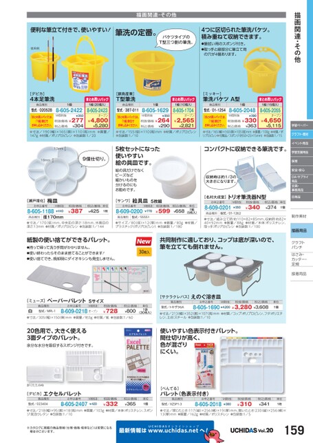 描画関連・その他学習ペーパークラフト・素材イベント用品学習支援用品保育安全・安心OA・サプライ用品文具・事務用品日用品制作素材作描画用品クラフトクラフトパンチパンチはさみ・さみ・カッター・カッター・定規定規接着用品着描画関連・その他便利な筆立て付きで、使いやすい!筆洗の定番。バケツタイプのT型三つ割の筆洗。4つに区切られた筆洗バケツ。積み重ねて収納できます。●筆拭い用のスポンジ付き。●取っ手と縁部分に筆立て用の穴が4個あります。使用例[デビカ]4本足筆洗商品種別1個型式/020528「まとめ買いパック」は、「1組」単位でお申し込みください。8-605-2422¥350M価税抜税抜価格¥277¥304税込価格まとめ買いパック1組(20個入)8-605-2423オープン¥4,800¥5,280[銀鳥産業]T型筆洗商品種別型式/387-011「まとめ買いパック」は、「1組」単位でお申し込みください。1個8-605-1629¥350M価税抜税抜価格¥264¥290税込価格まとめ買いパック1組(10個入)8-605-1704オープン¥2,565¥2,821[ミッキー]筆洗バケツA型商品種別型式/01-1254「まとめ買いパック」は、「1組」単位でお申し込みください。1個8-605-2048¥390M価税抜税抜価格¥330¥363税込価格まとめ買いパック1組(15個入)8-605-2055オープン¥4,650¥5,115●寸法/190(幅)×165(奥)×110(高)mm●質量/147g●材質/ポリプロピレン●包装数:1/20●寸法/155(径)×110(高)mm●材質/ポリプロピレン●包装数:1/10●寸法/165(幅)×160奥)×105(高)mm●質量/100g●材質/ポリプロピレン●付属品/スポンジ(約50×25×15mm)●包装数:1/1513mm18mm9個仕切り。5枚セットになった使いやすい絵の具皿です。絵の具だけでなくビーズなど細かいものを分けるのにもお勧めです。梅皿[瀬戸理化]お申込番号8-605-1188M価税抜¥440径170mm商品種別税抜価格¥387税込価格¥425単位1枚[サンワ]絵具皿5枚組お申込番号8-609-0200M価税抜¥778税抜価格¥599商品種別型式/55551税込価格¥658単位1組(5枚入)●寸法/170(径)mm、中央皿の深さ:18mm、外側皿の深さ:13mm●材質/ポリプロピレン●包装数:1/144●サイズ/80(径)×12(厚)mm●質量/80g●材質/プラスチック(ポリプロピレン)●包装数:1/180コンパクトに収納できる筆洗です。収納時は約1/3の大きさになります。[名村大成堂]トリオ筆洗器N型お申込番号8-609-0201M価税抜¥350税抜価格¥340税込価格¥374単位1個商品種別型式/01-1262●寸法/組み立て時:約110×82×85mm、収納時:約82×40×92mm●質量/88g●材質/本体:ポリスチレン、取っ手:ポリプロピレン●包装数:1/100紙製の使い捨てができるパレット。●持って帰って洗う手間がかかりません。●使い終わったらそのまま捨てることができます!●使い捨てでき、焼却時にダイオキシンも発生しません。30枚入共同制作に適しており、コップは底が深いので、筆を立てても倒れません。[ミューズ]ペーパーパレットSサイズ商品種別型式/MPL-1お申込番号M価税抜税抜価格白●寸法/305(幅)×150(奥)mm●質量/約3g●材質/紙●包装数:1/608-609-0218オープン¥728税込価格¥800単位1袋(30枚入)20色用で、大きく使える3面タイプのパレット。余分な水分を吸収するスポンジ付きです。折りたたみ時[デビカ]エクセルパレット商品種別型式/023404お申込番号8-605-2407M価税抜¥420税抜価格¥332税込価格¥365単位1個[サクラクレパス]えのぐ溶き皿商品種別型式/トキザラ6Aお申込番号M価税抜税抜価格税込価格8-605-1690¥4,200¥3,280¥3,608単位1個●寸法/213(幅)×352(奥)×107(高)mm●材質/コップ:ポリプロピレン、フタ:ポリエチレン、土台:スチール●包装数:1/10使いやすい色表示付きパレット。間仕切りが高く、色が混ざりにくい。[ぺんてる]パレット(色表示付き)商品種別型式/XZSP1-3お申込番号8-605-2018M価税抜¥380税抜価格¥310税込価格¥341単位1枚●寸法/218(幅)×95(奥)×18(高)mm●質量/103g●材質/本体:ポリスチレン、スポンジ:発泡ウレタン●包装数:1/10●寸法/閉じたとき:117(縦)×256(横)×19(厚)mm、開いたとき:230(縦)×256(横)×13(厚)mm●質量/162g●材質/ポリスチレン●包装数:1/5※カタログに掲載の商品情報(仕様・価格・税率など)は変更になる場合がございます。最新情報はUCHIDASww.uchidas.netwへ!Vol.20159