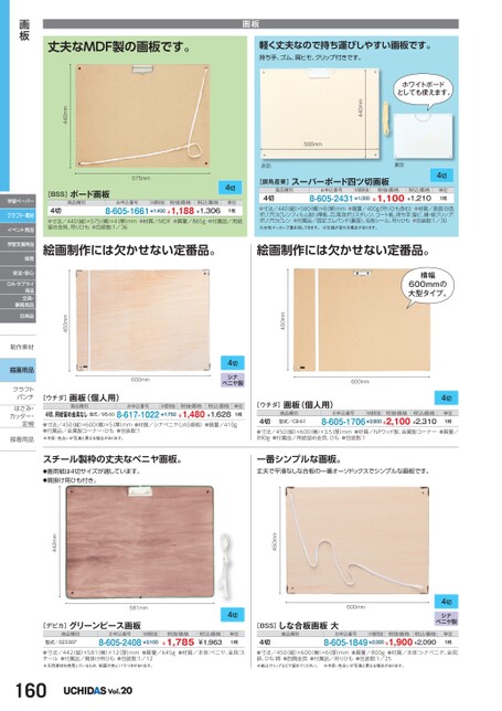 ホワイトボードとしても使えます。440mm580mm表面裏面440mm丈夫なMDF製の画板です。軽く丈夫なので持ち運びしやすい画板です。持ち手、ゴム、肩ヒモ、クリップ付きです。画板575mm4切[BSS]ボード画板商品種別お申込番号M価税抜税抜価格税込価格4切●寸法/440(縦)×575(横)×4(厚)mm●材質/MDF●質量/865g●付属品/用紙留め金具、吊りひも●包装数:1/368-605-1661¥1,400¥1,188¥1,306単位1枚[銀鳥産業]スーパーボード四ツ切画板商品種別4切お申込番号8-605-2431¥1,300¥1,100¥1,210M価税抜税抜価格税込価格4切単位1枚●寸法/440(縦)×580(横)×8(厚)mm●質量/400g吊りひも含む)●材質/表面:白色ポリプロピレンフィルム貼り厚紙、芯:発泡ポリスチレン、コート紙、持ち手:塩ビ、縁・紙クリップ:ポリプロピレン●付属品/固定ゴムバンド(裏面)、名前シール、吊りひも●包装数:1/30※水性マーカーで書き消しできます。※仕様が変わる場合があります。絵画制作には欠かせない定番品。絵画制作には欠かせない定番品。横幅600mmの大型タイプ。600mm4切600mm4切シナベニヤ製450mm450mm[ウチダ]画板(個人用)商品種別4切、用紙留め金具なし型式/MS-608-617-1022¥1,750¥1,480¥1,628お申込番号M価税抜税抜価格税込価格単位1枚●寸法/450(縦)×600(横)×5(厚)mm●材質/シナベニヤ(JAS規格)●質量/410g●付属品/金属製コーナー・ひも●包装数:1※木目・色合いが写真と異なる場合があります。[ウチダ]画板(個人用)商品種別型式/CB-61お申込番号M価税抜税抜価格税込価格4切●寸法/450(縦)×600横)×3.5(厚)mm●材質/NPウッド製、金属製コーナー●質量/890g●付属品/用紙留め金具、ひも●包装数:18-605-1706¥2,800¥2,100¥2,310単位1枚画板学習ペーパークラフト・素材イベント用品学習支援用品保育安全・安心OA・サプライ用品文具・事務用品日用品制作素材制作素描画用品クラフトクラフトパンチパンチはさみ・はさみカッター・カッター・定規定規接着用品接着用スチール製枠の丈夫なベニヤ画板。●画用紙は4切サイズが適しています。●肩掛け用ひも付き。一番シンプルな画板。丈夫で平滑なしな合板の一番オーソドックスでシンプルな画板です。450mm442mm581mm[デビカ]グリーンピース画板商品種別型式/023307お申込番号8-605-2408¥2,100M価税抜税抜価格税込価格¥1,785¥1,9634切単位1枚●寸法/442(縦)×581横)×12(厚)mm●質量/645g●材質/本体:ベニヤ、金具:スチール●付属品/肩掛け用ひも●包装数:1/12※天然素材を使用しているため、板面の色にバラつきがあります。160Vol.20600mm4切シナベニヤ製[BSS]しな合板画板大商品種別お申込番号M価税抜税抜価格税込価格8-605-1849¥2,300¥1,900¥2,0904切●寸法/450(縦)×600(横)×6厚)mm●質量/800g●材質/本体:シナベニヤ、金具:鉄、ひも:綿●四隅金具●付属品/吊りひも●包装数:1/25※紙はクリップなどで留めてください。※木目・色合いが写真と異なる場合があります。単位1枚