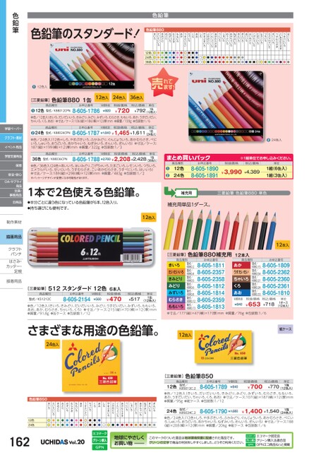 はいいろうすべにいろこいあかむらさきうすむらさきせいじいろエメラルドいろつちいろレモンいろたまごいろこげちゃいろはいみどりあいいろぎんいろきんいろねずみいろあかちゃいろおうどいろしゅいろべにいろあかむらさきぐんじょういろふかみどりやまぶきいろしろあおくろちゃいろうすだいだいあかももいろむらさきみずいろみどりきみどりだいだいいろきいろ●●●●●●●●●●●●12色24色●●●●●●●●●●●●●●●●●●●●●●●●36色●●●●●●●●●●●●●●●●●●●●●●●●●●●●●●●●●●●●12色入24色入36色入●12色入[三菱鉛筆]色鉛筆8801缶●12色商品種別型式/K88012CPNお申込番号8-605-1786M価税抜¥920税抜価格¥720税込価格¥792単位1缶(12色入)●色/12色入(きいろ、だいだいいろ、きみどり、みどり、みずいろ、むらさき、ももいろ、あか、うすだいだい、ちゃいろ、くろ、あお)●寸法/ケース:106(縦)×186(横)×12厚)mm●質量/159g●包装数:1/6色鉛筆のスタンダード!色鉛筆色鉛筆880●24色入※1組単位申込。税抜価格税込価格¥3,990¥4,389単位1組(6缶入)1組(3缶入)お申込番号8-605-18908-605-1891商品種別12色24色●●まとめ買いパック商品種別型式/K88024CPNお申込番号M価税抜税抜価格税込価格●24色8-605-1787¥1,840¥1,465¥1,611(24色入)●色/24色入(12色+しろ、やまぶきいろ、ふかみどり、ぐんじょういろ、あかむらさき、べにいろ、しゅいろ、おうどいろ、あかちゃいろ、ねずみいろ、きんいろ、ぎんいろ)●寸法/ケース:187(縦)×199(横)×12(厚)mm●質量/322g●包装数:1/3単位1缶商品種別お申込番号M価税抜税抜価格税込価格型式/K88036CPN8-605-1788¥2,760¥2,208¥2,42836色(36色入)●色/36色入(24色+あいいろ、はいみどり、こげちゃいろ、たまごいろ、レモンいろ、つちいろ、エメラルドいろ、せいじいろ、うすむらさき、こいあかむらさき、うすべにいろ、はいいろ)●寸法/ケース:189(縦)×298(横)×12(厚)mm●質量/483g●包装数:1/2※パッケージデザインが変更になる可能性があります。単位1缶1本で2色使える色鉛筆。●半分ごとに違う色になっている色鉛筆が6本、12色入り。●持ち運びにも便利です。12色入補充用三菱鉛筆色鉛筆880単色補充用単品1ダース。12本入[三菱鉛筆]512スタンダード12色6本入商品種別型式/K51212Cお申込番号8-605-2154M価税抜¥560税抜価格¥470税込価格¥517単位1缶(12色入)●色/12色入(きいろ、きみどり、だいだいいろ、みどり、うすだいだい、みずいろ、ももいろ、あお、あか、むらさき、ちゃいろ、くろ)●寸法/ケース:215(縦)×70(横)×12(厚)mm●質量/91.8g●缶ケース●包装数:1/12[三菱鉛筆]色鉛筆880補充用12本入商品種別お申込番号商品種別きいろだいだいいろきみどりみどりみずいろむらさきももいろ●寸法/177(縦)×47(横)×17(厚)mm●質量/76g●包装数:1/68-605-18118-605-23578-605-23588-605-18128-605-18148-605-23598-605-1813型式/K880.15型式/K880.54型式/K880.21型式/K880.24型式/K880.33税抜価格あかうすだいだいちゃいろくろあお型式/K880.2型式/K880.4型式/K880.5型式/K880.6型式/K880.8型式/K880.12型式/K880.13M価税抜¥840お申込番号8-605-18098-605-23628-605-23608-605-23618-605-1810税込価格¥653¥718単位1ダース(12本入)さまざまな用途の色鉛筆。12色入24色入紙ケース[三菱鉛筆]色鉛筆850商品種別型式/K85012C.212色お申込番号8-605-1789M価税抜¥840税抜価格¥700税込価格¥770単位1箱(12色入)●色/12色入(きいろ、だいだいいろ、きみどり、みどり、みずいろ、むらさき、ももいろ、あか、うすだいだい、ちゃいろ、くろ、あお)●寸法/ケース:107(縦)×187(横)×12(厚)mm●質量/95g●紙ケース●包装数:1/1224色型式/K85024C.28-605-1790¥1,680¥1,400¥1,5401箱(24色入)●色/24色入(12色+しろ、やまぶきいろ、ふかみどり、ぐんじょういろ、あかむらさき、べにいろ、しゅいろ、おうどいろ、あかちゃいろ、ねずみいろ、きんいろ、ぎんいろ)●寸法/ケース:188(縦)×208(横)×12(厚)mm●質量/206g●紙ケース●包装数:1/6ぎんいろきんいろねずみいろあかちゃいろおうどいろしゅいろべにいろあかむらさきぐんじょういろふかみどりやまぶきいろしろあおくろちゃいろ●●●●●●●●●●●●●●●●●●うすだいだい●●あか●●ももいろ●●むらさき●●みずいろ●●みどり●●きみどり●●だいだいいろ●●きいろ●●Vol.20地球にやさしくお買い物このマークのついた商品は地球環境保護に配慮された商品です。グリーンの文字で商品の判別をしやすくしました。どうぞご利用ください。エコマーク認定品グリーン購入法適合品GPNエコ商品ねっと掲載色鉛筆85012色24色162色鉛筆学習ペーパークラフト・素材イベント用品学習支援用品保育安全・安心OA・サプライ用品文具・事務用品日用品制作素材制作素描画用品クラフトクラフトパンチパンチはさみ・はさみカッター・カッター・定規定規接着用品接着用