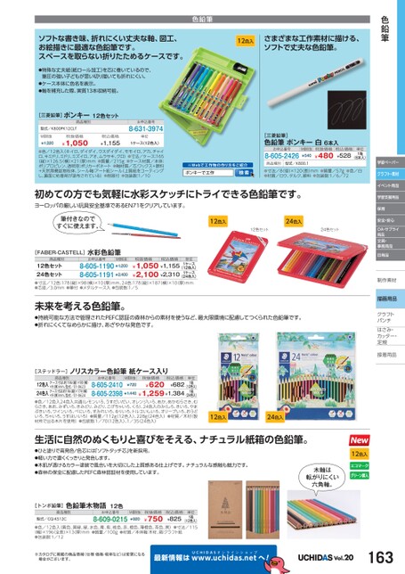 色鉛筆学習ペーパークラフト・素材イベント用品学習支援用品保育安全・安心OA・サプライ用品文具・事務用品日用品制作素材作描画用品クラフトクラフトパンチパンチはさみ・さみ・カッター・カッター・定規定規接着用品着色鉛筆ソフトな書き味、折れにくい丈夫な軸、図工、お絵描きに最適な色鉛筆です。スペースを取らない折りたためるケースです。12色入さまざまな工作素材に描ける、ソフトで丈夫な色鉛筆。●特殊な丈夫紙(紙ロール加工)を芯に巻いているので、筆圧の強い子どもが思い切り描いても折れにくい。●ケース本体に色名を表示。●軸を補充した際、実質13本収納可能。[三菱鉛筆]ポンキー12色セット商品種別型式/K800PK12CLTM価税抜¥1,320税抜価格¥1,050税込価格¥1,155お申込番号8-631-3974単位1ケース(12色入)●色/12色入(キイロ、ダイダイ、ウスダイダイ、モモイロ、アカ、チャイロ、キミドリ、ミドリ、ミズイロ、アオ、ムラサキ、クロ)●寸法/ケース:165(縦)×126.5(横)×21(厚)mm●質量/215g●ケース材質/本体:ポリプロピレン、透明窓:ポリカーボネート●軸材質/芯:ワックス+顔料+天然無機鉱物粉体、シール軸:アート紙シール(上質紙をコーティングし、裏面に粘着剤が塗布されている)●削器付●包装数:1/10※Webで工作物の作り方をご紹介ポンキーで工作[三菱鉛筆]色鉛筆ポンキー白6本入お申込番号8-605-2426M価税抜¥540税抜価格¥480税込価格¥528単位1箱(6本入)商品種別型式/K800.1●寸法/8(径)×120(長)mm●質量/57g●色/白●材質/ロウ、タルク、顔料●包装数:1/6/72初めての方でも気軽に水彩スケッチにトライできる色鉛筆です。ヨーロッパの厳しい玩具安全基準であるEN71をクリアしています。筆付きなのですぐに使えます。12色入24色入12色セット24色セット[FABER-CASTELL]水彩色鉛筆商品種別お申込番号M価税抜税抜価格税込価格単位12色セット24色セット(24色入)●寸法/12色:178(縦)×98横)×10(厚)mm、24色:178縦)×187(横)×10(厚)mm●芯径/3.0mm●筆付●メタルケース入●包装数:1/58-605-1190¥1,2008-605-1191¥2,400¥1,050¥1,155¥2,100¥2,310(12色入)1ケース1ケース未来を考える色鉛筆。●持続可能な方法で管理されたPEFC認証の森林からの素材を使うなど、最大限環境に配慮してつくられた色鉛筆です。●折れにくくてなめらかに描け、あざやかな発色です。[ステッドラー]ノリスカラー色鉛筆紙ケース入り商品種別税抜価格お申込番号M価税抜¥720×9厚)mm、型式/01-0624×9厚)mm、型式/01-0623税込価格8-605-2410¥6828-605-2398¥1,440¥1,259¥1,38412色入ケース寸法:約196縦)×90(横)24色入ケース寸法:約196縦)×174(横)(24色入)●色/12色入24色入共通(レモンいろ、うすだいだい、オレンジいろ、あか、あかむらさき、むらさき、あお、みずいろ、きみどり、みどり、こげちゃいろ、くろ)、24色入のみ(しろ、きいろ、やまぶきいろ、ワインいろ、べにいろ、すみれいろ、るりいろ、トルコいしいろ、オリーブいろ、おうどいろ、ちゃいろ、うすはいいろ)●質量/112g(12色入)、228g24色入)●材質/木材(製材所で出る木片を使用)●包装数:1/7012色入)、1/35(24色入)¥620(12色入)単位1箱1箱12色入24色入生活に自然のぬくもりと喜びをそえる、ナチュラル紙箱の色鉛筆。●ひと塗りで高発色!色芯には「ソフトタッチ芯」を新採用。●軽い力で濃くくっきりと発色します。●木肌が透けるカラー塗装で風合いを大切にした上質感ある仕上げです。ナチュラルな感触も魅力です。●森林の保全に配慮したPEFC森林認証材を使用しています。[トンボ鉛筆]色鉛筆木物語12色商品種別型式/CQ-KS12Cお申込番号8-609-0215M価税抜¥920税抜価格¥750税込価格¥825単位1箱(12色入)●色/12色入(黄色、黄緑、緑、水色、青、紫、桃色、赤、橙色、薄橙色、茶色、黒)●寸法/115(幅)×196全長)×13厚)mm●質量/100g●材質/本体軸:木材、箱:クラフト紙●包装数:1/12※カタログに掲載の商品情報(仕様・価格・税率など)は変更になる場合がございます。最新情報はUCHIDASww.uchidas.netw12色入木軸は転がりにくい六角軸。へ!Vol.20163
