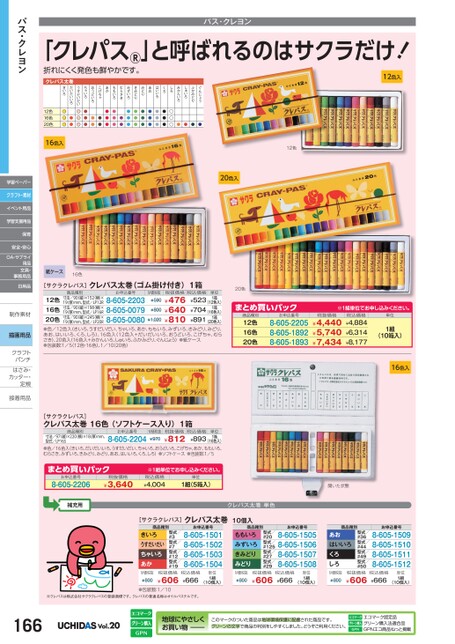 「クレパス®」と呼ばれるのはサクラだけ!パス・クレヨン[サクラクレパス]クレパス太巻(ゴム掛け付き)1箱商品種別お申込番号M価税抜¥5908-605-22038-605-00798-605-0080寸法/90(縦)×152横)×19厚)mm、型式/LP12R寸法/90(縦)×198横)×19厚)mm、型式/LP16R寸法/90(縦)×245横)×19厚)mm、型式/LP20R12色16色20色(20色入)●色/12色入(きいろ、うすだいだい、ちゃいろ、あか、ももいろ、みずいろ、きみどり、みどり、あお、はいいろ、くろ、しろ)、16色入(12色入+だいだいいろ、おうどいろ、こげちゃ、むらさき)、20色入(16色入+みかんいろ、しゅいろ、ふかみどり、ぐんじょう)●紙ケース●包装数:1/512色・16色)、1/10(20色)税抜価格税込価格¥523¥704¥891¥476¥640¥810(12色入)(16色入)単位1箱¥1,0201箱1箱¥800まとめ買いパック商品種別12色16色20色お申込番号8-605-22058-605-18928-605-1893[サクラクレパス]クレパス太巻16色(ソフトケース入り)1箱商品種別お申込番号税抜価格寸法/97縦)×220横)×18厚)mm、(16色入)型式/LP16S●色/16色入(きいろ、だいだいいろ、うすだいだい、ちゃいろ、おうどいろ、こげちゃ、あか、ももいろ、むらさき、みずいろ、きみどり、みどり、あお、はいいろ、くろ、しろ)●ソフトケース●包装数:1/58-605-2204¥812M価税抜¥970税込価格¥893単位1箱まとめ買いパックお申込番号8-605-2206税抜価格¥3,640※1組単位申込。税込価格¥4,004単位1組(5箱入)開いた状態補充用クレパス太巻単色[サクラクレパス]クレパス太巻10個入商品種別きいろうすだいだいちゃいろあか型式/#3型式/#7型式/#12型式/#19税抜価格¥606M価税抜¥800お申込番号8-605-15018-605-15028-605-15038-605-1504税込価格¥666単位1組(10個入)商品種別ももいろみずいろきみどりみどり型式/#20型式/#125型式/#27型式/#29税抜価格¥606M価税抜¥800お申込番号8-605-15058-605-15068-605-15078-605-1508税込価格¥666単位1組(10個入)商品種別あおはいいろくろしろ型式/#36型式/#44型式/#49型式/#50税抜価格¥606M価税抜¥800お申込番号8-605-15098-605-15108-605-15118-605-1512税込価格¥666単位1組(10個入)※クレパスは株式会社サクラクレパスの登録商標です。クレパスの普通名称はオイルパステルです。●包装数:1/10166Vol.20地球にやさしくお買い物このマークのついた商品は地球環境保護に配慮された商品です。グリーンの文字で商品の判別をしやすくしました。どうぞご利用ください。エコマーク認定品グリーン購入法適合品GPNエコ商品ねっと掲載12色入※1組単位申込。税抜価格税込価格¥4,440¥4,884¥5,740¥6,314¥7,434¥8,177単位1組(10箱入)16色入12色20色入20色ぐんじょうふかみどりしゅいろみかんいろ●●●●しろくろ●●●●●●はいいろ●●●あお●●●みどり●●●きみどり●●●みずいろ●●●むらさき●●ももいろ●●●あか●●●こげちゃおうどいろ●●●●ちゃいろ●●●うすだいだい●●●だいだいいろきいろクレパス太巻12色16色20色●●●●●16色入紙ケース16色折れにくく発色も鮮やかです。パス・クレヨン学習ペーパークラフト・素材イベント用品学習支援用品保育安全・安心OA・サプライ用品文具・事務用品日用品制作素材制作素描画用品クラフトクラフトパンチパンチはさみ・はさみカッター・カッター・定規定規接着用品接着用