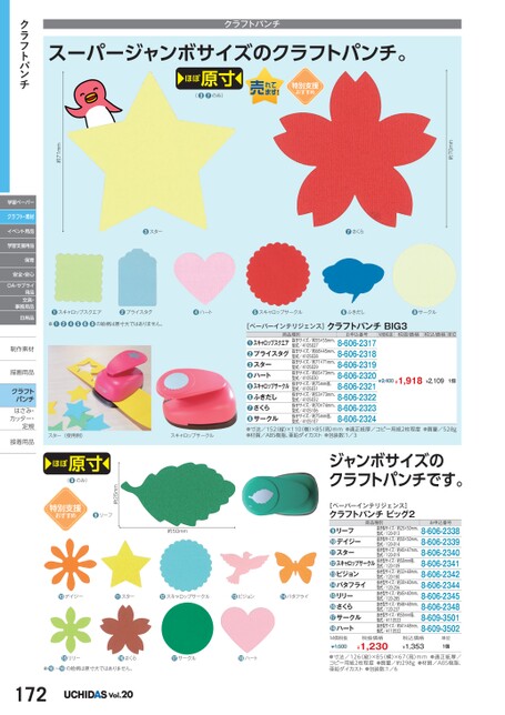 クラフトパンチスーパージャンボサイズのクラフトパンチ。ほぼ原寸(●●のみ)約70mm約71mm●スター●さくら●スキャロップスクエア●プライスタグ●ハート●スキャロップサークル●ふきだし●サークル¥2,400¥1,918¥2,1091個お申込番号8-606-23178-606-23188-606-23198-606-23208-606-23218-606-23228-606-23238-606-2324商品種別抜きサイズ/約55×55mm、型式/4105027スキャロップスクエアプライスタグ抜きサイズ/約68×45mm、スターハートスキャロップサークルふきだしさくらサークル型式/4105028抜きサイズ/約71×71mm、型式/4105029抜きサイズ/約65×73mm、型式/4105030抜きサイズ/約75mm径、型式/4105031抜きサイズ/約53×73mm、型式/4105032抜きサイズ/約70×74mm、型式/4105106抜きサイズ/約75mm径、型式/4105107●●●●●●●●※●●●●●●の絵柄は原寸大ではありません。[ペーパーインテリジェンス]クラフトパンチBIG3M価税抜税抜価格税込価格単位ジャンボサイズのクラフトパンチです。[ペーパーインテリジェンス]クラフトパンチビッグ2お申込番号8-606-23388-606-23398-606-23408-606-23418-606-23428-606-23448-606-23458-606-23488-609-35018-609-3502商品種別抜き型サイズ/約25×50mm、型式/120-013抜き型サイズ/約50×50mm、型式/120-014抜き型サイズ/約45×47mm、型式/120-019リーフデイジースタースキャロップサークル抜き型サイズ/約50mm径、ピジョンバタフライリリーさくらサークルハート型式/120-109抜き型サイズ/約32×48mm、型式/120-180抜き型サイズ/約30×40mm、型式/120-256抜き型サイズ/約45×40mm、型式/120-285抜き型サイズ/約48×48mm、型式/120-237抜き型サイズ/約50mm径、型式/4110533抜き型サイズ/約41×48mm、型式/4110532●●●●●●●●●●M価税抜¥1,500税抜価格¥1,230税込価格¥1,353単位1個●デイジー●スター●スキャロップサークル●ピジョン●バタフライ約50mm約25mm●リーフほぼ原寸(❾のみ)スター(使用例)スキャロップサークル●寸法/152(縦)×110(横)×85(高)mm●適正紙厚/コピー用紙2枚程度●質量/528g●材質/ABS樹脂、亜鉛ダイカスト●包装数:1/3クラフトパンチ学習ペーパークラフト・素材イベント用品学習支援用品保育安全・安心OA・サプライ用品文具・事務用品日用品制作素材制作素描画用品描画用品クラフトパンチはさみ・はさみカッター・カッター・定規定規接着用品接着用●リリーさくら※❿〜⓲の絵柄は原寸大ではありません。●●サークル●ハート●寸法/126(縦)×85(横)×67(高)mm●適正紙厚/コピー用紙2枚程度●質量/約298g●材質/ABS樹脂、亜鉛ダイカスト●包装数:1/6172Vol.20