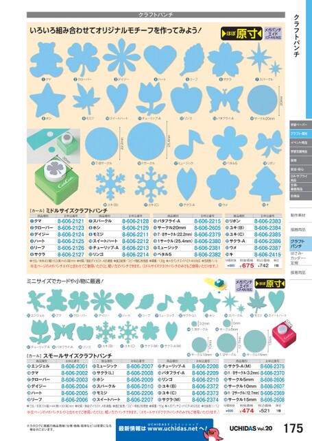 クラフトパンチ学習ペーパークラフト・素材イベント用品学習支援用品保育安全・安心OA・サプライ用品文具・事務用品日用品制作素材作描画用品描画用品クラフトパンチはさみ・さみ・カッター・カッター・定規定規接着用品着クラフトパンチいろいろ組み合わせてオリジナルモチーフを作ってみよう!ほぼ原寸メガパンチ(CP-AN)対応エイド20mm●7/8サークル●1サークル●ミュージック●ペタル5●リボン30mm25.4mm22.2mm●ホシ●モミジ●スイートハート●チューリップ-A●リンゴ●バタフライ-A●サークル20mm●クマ●クローバー●デイジー●ハート●リーフ●サクラ●スパークル●ユキ(C)●サクラ-A●ウメキ●お申込番号8-606-23838-606-23848-606-23858-606-23868-606-23878-606-2415商品種別リボンユキ(B)ユキ(C)サクラ-Aウメキ●●●●●●商品種別お申込番号8-606-2215バタフライ-A8-606-2605サークル20mm7/8サークル(22.2mm)8-606-23791サークル(25.4mm)8-606-23808-606-2381ミュージック8-606-2382ペタル5⓭⓮⓯⓰⓱⓲お申込番号8-606-21288-606-21298-606-22118-606-22128-606-22138-606-2214[カール]ミドルサイズクラフトパンチ●ユキ(B)商品種別スパークルホシモミジスイートハートチューリップ-Aリンゴ●●●⓫●●お申込番号8-606-21218-606-21238-606-21248-606-21258-606-21268-606-2127商品種別クマクローバーデイジーハートリーフサクラ●❸●●●●●寸法/本体:45幅)×53奥)×45高)mm●材質/亜鉛ダイカスト、ABS樹脂●適正紙厚/コピー用紙2枚程度●質量/138g●メガパンチエイド(CP-AN)対応●包装数:1/6※左ページのメガパンチエイドと合わせてご使用いただくと、軽い力でパンチできます。(ミドルサイズクラフトパンチのみでもご使用いただけます。)M価税抜¥880税抜価格¥675税込価格¥742単位1個ミニサイズでカードや小物に最適!メガパンチ(CP-AN)対応エイドほぼ原寸エンジェルクマクローバーデイジーハートリーフミュージックサクラ(L)ホシスパークルモミジスイートハート20mm3.2mm1/8サークル5mmサークル5mm15mm12.7mm10mmサークル10mm1/2サークルサークル15mmチューリップ-Aバタフライ-Aリンゴユキ(B)ユキ(C)サクラ(M)サクラ-A(M)[カール]スモールサイズクラフトパンチ●寸法/本体:33幅)×44(奥)×30高)mm●材質/亜鉛ダイカスト、ABS樹脂●適正紙厚/コピー用紙2枚程度●質量/55g●メガパンチエイド(CP-AN)対応●包装数:1/12※左ページのメガパンチエイドと合わせてご使用いただくと、軽い力でパンチできます。(スモールサイズクラフトパンチのみでもご使用いただけます。)M価税抜¥600税抜価格¥474税込価格¥521単位1個※カタログに掲載の商品情報(仕様・価格・税率など)は変更になる場合がございます。最新情報はUCHIDASww.uchidas.netwへ!Vol.20175商品種別お申込番号8-606-2375サクラ-A(M)1/8サークル(3.2mm)8-606-23708-606-2606サークル5mm8-606-2607サークル10mm1/2サークル(12.7mm)8-606-23698-606-2608サークル15mm●●●●●●お申込番号8-606-22088-606-22098-606-22108-606-23728-606-23738-606-2374商品種別チューリップ-Aバタフライ-Aリンゴユキ(B)ユキ(C)サクラ(M)●●●●●●お申込番号8-606-20078-606-20088-606-20098-606-20108-606-22068-606-2207商品種別ミュージックサクラ(L)ホシスパークルモミジスイートハート●●●●●●お申込番号8-606-20018-606-20028-606-20038-606-20048-606-20058-606-2006商品種別エンジェルクマクローバーデイジーハートリーフ●●●●●●
