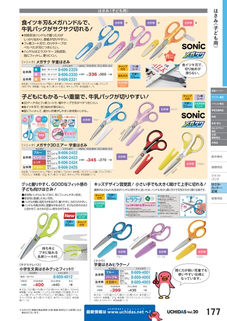 はさみ(子ども用)学習ペーパークラフト・素材イベント用品学習支援用品保育安全・安心OA・サプライ用品文具・事務用品日用品制作素材作描画用品描画用品クラフトクラフトパンチパンチはさみ・カッター・定規接着用品着はさみ(子ども用)右手用青右手用桃左手用黄食イツキ刃&メガハンドルで、牛乳パックがサクサク切れる!●対称形状ハンドルで握った力がしっかり伝わり、厚紙が切りやすい。●フッ素コート刃で、のりやテープのべたべたが刃につきにくい。●ハンドルはエラストマー2色成型。指にフィットし、滑りにくい。[ソニック]メガサク学童はさみ商品種別お申込番号M価税抜税抜価格税込価格単位右手用型式/SK-312-B青桃左手用黄●全長/150mm(キャップ除く)●刃渡り/55mm●材質/刃:ステンレス鋼、グリップ:ABS・TPE●質量/50g●フッ素コート加工●キャップ付●包装数:1/58-606-23298-606-23308-606-2331¥336¥369型式/SK-367-Y型式/SK-312-P¥4801本m55m食イツキ刃で、切り始めが滑らない。フッ素コート刃渡り55mmキャップ付き名札付き左右対称リング子どもにもかる〜い重量で、牛乳パックが切りやすい!●3Dアーチ刃とフッ素コートで、糊やテープで刃がベタつきにくい。●食イツキ刃で、切り始めが滑らない。●指にフィットして、細かい作業がしやすい非対称ハンドル。キャップ付き刃渡り55mmフッ素コート左右非対称リング右手用ピンク右手用ブルー55mm税込価格単位[ソニック]メガサク3Dエアー学童はさみお申込番号M価税抜税抜価格右手用商品種別ブルーピンクレッドイエロー型式/型式/SK-5247-B8-606-2422SK-5247-P8-606-2423SK-5247-R8-606-2424SK-5260-Y8-606-2425型式/型式/左手用●全長/150mm(キャップ除く)●刃渡り/55mm●材質/刃:ステンレス鋼、グリップ:ポリプロピレン●質量/35g●フッ素コート加工●キャップ付●包装数:1/5¥480¥345¥3791本右手用レッド左手用イエローm55mグッと握りやすく、GOODなフィット感の子ども向けはさみ!●非対称ハンドルになっており、手にフィットしやすい形状。●安全性に配慮した丸い刃先。●ハンドル内側に指支えがあるので、握りやすく、力が入れやすい。●ハンドル外側2カ所に指置きがあるので、子どもの手の大きさに合わせて、はさみの正しい持ち方ができる。キッズデザイン賞受賞!小さい手でも大きく開けて上手に切れる!通常のはさみよりも支点がハンドル(持ち手)に近いため、ハンドルを少し開くだけで刃先が大きく開く仕様です。刃渡り60mmキャップ付き左右非対称リング左右非対称リングキャップ付き刃渡り65mm5mm6持ち手とフタに貼れる名前シール付。[サクラクレパス]小学生文具はさみグッとフィット!!商品種別型式/GX152M価税抜¥480税抜価格¥400お申込番号8-609-4012税込価格¥440単位1個●寸法/62(幅)×9(奥)×154(高)mm●刃渡り/65mm●質量/47g●材質/ハンドル:ABS樹脂・TPE樹脂、刃:ステンレス鋼、キャップ:ポリプロピレン●付属品/名前シール、キャップ付き●フッ素コート加工●グルーレス加工●包装数:1/10mm60右手用ブルー右手用パープル左手用イエロー[クツワ]学童はさみヒラクーノ商品種別ブルーパープルイエロー型式/SS115BL型式/SS115PU型式/SS115Lお申込番号8-609-40018-609-40028-609-4003開く力が弱い児童でも使いやすい仕様となっています。右手用左手用M価税抜¥500税抜価格¥399税込価格¥438単位1本●寸法/149(縦)×57(横)×14(厚)mm●刃渡り/60mm●質量/37g●材質/刃:ステンレス、ハンドル:ABS・エラストマー●包装数:1/5※カタログに掲載の商品情報(仕様・価格・税率など)は変更になる場合がございます。最新情報はUCHIDASww.uchidas.netwへ!Vol.20177