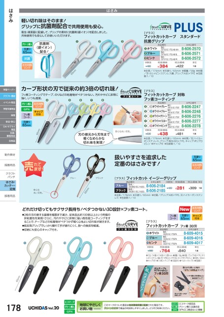 [プラス]フィットカットカーブスタンダード抗菌グリップお申込番号8-606-25708-606-25718-606-2572商品種別型式/35735/SC-175S-ABWH型式/35736/SC-175S-AB型式/35737/SC-175S-ABBL●ホワイト●●ブルー●ピンク●M価税抜¥480税抜価格¥384PK税込価格¥422単位1本お申込番号8-606-22478-606-22488-606-22768-606-22778-606-2278商品種別34515/SC-175SF34516/SC-175SF34545/SC-175SF34546/SC-175SF34547/SC-175SF●●●ホワイト×グレー型式/●●●ホワイト×ブルー型式/●●●ホワイト×グリーン型式/●●●ホワイト×イエロー型式/●●●ホワイト×ピンク型式/❹●●[プラス]フィットカットカーブ対称フッ素コーティング安心な丸い刃先。M価税抜¥630税抜価格¥438税込価格¥481単位1本●全長/174mm●刃渡り/65mm●材質/刃:ハイカーボンステンレス、グリップ:再生ABS+TPE、キャップ:ポリプロピレン●キャップ付●包装数:1/10扱いやすさを追求した定番のはさみです!刃渡り65mm左右対称リング[プラス]フィットカットイージーグリップお申込番号商品種別型式/34380/SC-165S型式/34381/SC-165Sブルーブラック●全長/176mm●刃渡り/65mm●材質/グリップ:ABS+TPE、刃:ハイカーボンステンレス●包装数:1/108-606-21848-606-2185¥281¥309税込価格単位税抜価格M価税抜¥4201本65mm●全長/174mm●刃渡り/65mm●質量/58g●材質/刃・カシメピン:ステンレス鋼、グリップ:ABS+TPE●包装数:1/10はさみ軽い切れ味はそのまま!グリップに抗菌剤配合で共用使用も安心。衛生・清潔面に配慮して、グリップの素材に抗菌剤(銀イオン)を配合しました。共有使用でも安心してお使いいただけます。●●●抗菌剤(銀イオン)配合!刃渡り65mm抗菌左右対称リングカーブ形状の刃で従来の約3倍の切れ味!フッ素コーティングでテープ、のりなどの粘着物がベタつかない。汚れやサビに非常に強く、いつも清潔。●●●●●刃の根元から刃先まで軽くなめらかな切れ味を実現!左右対称リングキャップ付き65mmフッ素コート刃渡り65mmブルーブラック安心な丸い刃先。mm56●寸法/74幅)×174(高)×13厚)mm●質量/58g●材質/グリップ:ABS+TPE、刃・カシメピン:ステンレス鋼、がたつき防止リング:POM、キャップ:ポリプロピレン●刃渡り/65mm●キャップ付き●フッ素コーティング●3D設計刃●ベルヌーイカーブ刃●包装数:1Vol.20地球にやさしくお買い物このマークのついた商品は地球環境保護に配慮された商品です。グリーンの文字で商品の判別をしやすくしました。どうぞご利用ください。エコマーク認定品グリーン購入法適合品GPNエコ商品ねっと掲載左右対称リングキャップ付きお申込番号8-609-40158-609-40168-609-4017税込価格¥840単位1本商品種別型式/35255/SC-175SFN型式/35256/SC-175SFN型式/35257/SC-175SFN●ホワイト●●ブルー●ピンクM価税抜¥980税抜価格¥764フッ素コート刃渡り65mm[プラス]フィットカットカーブフッ素3D刃どれだけ切ってもサクサク長持ち!ベタつかない3D設計×フッ素コート。●2枚の刃の接する面積を極限まで減少、従来品比約100倍以上という究極の非粘着性を実現!さらに、汚れやサビに非常に強い高性能コーティングをすることで、テープなどの粘着物がベタつかず軽く心地よい切れ味が続きます。●低反発グリップでしっかり握れて手が疲れにくく、指への負担を軽減。●収納にも安心のキャップ付き。●●●はさみ学習ペーパークラフト・素材イベント用品学習支援用品保育安全・安心OA・サプライ用品文具・事務用品日用品制作素材制作素描画用品描画用品クラフトクラフトパンチパンチはさみ・カッター・定規接着用品接着用mm56178