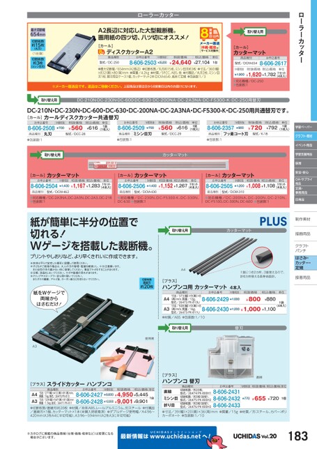ローラーカッター学習ペーパークラフト・素材イベント用品学習支援用品保育安全・安心OA・サプライ用品文具・事務用品日用品制作素材作描画用品描画用品クラフトクラフトパンチパンチはさみ・カッター・定規接着用品着最大切断幅654mm切断枚数約15枚(丸刃)(1往復)切断枚数約3枚(ミシン目刃)ローラーカッターA2長辺に対応した大型裁断機。画用紙の四ツ切、八ツ切にオススメ!取り替え用[カール]ディスクカッターA2商品種別型式/DC-250お申込番号M価税抜8-606-2503¥35,200沖縄・離島はサービス対象外税抜価格¥24,640税込価格¥27,104単位1台●最大切断幅/654mm(A2長辺)●切断枚数/丸刃約15枚、ミシン目刃約3枚●寸法/360(幅)×832(奥)×80高)mm●質量/4.2kg●材質/SPCC、ABS、他●付属品/丸刃2枚、ミシン目刃1枚、替刃用空ケース1個、カッターマット2本(DCM-654)、紙あて定規●包装数:1/3※メーカー直送品です。返品はご容赦ください。上記商品は受注日から8営業日以内のお届けになります。[カール]カッターマット商品種別型式/DCM-654お申込番号8-606-2617M価税抜¥1,900税抜価格税込価格¥1,620¥1,7821セット(4本入)単位●対応機種/DC-250●包装数:1取り替え用DC-210N・DC-230N・DC-600・DC-630・DC-200NA・DC-2A3NA・DC-F5300-K・DC-250用替刃DC-210N・DC-230N・DC-600・DC-630・DC-200NA・DC-2A3NA・DC-F5300-K・DC-250用共通替刃です。[カール]カールディスクカッター共通替刃お申込番号8-606-2508M価税抜¥700税抜価格¥560税込価格¥616単位1袋(1枚入)お申込番号8-606-2509M価税抜¥700税抜価格¥560税込価格¥616単位1袋(1枚入)お申込番号8-606-2357M価税抜¥900税抜価格¥720税込価格¥792単位1袋(1枚入)丸刃商品種別●包装数:1型式/DCC-28ミシン目刃商品種別●包装数:1フッ素コート刃型式/K-18商品種別●包装数:1取り替え用型式/DCC-29カッターマット[カール]カッターマットお申込番号8-606-2504M価税抜¥1,400商品種別型式/DCM-462税抜価格税込価格¥1,167¥1,283単位1セット(4本入)[カール]カッターマットお申込番号8-606-2506M価税抜¥1,400商品種別型式/DCM-430税抜価格税込価格¥1,152¥1,267単位1セット(4本入)[カール]カッターマットお申込番号8-606-2505M価税抜¥1,200商品種別型式/DCM-310税抜価格税込価格¥1,008¥1,1081セット(4本入)単位●対応機種/DC-2A3NA、DC-2A3N、DC-2A3、DC-218●包装数:1●対応機種/DC-230N、DC-F5300-K、DC-330N、DC-630●包装数:1●対応機種/DC-200NA、DC-200N、DC-210N、DC-F5100、DC-300N、DC-600●包装数:1紙が簡単に半分の位置で切れる!Wゲージを搭載した裁断機。プリントやしおりなど、より早くきれいに作成できます。取り替え用カッターマット※本体は平らで安定した場所に設置しご使用ください。※子どもがご使用の場合は、大人の方の管理・監督を確実にし、十分注意願います。また幼児の手の届かない所に保管してください。事故でケガをすることがあります。※分解、改造をしないでください。ケガや破損の恐れがあります。※クリップやステープラー針は取り除いてください。またガラス繊維、アルミ箔、カーボン紙などを切らないでください。紙をWゲージで両端からはさむだけ!A3切断枚数直線刃約20枚使用例[プラス]スライドカッターハンブンコ商品種別お申込番号M価税抜税抜価格税込価格単位寸法/277幅)×412奥)×81(高)mm、質量/1kg、型式/26470/PK-813寸法/329(幅)×547奥)×81高)mm質量/1.5kg、型式/26471/PK-811A4A3●切断枚数/直線刃:約20枚●材質/本体:ABS、レール:アルミニウム、刃:スチール●付属品/直線刃×1個、カッターマット×1本(※購入時装着済)●ダブルゲージ使用幅/A4:96〜420mm(A3をA4に半切可能)、A3:96〜594mm(A2をA3に半切可能)8-606-2427¥6,600¥4,950¥5,4458-606-2428¥12,000¥9,001¥9,9011台A41面につき2カ所、3面使えるので、計6カ所使える長寿命設計。[プラス]ハンブンコ用カッターマット4本入商品種別A4A3寸法/373幅)×9(奥)×8(高)mm、質量/12g、型式/26472/PK-813U寸法/508幅)×9(奥)×8(高)mm、質量/16g、型式/26473/PK-811Uお申込番号M価税抜税抜価格8-606-2429¥1,0008-606-2430¥1,200¥1,000¥1,100¥800単位税込価格¥8801袋(4本入)●材質/ABS●包装数:1/10取り替え用替刃直線[プラス]ハンブンコ替刃商品種別お申込番号M価税抜税抜価格税込価格単位切断枚数/約20枚、型式/26474/PK-800H1切断枚数/約3枚(目安)、型式/26475/PK-800H2切断枚数/約3枚(目安)、型式/26476/PK-800H3直線ミシン目折り目●寸法/39(幅)×20(奥)×36(高)mm●質量/15g●材質/刃:スチール、カバー:ポリカーボネート●包装数:1/108-606-24318-606-24328-606-2433¥655¥720¥7701個※カタログに掲載の商品情報(仕様・価格・税率など)は変更になる場合がございます。最新情報はUCHIDASww.uchidas.netwへ!Vol.20183