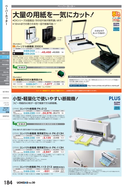 ペーパーカッター大量の用紙を一気にカット!●DXシリーズは国産品!刃の切れ味が断然違います!●18mmまでの厚さの本を一回で断裁可能!!小さな力でカットできます。立て置き収納時沖縄・離島はサービス対象外最大切断幅306mm切断枚数約200枚[Durodex]パーソナル断裁機200DX商品種別お申込番号M価税抜税抜価格税込価格単位8-606-2434オープン8-606-2435白黒●断裁幅/306mm(A4ヨコ対応)●断裁厚/18mm●切断枚数/約200枚(PPC用紙0.09mm厚で換算)●寸法/使用時:400(幅)×340奥)×420(高)mm、ハンドル収納時:400(幅)×340(奥)×170(高)mm(安全装置を含む)、立て置き収納時:400幅)×170(奥)×395(高)mm●質量/本体:約9.8kg、ケース収納時:約11kg●カットライン表示/赤色LED使用(単三電池2個付属)●運搬用カートン寸法/460幅)×215(奥)×450(高)mm(手提げ仕様)¥45,450¥49,9951台取り替え用パーソナル断裁機200DX用受木拡大[Durodex]断裁機200DX兼用受け木商品種別型式/1313182お申込番号M価税抜8-606-2471オープン税抜価格¥1,077税込価格¥1,184単位1本●寸法/410(幅)×10(奥)×10(高)mm●質量/32g●包装数:1白黒刃のメンテナンスについて断裁機200DXのメンテナンスは、安くて便利な安心らくらくメンテナンスパックで快適に!刃の交換、故障にも対応いたします!※FAXでのお申し込みとなります。お申し込みなど、詳しくはこちら!http://www.uchidas.net/pdf/duro_mainte.pdf※メーカー直送品です。返品はご容赦ください。上記商品は受注日から8営業日以内のお届けになります。小型・軽量化で使いやすい断裁機!コピー用紙約60枚が一回で裁断できる断裁機。[プラス]コンパクト断裁機PK-213商品種別型式/26366/PK-213お申込番号M価税抜税抜価格税込価格8-606-2389¥42,500¥34,976¥38,473単位1台●最大切断幅/299mm●切断枚数/約60枚(PPC用紙)●寸法/455幅)×120奥)×190(高)mm、ハンドルを含む:510(幅)mm、トレー開口時:240(奥)mm●質量/5.4kg●光るカットライン/赤色LED(右側から約210mm)●電源/単四乾電池×2個(別売)●A4半切補助ガイド付●包装数:1/4取り替え用コンパクト断裁機専用替刃・受木刃先に触れずに替刃交換ができる安全・簡単設計。[プラス]コンパクト断裁機専用替刃セットPK-213H商品種別型式/26367/PK-213Hお申込番号8-606-2390M価税抜¥3,300税抜価格¥3,135税込価格¥3,448単位1セット●寸法/396(幅)×8奥)×32(高)mm●質量/125g●付属品/刃物カバー付替刃×1枚、刃物受け×1本、ビニルタイ×2本、六角レンチ×1本●包装数:1/20[プラス]コンパクト断裁機専用替刃セットPK-113H商品種別型式/26311/PK-113Hお申込番号8-606-2354M価税抜¥3,300税抜価格¥2,947税込価格¥3,241単位1セット●寸法/396(幅)×8(奥)×32高)mm●質量/83g●付属品/カバー付替刃×1枚、六角レンチ×1本、ビニルタイ×2本、刃物受け×1本●包装数:1/20※刃先の研磨はできません。刃を交換するタイプです。※受木と替刃の交換時は本体の中に指を入れないでください。刃があります。※付属の取り扱い説明書をよくお読みになり正しくお使いください。最大切断幅299mm切断枚数約60枚使用例ペーパーカッター学習ペーパークラフト・素材イベント用品学習支援用品保育安全・安心OA・サプライ用品文具・事務用品日用品制作素材制作素描画用品描画用品クラフトクラフトパンチパンチはさみ・カッター・定規接着用品接着用[プラス]コンパクト断裁機PK-113・213専用受木2本入商品種別型式/26312/PK-113Uお申込番号8-606-2355M価税抜¥1,040税抜価格¥931税込価格¥1,024単位1セット(2本入)●寸法/390(幅)×17(奥)×6(高)mm●質量/5g●包装数:1/50184Vol.20※刃の下には絶対に手を入れないでください。※受木と替刃の交換時は本体の中に指を入れないでください。刃があります。※本体移動時には必ずハンドルロックを掛けてください。本体を傾けるとハンドルが跳ね上がりケガをする場合があります。※小さな子どもの手の届かないところに設置し触れさせないでください。※付属の取り扱い説明書をよくお読みになり正しくお使いください。
