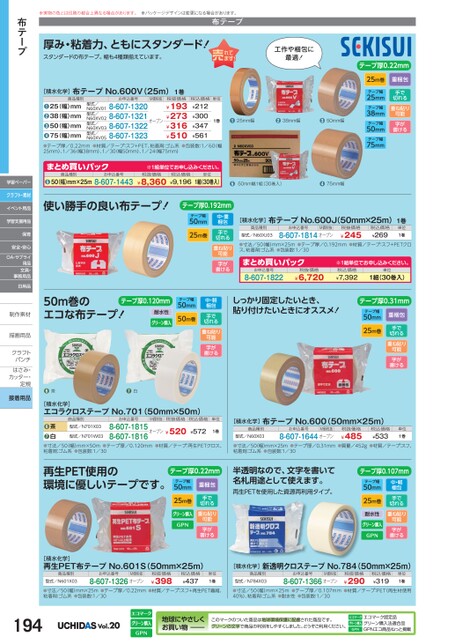 テープ厚0.22mm重梱包手で切れる重ね貼り可能字が書ける25m巻テープ幅25mmテープ幅38mmテープ幅50mmテープ幅75mm税抜価格¥193¥273¥316¥510単位1巻●25mm幅●38mm幅●50mm幅税込価格¥212¥300¥347¥561M価税抜オープン型式/N60XV01型式/N60XV02型式/N60XV03型式/N60XV05お申込番号8-607-13208-607-13218-607-13228-607-1323商品種別25(幅)mm38(幅)mm50(幅)mm75(幅)mm●●●●[積水化学]布テープNo.600V(25m)1巻●テープ厚/0.22mm●材質/テープ:スフ+PET、粘着剤:ゴム系●包装数:1/60(幅25mm)、1/36(幅38mm)、1/30(幅50mm)、1/24幅75mm)まとめ買いパック商品種別●50(幅)mm×25mお申込番号8-607-1443※1組単位申込。税抜価格税込価格¥8,360¥9,196単位1組(30巻入)●50mm幅1組(30巻入)●75mm幅※実物の色とは印刷の都合上異なる場合があります。※パッケージデザインは変更になる場合があります。布テープ厚み・粘着力、ともにスタンダード!スタンダードの布テープ。幅も4種類揃えています。工作や梱包に最適!布テープ使い勝手の良い布テープ!テープ厚0.192mm中・重梱包テープ幅50mm25m巻手で切れる重ね貼り可能字が書ける[積水化学]布テープNo.600J(50mm×25m)1巻商品種別型式/N60XJ03お申込番号M価税抜8-607-1814オープン税抜価格¥245税込価格¥269単位1巻●寸法/50幅)mm×25m●テープ厚/0.192mm●材質/テープ:スフ+PETクロス、粘着剤:ゴム系●包装数:1/30まとめ買いパック8-607-1822お申込番号税抜価格¥6,720※1組単位申込。税込価格¥7,3921組(30巻入)単位50m巻のエコな布テープ!テープ厚0.120mm耐水性テープ幅50mm50m巻しっかり固定したいとき、貼り付けたいときにオススメ!中・軽梱包手で切れる重ね貼り可能字が書けるテープ厚0.31mmテープ幅50mm25m巻重梱包手で切れる重ね貼り可能字が書ける●茶●白[積水化学]布テープNo.600(50mm×25m)商品種別型式/N60X03お申込番号M価税抜8-607-1644オープン税抜価格¥485税込価格¥533単位1巻商品種別型式/N701X03型式/N701W03お申込番号M価税抜税抜価格税込価格8-607-1815オープン¥5208-607-1816¥572単位1巻茶白●●[積水化学]エコラクロステープNo.701(50mm×50m)●寸法/50(幅)mm×50m●テープ厚/0.120mm●材質/テープ:再生PETクロス、粘着剤:ゴム系●包装数:1/30●寸法/50幅)mm×25m●テープ厚/0.31mm●質量/452g●材質/テープ:スフ、粘着剤:ゴム系●包装数:1/30再生PET使用の環境に優しいテープです。テープ厚0.22mmテープ幅50mm25m巻重梱包手で切れる重ね貼り可能字が書ける半透明なので、文字を書いて名札用途として使えます。再生PETを使用した資源再利用タイプ。テープ厚0.107mmテープ幅50mm25m巻耐水性中・軽梱包手で切れる重ね貼り可能字が書ける学習ペーパークラフト・素材イベント用品学習支援用品保育安全・安心OA・サプライ用品文具・事務用品日用品制作素材制作素描画用品描画用品クラフトクラフトパンチパンチはさみ・はさみカッター・カッター・定規定規接着用品[積水化学]再生PET布テープNo.601S(50mm×25m)商品種別型式/N601X03お申込番号M価税抜8-607-1326オープン税抜価格¥398税込価格¥437単位1巻[積水化学]新透明クロステープNo.784(50mm×25m)商品種別型式/N784X03お申込番号M価税抜8-607-1366オープン税抜価格¥290税込価格¥319単位1巻●寸法/50(幅)mm×25m●テープ厚/0.22mm●材質/テープ:スフ+再生PET繊維、粘着剤:ゴム系●包装数:1/30●寸法/50幅)mm×25m●テープ厚/0.107mm●材質/テープ:PET再生材使用40%)、粘着剤:ゴム系●耐水性●包装数:1/30194Vol.20地球にやさしくお買い物このマークのついた商品は地球環境保護に配慮された商品です。グリーンの文字で商品の判別をしやすくしました。どうぞご利用ください。エコマーク認定品グリーン購入法適合品GPNエコ商品ねっと掲載