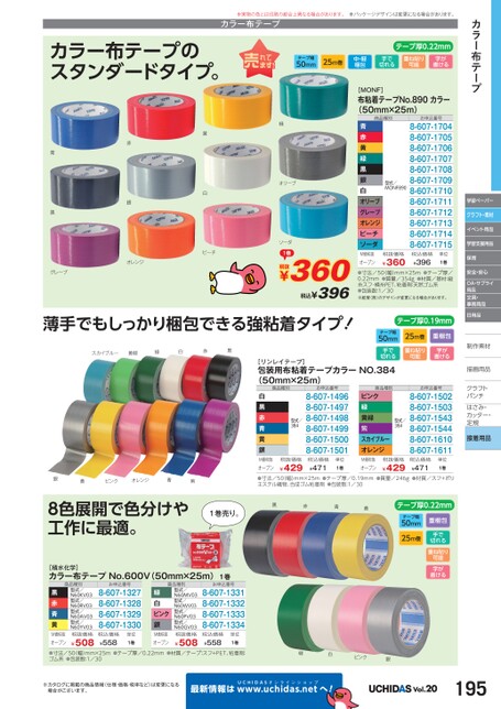 カラー布テープ学習ペーパークラフト・素材イベント用品学習支援用品保育安全・安心OA・サプライ用品文具・事務用品日用品制作素材作描画用品描画用品クラフトクラフトパンチパンチはさみ・さみ・カッター・カッター・定規定規接着用品※実物の色とは印刷の都合上異なる場合があります。カラー布テープ※パッケージデザインは変更になる場合があります。テープ幅50mm25m巻中・軽梱包手で切れる重ね貼り可能字が書けるテープ厚0.22mm緑オリーブソーダ1巻税抜¥360税込¥396[MONF]布粘着テープNo.890カラー(50mm×25m)商品種別青赤黄緑黒銀白オリーブグレープオレンジピーチソーダ型式/MONF890お申込番号8-607-17048-607-17058-607-17068-607-17078-607-17088-607-17098-607-17108-607-17118-607-17128-607-17138-607-17148-607-1715単位1巻税抜価格¥360税込価格¥396M価税抜オープン●寸法/50(幅)mm×25m●テープ厚/0.22mm●質量/354g●材質/基材:縦糸スフ・横糸PET、粘着剤:天然ゴム系●包装数:1/30※紙管(筒)のデザインが変更になる場合があります。テープ幅50mmテープ厚0.19mm25m巻重ね貼り可能重梱包字が書けるカラー布テープのスタンダードタイプ。赤銀黄白オレンジピーチ青黒グレープ薄手でもしっかり梱包できる強粘着タイプ!スカイブルー黄緑緑白赤黒銀黄ピンクオレンジ青紫8色展開で色分けや工作に最適。1巻売り。[積水化学]カラー布テープNo.600V(50mm×25m)1巻黒赤青黄商品種別型式/N60KV03型式/N60RV03型式/N60AV03型式/N60YV03税抜価格お申込番号8-607-13278-607-13288-607-13298-607-1330緑白ピンク銀商品種別型式/N60MV03型式/N60WV03型式/N60PV03型式/N60GV03税抜価格お申込番号8-607-13318-607-13328-607-13338-607-1334¥508M価税抜オープン●寸法/50(幅)mm×25m●テープ厚/0.22mm●材質/テープ:スフ+PET、粘着剤:ゴム系●包装数:1/30税込価格¥558税込価格¥558¥508M価税抜オープン単位1巻単位1巻手で切れる[リンレイテープ]包装用布粘着テープカラーNO.384(50mm×25m)商品種別白黒赤青黄銀お申込番号8-607-14968-607-14978-607-14988-607-14998-607-15008-607-1501商品種別ピンク緑黄緑紫スカイブルーオレンジ型式/384お申込番号8-607-15028-607-15038-607-15438-607-15448-607-16108-607-1611型式/384税抜価格¥429M価税抜オープン●寸法/50(幅)mm×25m●テープ厚/0.19mm●質量/246g●材質/スフ+ポリエステル織物、合成ゴム粘着剤●包装数:1/30税込価格¥471税込価格¥471¥429M価税抜オープン税抜価格単位1巻単位1巻黒赤青黄テープ厚0.22mmテープ幅50mm25m巻重梱包手で切れる重ね貼り可能字が書ける緑白ピンク銀※カタログに掲載の商品情報(仕様・価格・税率など)は変更になる場合がございます。最新情報はUCHIDASww.uchidas.netwへ!Vol.20195