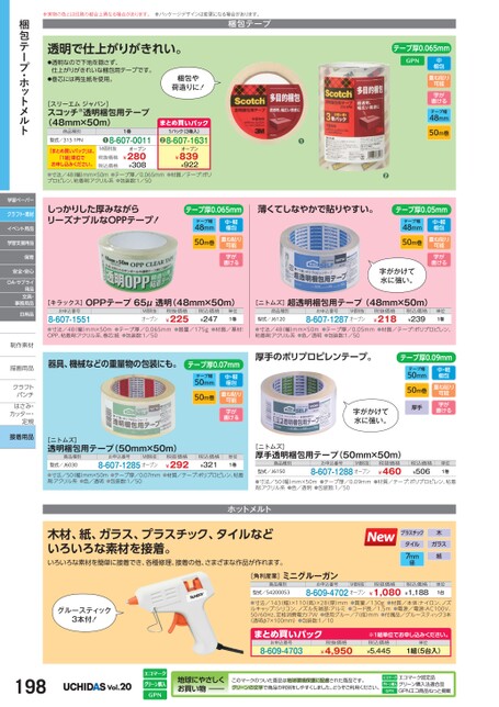 包中梱重ね貼り可能字が書けるテープ幅48mm50m巻テープ厚0.065mm●※実物の色とは印刷の都合上異なる場合があります。※パッケージデザインは変更になる場合があります。梱包テープ透明で仕上がりがきれい。●透明なので下地を隠さず、仕上がりがきれいな梱包用テープです。●巻芯には再生紙を使用。[スリーエムジャパン]スコッチ透明梱包用テープ(48mm×50m)商品種別型式/3131PN●1巻8-607-0011「まとめ買いパック」は、「1組」単位でお申し込みください。M価税抜税抜価格税込価格オープン¥280¥308梱包や荷造りに!まとめ買いパック1パック(3巻入)8-607-1631●オープン¥839¥922●寸法/48(幅)mm×50m●テープ厚/0.065mm●材質/テープ:ポリプロピレン、粘着剤:アクリル系●包装数:1/50●しっかりした厚みながらリーズナブルなOPPテープ!テープ厚0.065mm薄くてしなやかで貼りやすい。テープ幅48mm50m巻中・軽梱包重ね貼り可能字が書けるテープ厚0.05mm中・軽梱包テープ幅48mm50m巻重ね貼り可能字が書ける字がかけて水に強い。[キラックス]OPPテープ65μ透明(48mm×50m)[ニトムズ]超透明梱包用テープ(48mm×50m)お申込番号8-607-1551M価税抜オープン税抜価格¥225税込価格¥247単位1巻商品種別型式/J6120お申込番号M価税抜8-607-1287オープン税抜価格¥218税込価格¥239単位1巻●寸法/48(幅)mm×50m●テープ厚/0.065mm●質量/175g●材質/基材:OPP、粘着剤:アクリル系、巻芯:紙●包装数:1/50●寸法/48(幅)mm×50m●テープ厚/0.05mm●材質/テープ:ポリプロピレン、粘着剤:アクリル系●色/透明●包装数:1/50器具、機械などの重量物の包装にも。テープ厚0.07mm中・軽梱包テープ幅50mm50m巻重ね貼り可能字が書ける[ニトムズ]透明梱包用テープ(50mm×50m)商品種別型式/J6030お申込番号M価税抜8-607-1285オープン税抜価格¥292税込価格¥321単位1巻●寸法/50(幅)mm×50m●テープ厚/0.07mm●材質/テープ:ポリプロピレン、粘着剤:アクリル系●色/透明●包装数:1/50厚手のポリプロピレンテープ。テープ厚0.09mm中・軽梱包テープ幅50mm50m巻重ね貼り可能字が書ける字がかけて水に強い。厚手[ニトムズ]厚手透明梱包用テープ(50mm×50m)商品種別型式/J6150お申込番号M価税抜8-607-1288オープン税抜価格¥460税込価格¥506単位1巻●寸法/50幅)mm×50m●テープ厚/0.09mm●材質/テープ:ポリプロピレン、粘着剤:アクリル系●色/透明●包装数:1/50梱包テープ・ホットメルト学習ペーパークラフト・素材イベント用品学習支援用品保育安全・安心OA・サプライ用品文具・事務用品日用品制作素材制作素描画用品描画用品クラフトクラフトパンチパンチはさみ・はさみカッター・カッター・定規定規接着用品ホットメルト木材、紙、ガラス、プラスチック、タイルなどいろいろな素材を接着。いろいろな素材を簡単に接着でき、各種修理、接着の他、さまざまな作品が作れます。[角利産業]ミニグルーガン商品種別型式/54200053お申込番号M価税抜8-609-4702オープンプラスチック木タイル7mm径ガラス紙税抜価格¥1,080税込価格¥1,188単位1台グルースティック3本付!●寸法/143(幅)×110高)×28(厚)mm●質量/130g●材質/本体:ナイロン、ノズルキャップ:シリコン、ノズル先端部:アルミ●コード長/1.5m●電源/電源:AC100V、50/60Hz、定格消費電力:7W●使用グルー/7(径)mm●付属品/グルースティック3本(透明φ7×100mm)●包装数:1/10まとめ買いパックお申込番号8-609-4703税抜価格¥4,950※1組単位申込。税込価格¥5,4451組(5台入)単位198Vol.20地球にやさしくお買い物このマークのついた商品は地球環境保護に配慮された商品です。グリーンの文字で商品の判別をしやすくしました。どうぞご利用ください。エコマーク認定品グリーン購入法適合品GPNエコ商品ねっと掲載