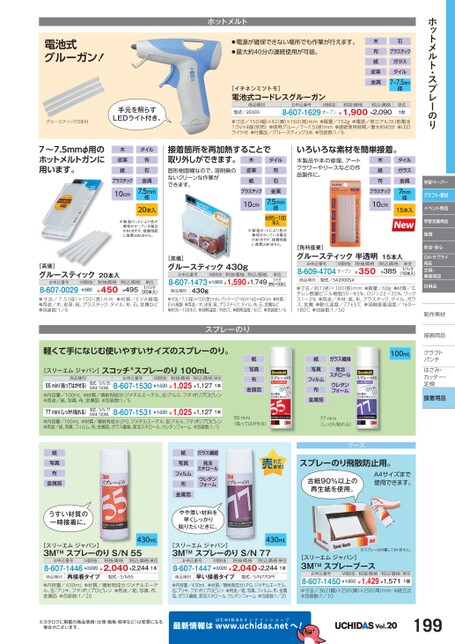 ホットメルト・スプレーのり学習ペーパークラフト・素材イベント用品学習支援用品保育安全・安心OA・サプライ用品文具・事務用品日用品制作素材作描画用品描画用品クラフトクラフトパンチパンチはさみ・さみ・カッター・カッター・定規定規接着用品軽くて手になじむ使いやすいサイズのスプレーのり。[スリーエムジャパン]スコッチスプレーのり100mL商品種別お申込番号M価税抜税抜価格税込価格単位MINI100ML8-607-1530¥1,520¥1,025¥1,1271本55mini貼ってはがせる)型式/S/N55●内容量/100mL●材質/噴射剤成分:ジメチルエーテル、缶:アルミ、フタ:ポリプロピレン●用途/紙、写真、布、金属箔●包装数:1/577mini(しっかり貼れる)型式/S/N77●内容量/100mL●材質/噴射剤成分:LPG、ジメチルエーテル、缶:アルミ、フタ:ポリプロピレン●用途/紙、写真、フィルム、布、金属箔、ガラス繊維、発泡スチロール、ウレタンフォーム●包装数:1/58-607-1531¥1,520¥1,025¥1,1271本100MLMINI100mL紙写真布金属箔ガラス繊維発泡スチロールウレタンフォーム紙写真フィルム布金属箔55mini(貼ってはがせる)77mini(しっかり貼れる)紙写真布金属箔うすい材質の一時接着に。ガラス繊維発泡スチロールウレタンフォーム紙写真フィルム布金属箔ブーススプレーのり飛散防止用。古紙90%以上の再生紙を使用。A4サイズまで使用できます。やや厚い材料を早くしっかり貼りたいときに。430mL[スリーエムジャパン]3MTMスプレーのりS/N55お申込番号M価税抜税抜価格税込価格単位8-607-1446¥3,020¥2,040¥2,2441本430mL[スリーエムジャパン]3MTMスプレーのりS/N77お申込番号M価税抜税抜価格税込価格単位8-607-1447¥3,020¥2,040¥2,2441本早い接着タイプ型式/S/N77OFF商品種別再接着タイプ型式/S/N55商品種別●内容量/430mL●材質/噴射剤成分:ジメチルエーテル、缶:ブリキ、フタ:ポリプロピレン●用途/紙、写真、布、金属箔●包装数:1/20●内容量/430mL●材質/噴射剤成分:LPG、ジメチルエーテル、缶:ブリキ、フタ:ポリプロピレン●用途/紙、写真、フィルム、布、金属箔、ガラス繊維、発泡スチロール、ウレタンフォーム●包装数:1/20※カタログに掲載の商品情報(仕様・価格・税率など)は変更になる場合がございます。最新情報はUCHIDASww.uchidas.netw※スプレーは付属しておりません。[スリーエムジャパン]3MTMスプレーブースお申込番号M価税抜税抜価格税込価格単位8-607-1450¥1,850¥1,429¥1,5711個●寸法/362(幅)×250(奥)×250高)mm●組立式●包装数:1/10へ!Vol.20199ホットメルト●電源が確保できない場所でも作業が行えます。●最大約40分の連続使用が可能。木布紙皮革金属石プラスチックガラスタイル7〜7.5mm径[イチネンミツトモ]電池式コードレスグルーガン商品種別型式/20303お申込番号M価税抜税抜価格税込価格8-607-1629オープン¥1,900¥2,090単位1台●寸法/150(幅)×42(奥)×160高)mm●質量/152g●電源/単三アルカリ乾電池1.5V×4個(別売)●使用グルー/7〜7.5(径)mm●連続使用時間/最大約40分●LEDライト付●付属品/グルースティック3本●包装数:1/6タイルガラス金属7mm径15本入木布紙プラスチック10cm木製品や本の修理、アートフラワーやリースなどの作品製作に。いろいろな素材を簡単接着。[角利産業]グルースティック半透明15本入お申込番号M価税抜8-609-4704オープン商品種別型式/54200054税抜価格¥350税込価格¥385単位1パック(15本入)●寸法/約7(径)×100(長)mm●質量/60g●材質/エチレン酢酸ビニル樹脂55〜65%、ロジン22〜35%、ワックス1〜2%●用途/木材、紙、布、プラスチック、タイル、ガラス、金属●軟化温度/77±5℃●溶融接着温度/160〜180℃●包装数:1/50約95〜100本入※製造ロットにより色が黄味がかっている場合がありますが、接着性能に差異はありません。接着箇所を再加熱することで取り外しができます。木タイル石布金属.5mm7径固形樹脂糊なので、溶剤臭のないクリーンな作業ができます。皮革紙プラスチック10cm[高儀]グルースティック430gお申込番号M価税抜税抜価格税込価格8-607-1473¥1,950¥1,590¥1,749単位1パック(約95〜100本入)商品種別430g●寸法/7.5径)×100(長)mm、パッケージ:160×160×40mm●材質/EVA樹脂●用途/木、皮革、紙、プラスチック、タイル、布、石、金属など●約95〜100本入●溶解温度/約85℃●耐熱温度/65℃●包装数:1/6スプレーのりプラスチック10cm金属.5mm7径20本入※製造ロットにより色が黄味がかっている場合がありますが、接着性能に差異はありません。グルースティック3本付手元を照らすLEDライト付き。タイル石布木皮革紙7〜7.5mmφ用のホットメルトガンに用います。電池式グルーガン![高儀]グルースティック20本入お申込番号8-607-0029M価税抜¥580税抜価格¥450(20本入)●寸法/7.5(径)×100(長)mm●材質/EVA樹脂●用途/木、皮革、紙、プラスチック、タイル、布、石、金属など●包装数:1/6税込価格¥495単位1パック