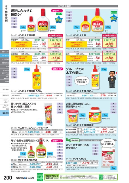 180g大●※パッケージデザインが変更になる場合があります。1本8-607-0031M価税抜税抜価格税込価格オープン¥158¥173まとめ買いパック1組(20本入)8-607-1153オープン¥3,020¥3,322●用途/木、紙、布、石膏●材質/接着剤成分:酢酸ビニル樹脂●包装数:1/2050g)学習ペーパークラフト・素材イベント用品●速乾大商品種別容量/180g、型式/#10832「まとめ買いパック」は、「1組」単位でお申し込みください。1本8-607-1095M価税抜税抜価格税込価格オープン¥378¥4151組(10本入)8-607-1156オープン¥3,610¥3,971❹大商品種別容量/180g、型式/#10132「まとめ買いパック」は、「1組」単位でお申し込みください。1本8-607-0032M価税抜税抜価格税込価格オープン¥301¥3311組(10本入)8-607-1154オープン¥2,880¥3,168学習支援用品●用途/木、紙、布、石膏●材質/接着剤成分:酢酸ビニル樹脂●包装数:1/10(180g)●用途/木、紙、布、石膏●材質/接着剤成分:酢酸ビニル樹脂●包装数:1/10180g)速乾タイプグループでの木工作業に。500g小分けしやすい容器はコレ!木紙布石膏500g木紙布石膏[コニシ]ボンド木工用速乾500g商品種別型式/#40007お申込番号M価税抜8-607-1308オープン税抜価格¥644税込価格¥708単位1本●用途/木、紙、布、石膏●材質/接着剤主成分:酢酸ビニル樹脂●包装数:1/10[コニシ]ボンド木工用500g商品種別型式/#40117税込価格¥636●用途/木、紙、布、石膏●材質/接着剤主成分:酢酸ビニル樹脂●包装数:1/108-607-1307オープン¥579お申込番号税抜価格M価税抜単位1本1kg●業務用1kg3kg●業務用3kg木紙布石膏大量に使うときは、コレ。業務用がおトク。木紙布石膏使いやすい細口ノズルで細かい作業に最適!●接着スピードが早く乾燥後ほぼ透明に。●安心の水性タイプ。保育安全・安心OA・サプライ用品文具・事務用品日用品制作素材制作素描画用品描画用品クラフトクラフトパンチパンチはさみ・はさみカッター・カッター・定規定規接着用品30mL[コニシ]ボンド木工用(業務用)●用途/木、紙、布、石膏●材質/接着剤成分:酢酸ビニル樹脂●包装数:1/121kg)、1/6(3kg)商品種別お申込番号M価税抜容量/1kg、型式/#401278-607-1428オープン型式/#401408-607-1429容量/3kg、税抜価格¥900税込価格¥990¥2,076¥2,283単位1本CH-18-1業務用CH-18-3業務用❺❻単位1本税込価格¥294[コニシ]木工用プレミアムハンディパック商品種別お申込番号M価税抜税抜価格30mL●用途/木、紙、布、石膏●材質/酢酸ビニル樹脂系エマルジョン形●包装数:1/108-607-1789オープン型式/#04470¥268●速乾中商品種別容量/50g、型式/#108221本8-607-1094「まとめ買いパック」は、「1組」単位で¥3,560¥3,916●用途/木、紙、布、石膏●材質/接着剤成分:酢酸ビニル樹脂●包装数:1/20(50g)¥186¥204お申し込みください。M価税抜税抜価格税込価格オープンオープンまとめ買いパック1組(20本入)8-607-1316[コニシ]ボンド木工用●中商品種別容量/50g、型式/#10122「まとめ買いパック」は、「1組」単位でお申し込みください。木工用接着剤木紙布石膏速乾タイプ180g●速乾大50g中●用途に合わせて選ぼう!50g●速乾中木紙布石膏[コニシ]ボンド木工用速乾木工用接着剤大容量でたっぷり使える。商品種別容量/3kg、型式/#40250●用途/木、紙、布、石膏●材質/接着剤主成分:酢酸ビニル樹脂●包装数:1/63kg塩ビ・金属も接着可能な木工用ボンド。速乾タイプ詰め替え用ボンド木工用詰替用木紙布石膏ボンド木工用CH18の詰替用に![コニシ]ボンドCH38お申込番号M価税抜税抜価格税込価格単位8-607-1840オープン¥1,770¥1,9471個木紙布革塩ビ金属単位商品種別型式/#05503お申込番号M価税抜8-607-1607オープン8-607-1608税抜価格¥215¥422税込価格¥236¥4641本型式/#05504●●用途/木・革・紙・布同士、または片方が塩ビ・金属の接着●材質/接着剤主成分:エチレン・酢酸ビニル樹脂●包装数:1/1050g180g●●片側が木・布・紙・革であれば塩ビ・金属も接着可能。●水性タイプなので安心・安全に使用できる。50g●多用途50g180g●多用途180g[コニシ]ボンド木工用多用途200Vol.20地球にやさしくお買い物このマークのついた商品は地球環境保護に配慮された商品です。グリーンの文字で商品の判別をしやすくしました。どうぞご利用ください。エコマーク認定品グリーン購入法適合品GPNエコ商品ねっと掲載