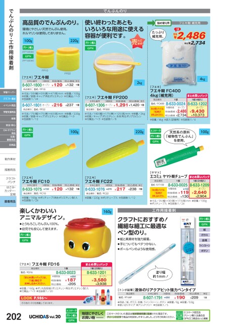 [フエキ]フエキ糊FC4004kg(補充用)単位1個商品種別型式/FC400「まとめ買いパック」は、「1組」単位でお申し込みください。1袋8-633-0024オープンM価税抜税抜価格¥2,486税込価格¥2,734まとめ買いパック1組(4袋入)8-633-1202オープン¥9,430¥10,373●容量/4kg●袋入(詰替用)●包装数:1/4天然系の原料「植物性でんぷん」を使用。100g[ヤマト]エコミュヤマト糊チューブ商品種別型式/E・T-1001個8-633-0025まとめ買いパック1組(24個入)8-633-1209M価税抜¥150「まとめ買いパック」は、「1組」単位でお申し込みください。税抜価格¥119¥130¥2,640¥2,904●寸法/35幅)×30奥)×173高)mm●容量/100g●ポリチューブ入●包装数:1/24税込価格オープン詰め替え用フエキ糊補充用たっぷり補充用。1袋税抜¥2,486税込¥2,7344kg高品質のでんぷんのり。環境にやさしい天然でんぷん使用。ホルマリンは使用しておりません。100g(FP10のみ)(FP10のみ)FP10[フエキ]フエキ糊お申込番号M価税抜8-607-1800オープン220gFP22税抜価格¥120税込価格単位¥1321個でんぷんのり使い終わったあともいろいろな用途に使える容器が便利です。2kg商品種別型式/FP10●寸法/59(幅)×59(奥)×47(高)mm●容量/100g●材質/容器・キャップ:再生ポリエチレン●付属品/ヘラ●包装数:1/248-607-1801オープン¥216¥2371個[フエキ]フエキ糊FP200お申込番号M価税抜税抜価格税込価格8-607-1306オープン¥1,291¥1,420商品種別型式/FP22商品種別型式/FP200●寸法/75(幅)×75(奥)×60(高)mm●容量/220g●材質/容器・キャップ:ポリエチレン●付属品/ヘラ●包装数:1/12●寸法/180(幅)×175(奥)×125(高)mm●容量/2kg●材質/キャップ:ポリエチレン、本体:再生ポリプロピレン●付属品/ヘラ●包装数:1/8100g220g[フエキ]フエキ糊FC10お申込番号8-633-1075M価税抜¥150税抜価格¥120税込価格単位¥1321個[フエキ]フエキ糊FC22お申込番号8-633-1076M価税抜¥270税抜価格¥217税込価格単位¥2381個商品種別型式/FC10●容量/100g●ポリチューブ(再生ポリエチレン製)入●包装数:1/24商品種別型式/FC22●容量/220g●ポリチューブ入●包装数:1/12でんぷんのり・工作用接着剤学習ペーパークラフト・素材イベント用品学習支援用品保育安全・安心OA・サプライ用品文具・事務用品日用品制作素材制作素描画用品描画用品クラフトクラフトパンチパンチはさみ・はさみカッター・カッター・定規定規接着用品楽しくかわいいアニマルデザイン。●とうもろこしでんぷん100%。●幼児でも安心して使えます。[フエキ]フエキ糊FD16商品種別型式/FD16「まとめ買いパック」は、「1組」単位でお申し込みください。1個8-633-0023M価税抜税抜価格税込価格¥250¥187¥205160g工作用接着剤クラフトにおすすめ!繊細な細工に最適なペン型のり。●紙と異素材を強力接着。●手についてもベタつかない。●ボールペンのような使用感。紙ガラス金属ラインストーンボタンまとめ買いパック1組(20個入)8-633-1201オープン¥3,580¥3,938塗り幅約1mm!●容量/160g●ポリ丸型容器(ポリエチレン・再生ポリエチレン製)入●付属品/ヘラ●包装数:1/20P.986〜その他ののりを掲載しております。[トンボ鉛筆]商品種別型式/PT-WP液体のりアクアピット強力ペンタイプお申込番号8-607-1791M価税抜¥250税抜価格¥190税込価格¥209単位1本●用途/紙、ガラス、金属、ラインストーン、ボタン●質量/8g●容量/0.8g●使い切りタイプ●アシッドフリー●包装数:1/5202Vol.20地球にやさしくお買い物このマークのついた商品は地球環境保護に配慮された商品です。グリーンの文字で商品の判別をしやすくしました。どうぞご利用ください。エコマーク認定品グリーン購入法適合品GPNエコ商品ねっと掲載