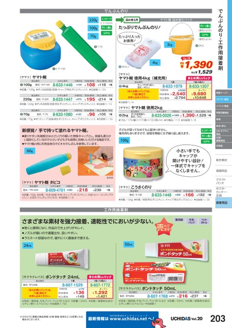 でんぷんのり・工作用接着剤学習ペーパークラフト・素材イベント用品学習支援用品保育安全・安心OA・サプライ用品文具・事務用品日用品制作素材作描画用品描画用品クラフトクラフトパンチパンチはさみ・さみ・カッター・カッター・定規定規接着用品でんぷんのり(E・P-100のみ)220g100g70g●T-70詰め替え用ヤマト糊詰め替えパックたっぷりでんぷんのり!たっぷり入ったお徳用!2kg(徳用2kgのみ)(徳用2kgのみ)●2KG●E・P-100●4KG-J4kg[ヤマト]ヤマト糊徳用4kg(補充用)2kg1個税抜¥1,390税込¥1,529まとめ買いパック[ヤマト]ヤマト糊●商品種別100g税込価格¥118●容量/100g●ポリ丸型容器(容器・キャップ:再生ポリエチレン)入●包装数:1/248-633-1446¥108M価税抜¥150型式/E・P-100お申込番号税抜価格単位1個商品種別●220g型式/P-220お申込番号8-633-1447M価税抜¥270税抜価格¥195●容量/220g●ポリ丸型容器(容器:再生ポリエチレン、キャップ:ポリエチレン)入単位1個税込価格¥214●包装数:1/12●70g商品種別型式/T-70お申込番号8-633-1080M価税抜¥120税抜価格¥96税込価格¥105単位1個●容量/70g●ポリチューブ(容器:再生ポリエチレン、キャップ:ポリエチレン)入●包装数:1/24新感覚!手で持って塗れるヤマト糊。●塗りやすい先端部分は小さい穴の開いた特殊キャップとし、容器も柔らかい設計にしているので小さい子どもでも容易にお使いいただける商品です。●ヤマト糊と同じ天然由来のタピオカでんぷんを使用しています。60g[ヤマト]ヤマト糊タピコ商品種別型式/TPK-60Hお申込番号8-609-4701使用例M価税抜¥290税抜価格¥218税込価格¥239単位1個●容量/60g●材質/本体(容器・中栓・キャップ)ポリエチレン、外装(セリース)ポリプロピレン、主成分:でんぷん(タピオカ)●包装数:1/6❸4kg商品種別キャップ付ポリ袋入、型式/4KG-J「まとめ買いパック」は、「1組」単位でお申し込みください。●包装数:1/41袋8-633-1079M価税抜¥3,500税抜価格¥2,540¥2,794税込価格1組(4袋入)8-633-1207オープン¥9,680¥10,648[ヤマト]ヤマト糊徳用2kg●2kg商品種別ポリ丸型容器入、型式/2KGお申込番号M価税抜税抜価格税込価格8-633-0026¥1,900¥1,390¥1,529単位1個●寸法/175(幅)×177(奥)×135(高)mm●付属品/ヘラ●包装数:1/8子どもが誤ってなめても心配ありません。補充用もありますので、容器を無駄にせず繰り返し使えます。100g小さい手でもキャップが開けやすい設計!一体式でキャップをなくしません。[ヤマト]こうさくのり商品種別型式/K-100お申込番号8-633-1448M価税抜¥200税抜価格¥166税込価格¥182単位1個●容量/100g●材質/容器:再生ポリエチレン、キャップ:再生ポリプロピレン●包装数:1/30工作用接着剤さまざまな素材を強力接着、速乾性でにおいが少ない。●乾くと透明になり、作品のでき上がりがキレイ。●ノズルが細いので適量出せ、扱いやすい。●ラミネート容器なので、破れにくく最後まで使える。24mL50mL画用紙牛乳パックペットボトル[サクラクレパス]ボンドタッチ24mL商品種別型式/BT24ML「まとめ買いパック」は、「1組」単位でお申し込みください。1個8-607-1529M価税抜税抜価格税込価格¥170¥136¥149まとめ買いパック1組(10個入)8-607-1772オープン¥1,292¥1,421[サクラクレパス]ボンドタッチ50mL商品種別型式/BT50MLお申込番号M価税抜8-607-1768¥270税抜価格¥216税込価格¥237単位1個●用途/画用紙、牛乳パック、ペットボトルなど●容量/24mL●材質/接着剤主成分:エチレン酢ビ・エマルジョン●包装数:1/50●用途/画用紙、牛乳パック、ペットボトルなど●容量/50mL●材質/接着剤主成分:エチレン酢ビ・エマルジョン●包装数:1※カタログに掲載の商品情報(仕様・価格・税率など)は変更になる場合がございます。最新情報はUCHIDASww.uchidas.netwへ!Vol.20203