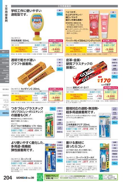 皮革合成ゴム金属硬質プラスチック木20mL1本税抜¥170税込¥187まとめ買いパック1組(20本入)8-607-1162オープン¥3,200¥3,520工作用接着剤学校工作に使いやすい速乾型です。紙50mL[セメダイン]学校用速乾50mL商品種別型式/CA-129「まとめ買いパック」は、「1組」単位でお申し込みください。1本8-607-1181M価税抜税抜価格税込価格¥270¥208¥228まとめ買いパック1組(20本入)8-607-1182オープン¥3,825¥4,207べとつかず、仕上がりがキレイ!細口ノズルで細かい作業も簡単!●色画用紙、樹脂加工紙、ケント紙など、いろいろな紙を強力に接着できます。●パンチアートやペーパークラフト、スクラップブッキング、段ボール工作に。[コニシ]ペーパーキレイ30mL(ハンディパック)商品種別型式/#04618「まとめ買いパック」は、「1組」単位でお申し込みください。1本8-607-1781オープンM価税抜税抜価格税込価格¥292¥321紙30mLまとめ買いパック1組(12本入)8-607-1797オープン¥3,300¥3,630●用途/紙●材質/主成分:酢酸ビニル樹脂●内容量/50mL●包装数:1/20●用途/紙●容量/30mL●材質/接着剤成分:変性EVA樹脂●包装数:1/12皮革・金属・硬質プラスチックの接着に。木紙竹20mL透明で乾きが速いクラフト接着剤。[セメダイン]セメダインC20mL商品種別型式/CA-1121本8-607-0035まとめ買いパック1組(20本入)8-607-1163「まとめ買いパック」は、「1組」単位で¥3,080¥3,388●用途/木、紙、竹●容量/20mL●材質/接着剤成分:セルロース系●包装数:1/20¥165¥181お申し込みください。M価税抜税抜価格税込価格¥220オープン[コニシ]速乾ボンドG17商品種別型式/#13021「まとめ買いパック」は、「1組」単位でお申し込みください。1本8-607-1101M価税抜税抜価格税込価格オープン¥170¥187●用途/皮革、合成ゴム、金属、硬質プラスチック、木●容量/20mL●材質/接着剤成分:合成ゴム系●包装数:1/20つきづらいプラスチック(ポリプロピレン・ポリエチレン)の接着もOK!●無溶剤で安心して使用できます。●曲げや衝撃、水にも強い。10mL[コニシ]ボンドウルトラ多用途SUソフト10mLお申込番号M価税抜税抜価格8-607-1790オープン¥459税込価格単位¥5041本商品種別型式/#05139●用途/多用途●容量/10mL●材質/シリル化ウレタン樹脂系無溶剤形●包装数:1/10より使いやすく進化した、多用途・高機能弾性接着剤です。[セメダイン]スーパーXお申込番号8-607-1102M価税抜¥600税抜価格¥468税込価格単位¥5141本商品種別型式/AX-043●用途/金属、ナイロン、コンクリート、天然石、木材、布地●容量/20mL●材質/主成分:変成シリコーン樹脂●包装数:1/5ガラス木皮革プラスチック金属発泡スチロールペットボトル合成ゴム金属ナイロンコンクリート天然石木材布地20mL環境対応の速乾・無溶剤・超多用途接着剤です。牛乳パック・ペットボトルや発泡スチロールなどリサイクル工作に便利です。[セメダイン]工作用速乾クリア20mLお申込番号8-607-1180M価税抜¥530税抜価格¥415税込価格単位¥4561本商品種別型式/AX-016●用途/ペットボトル、牛乳パック、発泡スチロール●内容量/20mL●材質/主成分:特殊変成シリコーンポリマー●包装数:1/10着ける素材に迷ったらコレ!2分で固まり始め、熱・水・衝撃に強く、屋内外を選ばず接着できます。[セメダイン]スーパーXゴールドお申込番号8-607-1542M価税抜¥490税抜価格¥377税込価格単位¥4141本商品種別型式/AX-023●用途/金属、皮、木材、プラスチック、陶磁器、ビニール、コンクリートなど●容量/10mL●材質/主成分:変成シリコーン樹脂●色/透明●付属品/塗布ヘラ●ベルマーク4点付●包装数:1/10ペットボトル牛乳パック発泡スチロール20mL金属皮木材プラスチック陶磁器ビニールコンクリート10mL204Vol.20地球にやさしくお買い物このマークのついた商品は地球環境保護に配慮された商品です。グリーンの文字で商品の判別をしやすくしました。どうぞご利用ください。エコマーク認定品グリーン購入法適合品GPNエコ商品ねっと掲載工作用接着剤学習ペーパークラフト・素材イベント用品学習支援用品保育安全・安心OA・サプライ用品文具・事務用品日用品制作素材制作素描画用品描画用品クラフトクラフトパンチパンチはさみ・はさみカッター・カッター・定規定規接着用品