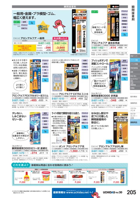 硬質プラスチック合成ゴム金属木材陶磁器3g税込価格¥382単位1本学習ペーパークラフト・素材イベント用品学習支援用品保育安全・安心OA・サプライ用品文具・事務用品日用品制作素材作描画用品描画用品クラフトクラフトパンチパンチはさみ・さみ・カッター・カッター・定規定規接着用品瞬間接着剤プラスチック合成ゴム木材陶磁器軟質塩ビ厚紙金属2g接着スピードを高めた高性能液。瞬間接着剤一般用・金属・プラ模型・ゴム、幅広く使えます。東亜合成(株)取得2g金属プラスチック合成ゴム[コニシ]アロンアルフア一般用商品種別型式/#31204「まとめ買いパック」は、「1組」単位でお申し込みください。1本8-607-1455オープンM価税抜税抜価格税込価格¥396¥435まとめ買いパック1組(10本入)8-607-1454オープン¥3,860¥4,246[コニシ]アロンアルフア速効多用途お申込番号M価税抜8-607-1452オープン商品種別型式/#04613税抜価格¥414税込価格¥455単位1本●用途/金属、プラスチック、合成ゴム●容量/2g●材質/接着剤成分:シアノアクリレート系、容器:再生ポリエチレン●包装数:1/10※容器が変更になる場合があります。●用途/プラスチック、合成ゴム、木材、陶磁器、軟質塩ビ、厚紙、金属●容量/2g●材質/接着剤成分:シアノアクリレート系●包装数:1/10●多少のすき間や凹凸面、しみ込みやすい木材・陶器・皮革にも使えます。●金属・プラ模型の製作、電化製品・機械類の組み立てと補修に。より速く!より強く!プラスチック金属合成ゴム革木材陶磁器4g小分けにした使い切りタイプ4本入りで保管の難しさ解消。金属陶磁器木材プラスチック合成ゴム0.5g×4プッシュボタンで液量コントロール。プッシュボタンで液量が調整できる液状の瞬間接着剤です。中粘度で幅広い材料に接着できます。開けても中で固まりにくい特殊容器採用。[コニシ]アロンアルフアEXTRAゼリー状スリムお申込番号M価税抜8-607-1545オープン税抜価格¥485税込価格¥533単位1本商品種別型式/#05273●用途/プラスチック、金属、合成ゴム、革、木材、陶磁器●容量/4g●材質/シアノアクリレート系●包装数:1/10[コニシ]アロンアルフアEXTRAミニ×4お申込番号M価税抜8-607-1518オープン商品種別型式/#04611税抜価格¥414税込価格¥455単位1セット(4本)●用途/金属、陶磁器、木材、プラスチック、合成ゴム●容量/0.5g×4●材質/接着剤成分:シアノアクリレート●透明プラケース付●包装数:1/10[セメダイン]瞬間接着剤3000多用途お申込番号M価税抜8-607-1478オープン税抜価格¥348商品種別型式/CA-261●用途/硬質プラスチック、合成ゴム、金属、木材、陶磁器●容量/3g●材質/接着剤成分:シアノアクリレート●包装数:1/5タレない、しみこまないゼリー状。接着時に位置合わせ修正がしやすい。硬質プラスチック合成ゴム金属木材陶磁器3gライト照射で瞬間を超える速さ。●付属の専用ライトを照射することで、硬化時間を短縮し、白化を防止できる。●盛り上げ接着や充填接着も可能。●専用ライトは目に優しいブルーライトを採用。プラスチック合成ゴム金属軟質ビニール4gはみ出し部分や皮フに付着した瞬間接着剤の除去に。誤ってついた指と指の引き離しにも!!使用例10g[セメダイン]瞬間接着剤3000ゼリー状速硬化お申込番号M価税抜8-607-1479オープン税抜価格¥374税込価格¥411単位1本商品種別型式/CA-263●用途/硬質プラスチック、合成ゴム、金属、木材、陶磁器●容量/3g●材質/接着剤成分:シアノアクリレート●包装数:1/5[コニシ]ボンドアロンアルフア光お申込番号M価税抜税抜価格税込価格8-607-1841オープン¥1,560¥1,716単位1本[コニシ]アロンアルフアはがし隊お申込番号M価税抜8-607-1633オープン税抜価格¥228税込価格¥250単位1本商品種別型式/#06009●用途/プラスチック、合成ゴム、金属、軟質ビニール●容量/4g●材質/シアノアクリレート系●包装数:1/10※ノズルの固着と白化を防ぐため、使用後は必ずノズルをしっかり拭いてください。商品種別型式/#60513●用途/瞬間接着剤のはがし液●容量/10g●包装数:1/10接着剤は用途に合わせ効果的に使おう!■木・布・紙・石膏に酢酸ビニル樹脂接着剤■大量に使うなら業務用がお得!■画用紙、牛乳パック、ペットボトルの接着にゴム系接着剤■合成ゴム・皮革・金属・硬質プラスチック・木の接着にシアノアクリレート系接着剤■金属・プラスチック・合成ゴムに■流動性の高いゼリー状タイプならボンド木工用50gP.200ボンド木工用(業務用)1kgP.200ボンドタッチ24mLP.203速乾ボンドG17P.204アロンアルフア一般用P.205アロンアルフアEXTRAゼリー状スリムP.205※カタログに掲載の商品情報(仕様・価格・税率など)は変更になる場合がございます。最新情報はUCHIDASww.uchidas.netwへ!Vol.20205