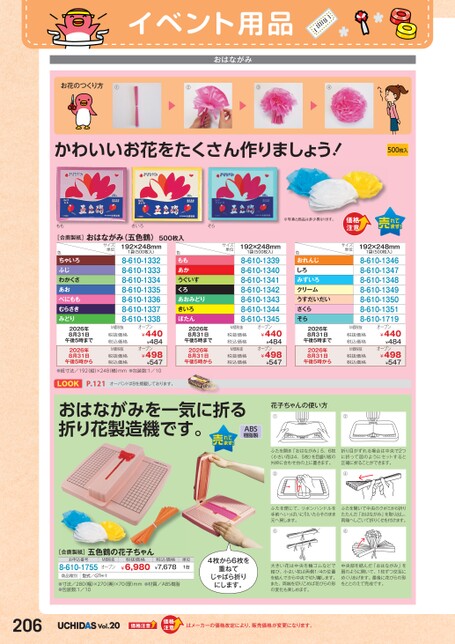 イベント用品おはながみお花のつくり方①②③④かわいいお花をたくさん作りましょう!500枚入ももきいろそら※写真と商品は多少異なります。[合鹿製紙]おはながみ(五色鶴)500枚入サイズ単位サイズ単位色ちゃいろふじわかくさあおべにももむらさきみどり1袋(500枚入)192×248mm8-610-13328-610-13338-610-13348-610-13358-610-13368-610-13378-610-1338色ももあかうぐいすくろあおみどりきいろぼたん1袋(500枚入)192×248mm8-610-13398-610-13408-610-13418-610-13428-610-13438-610-13448-610-1345色おれんじしろみずいろクリームうすだいだいさくらそら2026年8月31日午後5時まで2026年8月31日午後5時からサイズ単位1袋(500枚入)192×248mm8-610-13468-610-13478-610-13488-610-13498-610-13508-610-13518-610-1719M価税抜税抜価格税込価格M価税抜税抜価格税込価格オープン¥440¥484¥498¥547オープンオープンM価税抜税抜価格税込価格2026年8月31日午後5時まで¥440¥484¥498¥547●紙寸法/192縦)×248横)mm●包装数:1/102026年8月31日午後5時から税抜価格税込価格オープンM価税抜2026年8月31日午後5時まで2026年8月31日午後5時からM価税抜税抜価格税込価格M価税抜税抜価格税込価格オープン¥440¥484¥498¥547オープンLOOKP.121オーバンド#8を掲載しております。おはながみを一気に折る折り花製造機です。ABS樹脂製花子ちゃんの使い方①②ふたを開き「おはながみ」5、6牧(小さい花は4、5枚)を目盛り板の外枠に合わせ台の上に置きます。折り目がずれる場合は中央で2つに折って図のようにセットすると正確に折ることができます。③④ふたを閉じて、リボンハンドルを手前へいっぱいに引いたらそのまま元ヘ戻します。ふたを開いて中央のクボミから折りたたんだ「おはながみ」を取り出し、両端ヘしごいて折りくせを付けます。⑤⑥大きい花は中央を輪ゴムなどで結び、小さい花は両側1/4の位置を結んでから中央で切り離します。また、両端を切りこめば花びらの形の変化も楽しめます。中央部を結んだ「おはながみ」を扇のように開いて、1枚ずつ交互にめくりあげます。最後に花びらの形をととのえて完成です。4枚から6枚を重ねてじゃばら折りにします。[合鹿製紙]お申込番号8-610-1755五色鶴の花子ちゃんM価税抜オープン税抜価格¥6,980税込価格¥7,678単位1台商品種別型式/GTH-1●寸法/280幅)×270奥)×70厚)mm●材質/ABS樹脂●包装数:1/10206Vol.20はメーカーの価格改定により、販売価格が変更になります。