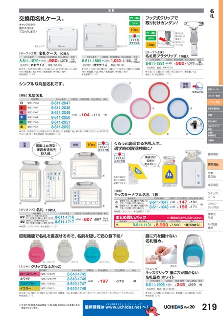 名札学習ペーパークラフト・素材イベント用品学習支援用品保育安全・安心OA・サプライ用品文具・事務用品日用品装飾用品飾式典用品文集・文集・記念品記念品掲示用品掲示用品スタンプ・シールルレクリエーレクリエーション用品運動会動用品品AV関連関連機器機器[オープン工業]名札ケース10枚入お申込番号M価税抜8-611-1879¥1,400名刺サイズ商品種別税抜価格税込価格¥980¥1,078単位1袋(10枚入)型式/NX-105お申込番号M価税抜税抜価格税込価格8-611-1880¥1,500¥1,050¥1,155単位1袋(10枚入)商品種別特大サイズ型式/NX-107●寸法/外寸:103(横)×79(縦)mm、内寸:90(横)×55(縦)mm●質量/5g●色/表裏透明●中紙/あり●包装数:1/10●寸法/外寸:108(横)×91(縦)mm、内寸:97(横)×69(縦)mm●質量/5g●色/表裏透明●中紙/あり●包装数:1/10シンプルな丸型名札です。[西敬]丸型名札商品種別型式/P-6Wお申込番号M価税抜税抜価格税込価格単位型式/P-6P型式/P-6R白赤桃青緑黄●寸法/外径:50mm、中紙:44mm、窓:35mm●質量/8g●材質/本体:スチロール、枠:ポリエチレン、窓:PET●両用金具●包装数:1/108-611-20478-611-20488-611-20498-611-20508-611-20518-611-2052¥104型式/P-6G¥114型式/P-6Y型式/P-6B¥1601枚白緑[オープン工業]名札用プラクリップ10個入お申込番号M価税抜8-611-1881¥1,400商品種別型式/NX-13-GY税抜価格税込価格¥980¥1,078単位1袋(10個入)●寸法/31幅)×11奥)×55高)mm●質量/4g●色/灰●包装数:1/10赤両用金具桃青黄裏名札フック式クリップで取り付けカンタン!10枚入10個入取り付け・取り外しが簡単で外れにくいフック式名刺サイズ90mm97mm特大サイズ69mm55mm交換用名札ケース。チャック付きで雨やホコリをブロックします!横書10枚入くるっと裏返せる名札入れ。通学時の防犯対策に!裏返せば名前が見えない!中紙の裏面に個人の情報を記載できます。360°回転します[西敬]キッズターナブル名札1枚商品種別中紙サイズ/42(横)×67(縦)mm、寸法/53横)×105縦)mm中紙サイズ/54(横)×70(縦)mm、寸法/65横)×110縦)mm小大●材質/オレフィン●包装数:1/10お申込番号8-611-10478-611-1048M価税抜¥180¥190税抜価格¥147¥156税込価格¥161¥171単位1枚まとめ買いパック小8-611-1131お申込番号商品種別※1組単位申込。税抜価格¥6,900税込価格¥7,590単位1組(50枚入)表裏M価税抜税抜価格税込価格単位¥700¥607¥6671セット(10枚入)裏面は血液型・保護者連絡先記入欄。縦書表裏[オリオンズ]名札10枚入商品種別お申込番号寸法/45(横)×85縦)mm、型式/20-99118-611-1716寸法/73(横)×60縦)mm、型式/20-99128-611-1717縦型中紙サイズ/38横)×63縦)mm、横型中紙サイズ/63横)×40縦)mm、●材質/カバー:PVC●包装数:1/10回転機能で名札を裏返せるので、名前を隠して安心登下校!服に穴を開けない名札留め。ローズピンクホワイトスカイブルーイエロー[ミツヤ]クリップなふだっこ商品種別お申込番号M価税抜税抜価格税込価格単位型式/CNK-PK型式/CNK-WHローズピンクホワイトスカイブルーイエロー●寸法/22(幅)×17(奥)×32(高)mm●質量/4g●材質/ポリカーボネート、ポリアセタール、ポリエーテルサルホン●包装数:1/58-610-17458-610-17468-610-17478-610-1748¥197型式/CNK-BU型式/CNK-YL¥216¥3201個※カタログに掲載の商品情報(仕様・価格・税率など)は変更になる場合がございます。最新情報はUCHIDASww.uchidas.netw使用例[ソニック]キッズクリップ服に穴が開かない名札留めホワイトお申込番号8-611-1908M価税抜¥330税抜価格¥245税込価格¥269単位1個商品種別型式/SK-2138-W●寸法/22横)×33縦)mm●質量/4g●材質/ABS●包装数:1/5へ!Vol.20219