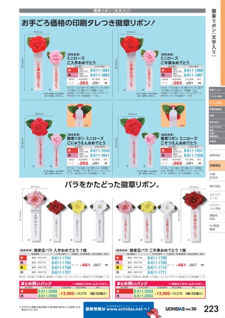章リボン(文字入り)学習ペーパークラフト・素材イベント用品学習支援用品保育安全・安心OA・サプライ用品文具・事務用品日用品装飾用品飾式典用品文集・文集・記念品記念品掲示用品掲示用品スタンプ・シールルレクリエーレクリエーション用品運動会動用品品AV関連関連機器機器[銀鳥産業]ミニローズご卒業おめでとう商品種別赤桃M価税抜オープン型式/459-744型式/459-745税抜価格¥265お申込番号8-611-18868-611-1887税込価格¥291単位1個約150mm[銀鳥産業]ミニローズご入学おめでとう商品種別赤桃M価税抜オープン型式/459-741型式/459-742税抜価格¥265お申込番号8-611-18848-611-1885税込価格¥291単位1個赤桃※文字の書体・色は写真の通りで変更はできません。●寸法/150(縦)×45(横)mm、タレ部分:150縦)×25横)mm●質量/25g●材質/バラ・葉:テトロン、タレ:アセテート●安全ピン付●包装数:1/100赤桃※文字の書体・色は写真の通りで変更はできません。●寸法/150(縦)×45(横)mm、タレ部分:150縦)×25横)mm●質量/25g●材質/バラ・葉:テトロン、タレ:アセテート●安全ピン付●包装数:1/100約45mm約45mm(裏面)(裏面)(裏面)約150mm約150mm[銀鳥産業]徽章リボンミニローズごそつえんおめでとう商品種別赤桃M価税抜オープン型式/459-073型式/459-750税抜価格¥265お申込番号8-611-15578-611-1558税込価格¥291単位1個●寸法/150(縦)×45(横)mm●質量/25g●材質/バラ・葉:テトロン、タレ:アセテート●安全ピン付●包装数:1/100赤桃※文字の書体・色は写真の通りで変更はできません。約150mm[銀鳥産業]徽章リボンミニローズごにゅうえんおめでとう商品種別赤桃M価税抜オープン型式/459-738型式/459-739税抜価格¥265お申込番号8-611-16408-611-1641税込価格¥291単位1個●寸法/150(縦)×45横)mm●質量/25g●材質/バラ・葉:テトロン、タレ:アセテート●安全ピン付●包装数:1/100約140mmバラをかたどった徽章リボン。約70mm赤桃※文字の書体・色は写真の通りで変更はできません。約70mm約25mm約140mm徽章リボン(文字入り)お手ごろ価格の印刷タレつき徽章リボン!約45mm約45mm桃赤黄白桃黄白赤[銀鳥産業]徽章豆バラ入学おめでとう1個商品種別型式/459-700お申込番号M価税抜税抜価格税込価格単位型式/459-701赤桃黄白●寸法/140(縦)×70横)mm●材質/バラ・葉:レーヨン、タレ:アセテート●安全ピン付●包装数:1/328-611-17048-611-17058-611-17068-611-1707¥461型式/459-702型式/459-703¥507オープン1個[銀鳥産業]徽章豆バラご卒業おめでとう1個商品種別型式/459-704お申込番号M価税抜税抜価格税込価格単位型式/459-705赤桃黄白●寸法/140(縦)×70(横)mm●材質/バラ・葉:レーヨン、タレ:アセテート●安全ピン付●包装数:1/328-611-17088-611-17098-611-17108-611-1711¥461型式/459-706型式/459-707¥507オープン1個まとめ買いパック商品種別お申込番号8-611-20898-611-2090赤桃※1組単位申込。税抜価格税込価格単位¥13,980¥15,3781組(32個入)まとめ買いパック商品種別お申込番号8-611-20938-611-2094赤桃※1組単位申込。税抜価格税込価格単位¥13,980¥15,3781組(32個入)※カタログに掲載の商品情報(仕様・価格・税率など)は変更になる場合がございます。最新情報はUCHIDASww.uchidas.netwへ!Vol.20223