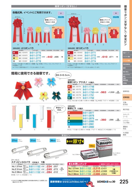 章リボン(文字なし)・安全ピン学習ペーパークラフト・素材イベント用品学習支援用品保育安全・安心OA・サプライ用品文具・事務用品日用品装飾用品飾式典用品文集・文集・記念品記念品掲示用品掲示用品スタンプ・シールルレクリエーレクリエーション用品運動会動用品品AV関連関連機器機器中クリップ付裏面にクリップ、安全ピン付き。裏面徽章リボン(文字なし)小クリップ付約90mm約205mm35mm裏面にクリップ、安全ピン付き。裏面各種式典、イベントにご利用できます。約180mm25mm約75mm赤桃黄白赤桃黄白[銀鳥産業]小リボンバラ商品種別型式/459-878お申込番号M価税抜税抜価格税込価格単位型式/459-880型式/459-8798-611-37758-611-37768-611-37778-611-3778赤桃黄白●寸法/180(縦)×75(横)mm●質量/8g●材質/バラ:レーヨン、タレ:アセテート●包装数:1/20※バラだけで使用可能なので、バラとタレは別にしています。¥442型式/459-881¥486¥6501個[銀鳥産業]中リボンバラ商品種別型式/459-805お申込番号M価税抜税抜価格税込価格単位型式/459-807型式/459-8068-611-37718-611-37728-611-37738-611-3774赤桃黄白●寸法/205(縦)×90(横)mm●質量/12g●材質/バラ:レーヨン、タレ:アセテート●包装数:1/12※バラだけで使用可能なので、バラとタレは別にしています。¥610型式/459-808¥671¥9001個簡易に使用できる徽章です。約6.5×6.5cm。[銀鳥産業]徽章リボンアケボノ10個入商品種別型式/459-791お申込番号M価税抜税抜価格税込価格単位型式/459-793型式/459-792赤桃黄水緑●寸法/約65(縦)×65(横)×10厚)mm●質量/30g●材質/アセテート●包装数:1/2008-611-17488-611-17498-611-17508-611-17518-611-1752¥963¥1,059型式/459-794型式/459-795¥1,2001袋(10個入)[銀鳥産業]徽章ビラ10個入商品種別お申込番号M価税抜税抜価格税込価格単位赤桃黄緑水白●寸法/110(縦)×25(横)mm●材質/アセテート●安全ピン付●包装数:1/108-611-20778-611-20788-611-20798-611-20808-611-20818-611-2082¥360¥396¥5001組(10個入)安全ピンほぼ原寸100本入No.338mmNo.338mm10箱入桃水赤黄緑約25mm安全ピン付き。約110mm桃緑白黄水赤27mmNo.127mm31mmNo.231mm38mmNo.338mmmm72mm13[マーゼン]スナッピン小口バラ商品種別100本入お申込番号No.127mmNo.231mmNo.338mm●材質/スチール●包装数:1/10型式/385-008型式/385-009型式/385-0108-611-11508-611-11518-611-1152mm831箱M価税抜¥330¥350¥400税抜価格¥234¥249¥284税込価格¥257¥273¥312単位(100本1箱入)商品種別お申込番号まとめ買いパックNo.127mmNo.231mmNo.338mm8-611-11538-611-11548-611-1155※1組単位申込。税抜価格税込価格¥2,210¥2,431¥2,353¥2,588¥2,686¥2,954単位1組(100本入×10箱)※カタログに掲載の商品情報(仕様・価格・税率など)は変更になる場合がございます。最新情報はUCHIDASww.uchidas.netwへ!Vol.20225