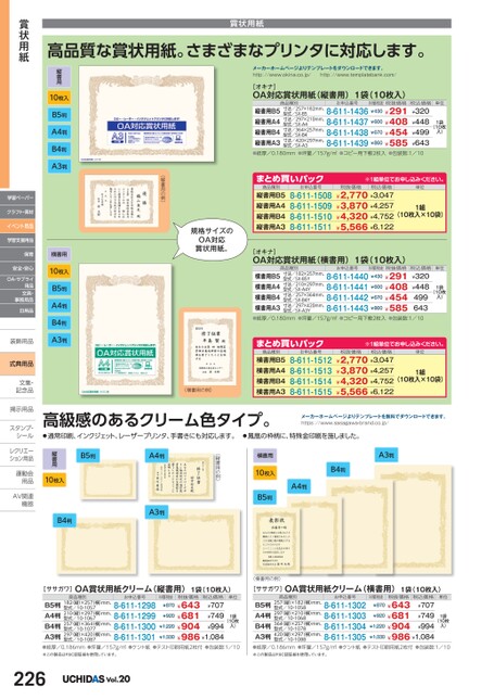 メーカーホームページよりテンプレートをダウンロードできます。http://www.okina.co.jp/http://www.templatebank.com/[オキナ]OA対応賞状用紙(縦書用)1袋(10枚入)お申込番号M価税抜税抜価格単位商品種別縦書用B5縦書用A4縦書用B4縦書用A3●紙厚/0.180mm●坪量/157g/㎡●コピー用下敷2枚入●包装数:1/10寸法/257×182mm、型式/SX-B5寸法/297×210mm、型式/SX-A4寸法/364×257mm、型式/SX-B4寸法/420×297mm、型式/SX-A38-611-14368-611-14378-611-14388-611-1439¥430¥291¥600¥408¥670¥454¥860¥585税込価格¥320¥448¥499¥6431袋(10枚入)商品種別お申込番号まとめ買いパック縦書用B5縦書用A4縦書用B4縦書用A38-611-15088-611-15098-611-15108-611-1511税抜価格税込価格¥2,770¥3,047¥3,870¥4,257¥4,320¥4,752¥5,566¥6,122※1組単位申込。単位1組(10枚入×10袋)[オキナ]OA対応賞状用紙(横書用)1袋(10枚入)お申込番号M価税抜税抜価格単位商品種別横書用B5横書用A4横書用B4横書用A3●紙厚/0.180mm●坪量/157g/㎡●コピー用下敷2枚入●包装数:1/10寸法/182×257mm、型式/SX-B5Y寸法/210×297mm、型式/SX-A4Y寸法/257×364mm、型式/SX-B4Y寸法/297×420mm、型式/SX-A3Y8-611-14408-611-14418-611-14428-611-1443¥430¥291¥600¥408¥670¥454¥860¥585税込価格¥320¥4484996431袋(10枚入)商品種別お申込番号まとめ買いパック横書用B5横書用A4横書用B4横書用A38-611-15128-611-15138-611-15148-611-1515税抜価格税込価格¥2,770¥3,047¥3,870¥4,257¥4,320¥4,752¥5,566¥6,122※1組単位申込。単位1組(10枚入×10袋)規格サイズのOA対応賞状用紙。(縦書用の例)(横書用の例)高品質な賞状用紙。さまざまなプリンタに対応します。賞状用紙高級感のあるクリーム色タイプ。●通常印刷、インクジェット、レーザープリンタ、手書きにも対応します。●鳳凰の枠柄に、特殊金印刷を施しました。メーカーホームページよりテンプレートを無料でダウンロードできます。https://www.sasagawa-brand.co.jp/A3判B4判A4判横書用10枚入B5判(縦書用の例)B5判A4判A3判縦書用10枚入B4判[ササガワ]OA賞状用紙クリーム(縦書用)1袋(10枚入)M価税抜商品種別税抜価格お申込番号型式/10-1067型式/10-1057B5判182(縦)×257(横)mm、A4判210(縦)×297(横)mm、B4判257(縦)×364(横)mm、A3判297(縦)×420(横)mm、●紙厚/0.186mm●坪量/157g/㎡●ケント紙●テスト印刷用紙2枚付●包装数:1/10※この製品はFSC認証紙を使用しています。税込価格¥870¥643¥707¥920¥681¥749¥1,220¥904¥994¥1,330¥986¥1,0848-611-12988-611-12998-611-13008-611-13011袋(10枚入)型式/10-1077型式/10-1087単位226Vol.20(横書用の例)[ササガワ]OA賞状用紙クリーム(横書用)1袋(10枚入)M価税抜商品種別税抜価格お申込番号型式/10-1068型式/10-1058B5判257縦)×182横)mm、A4判297縦)×210横)mm、B4判364縦)×257横)mm、A3判420縦)×297横)mm、●紙厚/0.186mm●坪量/157g/㎡●ケント紙●テスト印刷用紙2枚付●包装数:1/10※この製品はFSC認証紙を使用しています。税込価格¥870¥643¥707¥920¥681¥749¥1,220¥904¥994¥1,330¥986¥1,0848-611-13028-611-13038-611-13048-611-13051袋(10枚入)型式/10-1078型式/10-1088単位縦書用10枚入B5判A4判B4判A3判学習ペーパークラフト・素材イベント用品学習支援用品保育横書用賞状用紙10枚入B5判A4判B4判A3判安全・安心OA・サプライ用品文具・事務用品日用品装飾用品装飾用式典用品文集・文集・記念品記念品掲示用品掲示用品スタンプ・シールシールレクリエーレクリエーション用品運動会運動会用品用品AV関連AV関連機器機器